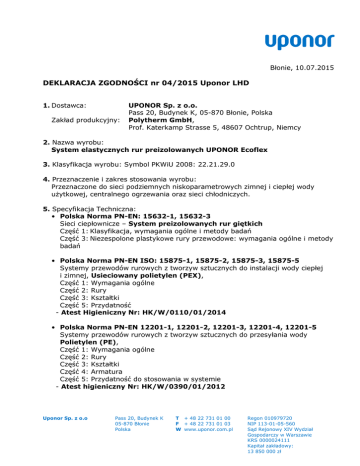 Błonie, 10.07.2015 DEKLARACJA ZGODNOŚCI nr 04/2015 Uponor LHD 1. Dostawca: Zakład produkcyjny: UPONOR Sp. z o.o. Pass 20, Budynek K, 05-870 Błonie, Polska Polytherm GmbH, Prof. Katerkamp Strasse 5, 48607 Ochtrup, Niemcy 2. Nazwa wyrobu: System elastycznych rur preizolowanych UPONOR Ecoflex 3. Klasyfikacja wyrobu: Symbol PKWiU 2008: 22.21.29.0 4. Przeznaczenie i zakres stosowania wyrobu: Przeznaczone do sieci podziemnych niskoparametrowych zimnej i ciepłej wody użytkowej, centralnego ogrzewania oraz sieci chłodniczych. 5. Specyfikacja Techniczna: • Polska Norma PN-EN: 15632-1, 15632-3 Sieci ciepłownicze – System preizolowanych rur giętkich Część 1: Klasyfikacja, wymagania ogólne i metody badań Część 3: Niezespolone plastykowe rury przewodowe: wymagania ogólne i metody badań • Polska Norma PN-EN ISO: 15875-1, 15875-2, 15875-3, 15875-5 Systemy przewodów rurowych z tworzyw sztucznych do instalacji wody ciepłej i zimnej, Usieciowany polietylen (PEX), Część 1: Wymagania ogólne Część 2: Rury Część 3: Kształtki Część 5: Przydatność - Atest Higieniczny Nr: HK/W/0110/01/2014 • Polska Norma PN-EN 12201-1, 12201-2, 12201-3, 12201-4, 12201-5 Systemy przewodów rurowych z tworzyw sztucznych do przesyłania wody Polietylen (PE), Część 1: Wymagania ogólne Część 2: Rury Część 3: Kształtki Część 4: Armatura Część 5: Przydatność do stosowania w systemie - Atest higieniczny Nr: HK/W/0390/01/2012 Uponor Sp. z o.o Pass 20, Budynek K 05-870 Błonie Polska T + 48 22 731 01 00 F + 48 22 731 01 03 W www.uponor.com.pl Regon 010979720 NIP 113-01-05-560 Sąd Rejonowy XIV Wydział Gospodarczy w Warszawie KRS 0000024111 Kapitał zakładowy: 13 850 000 zł • Polska Norma PN-EN ISO 6509-1:2014-08 Korozja metali i stopów - Określanie odporności stopów miedzi z cynkiem na odcynkowanie - Część 1: Metoda badania 6. Deklarowane cechy techniczne wyrobu- szereg wymiarowy: • Rury Uponor Ecoflex Thermo Single Rura przewodowa/osłonowa [mm]: - 25x2,3/140 - 32x2,9/140 - 40x3,7/175 - 50x4,6/175 - 63x5,8/175 - 75x6,8/200 - 90x8,2/200 - 110x10,0/200 - 125x11,4/250 • Rury Uponor Ecoflex Thermo Twin Rura przewodowa/osłonowa [mm]: - 2X 25x2,3/175 - 2X 32x2,9/175 - 2X 40x3,7/175 - 2X 50x4,6/200 - 2X 63x5,8/200 • Rury Uponor Ecoflex Thermo Mini Rura przewodowa/osłonowa [mm]: - 25x2,3/68 - 32x2,9/68 • Rury Uponor Ecoflex Varia Single Rura przewodowa/osłonowa [mm]: - 25x2,3/90 - 32x2,9/90 - 40x3,7/140 - 50x4,6/140 - 63x5,8/140 - 75x6,8/175 - 90x8,2/175 - 110x10,0/175 - 125x11,4/200 • Rury Uponor Ecoflex Varia Twin Rura przewodowa/osłonowa [mm]: - 2X 25x2,3/140 - 2X 32x2,9/140 - 2X 40x3,7/140 - 2X 50x4,6/175 2 • Rury Uponor Ecoflex Aqua Single Rura przewodowa/osłonowa [mm]: - 25x3,5/140 - 32x4,4/140 - 40x5,5/175 - 50x6,9/175 - 63x8,7/175 - 75x10,3/200 - 90x12,3/200 - 110x15,1/200 • Rury Uponor Ecoflex Aqua Single z kablem grzewczym Rura przewodowa/osłonowa [mm]: - 25x3,5/140 - 32x4,4/140 - 40x5,5/175 - 50x6,9/175 - 63x8,7/175 - 75x10,3/200 - 90x12,3/200 - 110x15,1/200 • Rury Uponor Ecoflex Aqua Twin Rura przewodowa/osłonowa [mm]: - 25x3,5+25x3,5/175 - 32x4,4+25x3,5/175 - 40x5,5+25x3,5/175 - 50x6,9+25x3,5/175 - 40x5,5+32x4,4/175 - 50x6,9+32x4,4/175 - 50x6,9+40x5,5/200 - 50x6,9+50x6,9/200 • Rury Uponor Ecoflex Aqua Midi Single Rura przewodowa/osłonowa [mm]: - 40x5,5/140 - 50x6,9/140 - 63x8,7/140 - 75x10,3/175 - 90x12,3/175 - 110x15,1/175 • Rury Uponor Ecoflex Aqua Midi Twin Rura przewodowa/osłonowa [mm]: - 40x5,5+25x3,5/140 - 40x5,5+32x4,4/140 - 50x6,9+32x4,4/140 - 50x6,9+40x5,5/175 3 • Rury Uponor Ecoflex Quattro Rura przewodowa/osłonowa [mm]: - 2X 25x2,3+2X 25x3,5/175 - 2X 32x2,9+2X 25x3,5/175 - 2X 32x2,9+32x4,4+25x3,5/175 - 2X 32x2,9+2X 32x4,4/175 - 2X 40x3,7+2X 40x5,5/200 • Rury Uponor Ecoflex Supra Rura przewodowa/osłonowa [mm]: - 25x2,3/68 - 32x2,9/68 - 40x3,7/140 - 50x4,6/140 - 63x5,8/140 - 75x6,8/175 - 90x8,2/175 - 110x10,0/200 • Rury Uponor Ecoflex Supra Plus Rura przewodowa/osłonowa [mm]: - 25x2,3/68 - 32x2,9/68 - 40x3,7/140 - 50x4,6/140 - 63x5,8/140 - 75x6,8/175 - 90x8,2/175 - 110x10,0/200 Złączki dla rur przewodowych Uponor PE-X i PE100 (zgodne dodatkowo z normą PNEN 15875-3 i PN-EN ISO 6509-1:2014-08): • Złączki Uponor Wipex - złączki Uponor Wipex PN6 mosiądz: średnice 25-125 mm - złączki Uponor Wipex PN10 mosiądz: średnice 25-110 mm - złączki Uponor Wipex mosiądz: średnice 1”, 1 ¼”, 2”, 3”, 4” (25-125 mm) • Złączki Uponor Q&E - złączki Uponor Q&E mosiądz: średnice 9,9-75 mm - złączki Uponor Q&E mosiądz gwintowane: średnice 16-75 mm - złączki Uponor Q&E PPSU: średnice 16-75 mm - złączki Uponor Q&E PPSU gwintowane: średnice 16-25 mm Akcesoria: • Akcesoria Uponor Ecoflex (zgodne z normą PN-EN 15875-3 i PN-EN 489:2009) - końcówki gumowe i termokurczliwe Uponor Ecoflex - zestawy izolacyjne Uponor Ecoflex - rękawy ścienne PWP i NWP oraz cement.-fibrowe PWP Uponor Ecoflex 4 7. Nazwa i numer akredytowanej jednostki certyfikującej lub laboratorium oraz numer certyfikatu lub numer raportu z badań typu, jeżeli taka jednostka brała udział w zastosowanym systemie oceny zgodności wyrobu budowlanego. W/w punkt nie dotyczy wyrobów Uponor. Deklarujemy z pełną odpowiedzialnością, że wyroby określone w pkt. 6 są zgodne ze specyfikacją techniczną wskazaną w pkt. 5. Pass, 10.07.2015 Piotr Serafin Application Manager 5