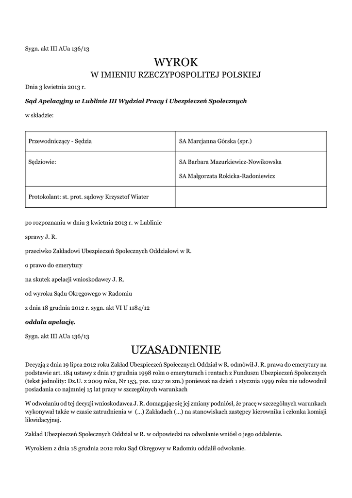 Sygn. akt III AUa 136/13 WYROK W IMIENIU RZECZYPOSPOLITEJ POLSKIEJ Dnia 3 kwietnia 2013 r. Sąd Apelacyjny w Lublinie III Wydział Pracy i Ubezpieczeń Społecznych w składzie: Przewodniczący - Sędzia SA Marcjanna Górska (spr.) Sędziowie: SA Barbara Mazurkiewicz-Nowikowska SA Małgorzata Rokicka-Radoniewicz Protokolant: st. prot. sądowy Krzysztof Wiater po rozpoznaniu w dniu 3 kwietnia 2013 r. w Lublinie sprawy J. R. przeciwko Zakładowi Ubezpieczeń Społecznych Oddziałowi w R. o prawo do emerytury na skutek apelacji wnioskodawcy J. R. od wyroku Sądu Okręgowego w Radomiu z dnia 18 grudnia 2012 r. sygn. akt VI U 1184/12 oddala apelację. Sygn. akt III AUa 136/13 UZASADNIENIE Decyzją z dnia 19 lipca 2012 roku Zakład Ubezpieczeń Społecznych Oddział w R. odmówił J. R. prawa do emerytury na podstawie art. 184 ustawy z dnia 17 grudnia 1998 roku o emeryturach i rentach z Funduszu Ubezpieczeń Społecznych (tekst jednolity: Dz.U. z 2009 roku, Nr 153, poz. 1227 ze zm.) ponieważ na dzień 1 stycznia 1999 roku nie udowodnił posiadania co najmniej 15 lat pracy w szczególnych warunkach W odwołaniu od tej decyzji wnioskodawca J. R. domagając się jej zmiany podniósł, że pracę w szczególnych warunkach wykonywał także w czasie zatrudnienia w (...) Zakładach (...) na stanowiskach zastępcy kierownika i członka komisji likwidacyjnej. Zakład Ubezpieczeń Społecznych Oddział w R. w odpowiedzi na odwołanie wniósł o jego oddalenie. Wyrokiem z dnia 18 grudnia 2012 roku Sąd Okręgowy w Radomiu oddalił odwołanie. Sąd pierwszej instancji ustalił, że J. R. urodzony (...) w dniu 9 lipca 2012 r. złożył wniosek o przyznanie mu prawa do emerytury. Organ rentowy uznał za udowodniony na dzień 1 stycznia 1999 roku ogólny okres ubezpieczenia w wymiarze 28 lat, 2 miesięcy i 17 dni, w tym 7 lat i 4 miesiące pracy w warunkach szczególnych. Za pracę w szczególnych warunkach uznał zatrudnienie wnioskodawcy w okresie od 1 czerwca 1976 r. do 30 września 1983 r. w (...) Zakładach (...) na stanowisku mistrza. Jako pracy wykonywanej w warunkach szczególnych organ rentowy nie uwzględnił natomiast okresu zatrudnienia w tym zakładzie od 1 października 1983 r. do 30 czerwca 1992 r. Sąd pierwszej instancji stwierdził, że J. R. był zatrudniony w (...) Zakładach (...) od 1 grudnia 1973 roku do 30 czerwca 1992 r. Został przyjęty na stanowisko montera samochodów w dziale głównego mechanika. Do maja 1974 roku wnioskodawca brał udział w montowaniu urządzeń w nowym budynku hali napraw, gdzie nie było jeszcze produkcji. Od 1 marca 1974 roku pracował na stanowisku mechanika napraw pojazdów samochodowych transportu wewnętrznego. Naprawiał w warsztacie pojazdy: Ż. , N., dwa K., dwa S. i dwa dźwigi samochodowe. Wymieniał olej, sprawdzał płyn hamulcowy, chłodzący, regulował hamulce, gaźniki. W warsztacie pracowało 3 mechaników i były tam 3 kanały remontowe. Wnioskodawca jedynie część prac wykonywał w kanałach. Pracował 8 godzin dziennie, z tego w kanałach pracował czasem cały dzień a czasem tylko 3 godziny, w zależności od potrzeby. Po odbyciu szkolenia naprawy autobusów w (...) Zakładach (...) został z dniem 1 lutego 1975 r. przeniesiony na stanowisko mistrza wydziału PA. Wydział ten wykonywał remonty i obsługę autobusów. W jego skład wchodziły oddziały: demontażu, naprawy szkieletu nadwozia, spawalnia, montażu wstępnego podzespołów, stolarnia, naprawy i regeneracja chłodnic, naprawy siedzeń i tłumików, naprawy instalacji hydraulicznej i pneumatycznej, naprawy ogumienia. Wnioskodawca był mistrzem montażu wstępnego podzespołów. Podlegało mu 20 pracowników na stanowisku mechaników i 2 spawaczy. Nadzorował prace mechaników w kanałach oraz na ciągach technologicznych, co polegało na tym, że autobus był umieszczany na wózkach technologicznych na wysokości 1,5 m nad ziemią i w ten sposób naprawiany, wózki stały na torach. Była to praca odpowiadająca pracy w kanałach. Nadzorował też stolarzy, którzy układali podłogi w autobusach. Zasadnicze stanowiska były to jednak stanowiska mechaników. Od 1 października 1983 roku J. R. objął stanowisko zastępcy kierownika wydziału (...) Podlegali mu wszyscy pracownicy tego wydziału w liczbie do 120, na stanowiskach spawaczy, mechaników samochodowych, stolarzy, lakierników. Miejsce pracy wnioskodawcy znajdowało się w kantorze między spawalnią a montażem wstępnym. Bezpośrednio podlegali mu wszyscy mistrzowie. J. R. kontrolował prace na odcinkach: demontażu wstępnego i głównego gdzie odbywał się demontaż podwozia i nadwozia. Nie było tam kanałów remontowych, samochody były ustawiane na podnośnikach. Pracownicy demontowali części z pomocą kluczy, odcinali części palnikiem. Pracowali tam mechanicy i spawacze. Wnioskodawca udzielał wskazówek mistrzowi, pytał o frekwencję pracowników, sporadycznie sprawdzał prace pracowników fizycznych. Na spawalni brał udział w komisji decydującej o zakresie napraw, wyrywkowo sprawdzał jakość wykonanych napraw. W blacharni gdzie pracowali blacharze i spawacze sprawdzał wyrywkowo jakość wykonanych elementów. Na lakierni podwozi odbywały się prace antykorozyjne. Wnioskodawca sprawdzał wyrywkowo jakość tych prac, utrzymywał kontakty z mistrzem. Na odcinku montażu wstępnego, gdzie odbywał się montaż podzespołów podwozia i gdzie wcześniej był mistrzem wnioskodawca schodził do kanałów remontowych z kontrolerem jakości. Tam pracował około godziny przy odbiorze końcowym. Sprawdzał również podwozia zamontowane na wózkach technologicznych. Kilka razy dziennie kontrolował stanowiska naprawy chłodnic i chłodniczek, gdzie pracowali spawacze. Na odcinku naprawy szkieletów siedzeń, gdzie pracowali spawacze, wyrywkowo sprawdzał jakość prac, zlecał mistrzowi przyspieszenie produkcji. Na odcinku naprawy tłumików, rur wydechowych, rur wodnych oraz instalacji pneumatyczn