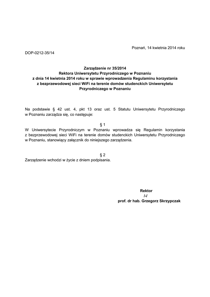 Poznań, 14 kwietnia 2014 roku DOP-0212-35/14 Zarządzenie nr 35/2014 Rektora Uniwersytetu Przyrodniczego w Poznaniu z dnia 14 kwietnia 2014 roku w sprawie wprowadzenia Regulaminu korzystania z bezprzewodowej sieci WiFi na terenie domów studenckich Uniwersytetu Przyrodniczego w Poznaniu Na podstawie § 42 ust. 4, pkt 13 oraz ust. 5 Statutu Uniwersytetu Przyrodniczego w Poznaniu zarządza się, co następuje: §1 W Uniwersytecie Przyrodniczym w Poznaniu wprowadza się Regulamin korzystania z bezprzewodowej sieci WiFi na terenie domów studenckich Uniwersytetu Przyrodniczego w Poznaniu, stanowiący załącznik do niniejszego zarządzenia. §2 Zarządzenie wchodzi w Ŝycie z dniem podpisania. Rektor /-/ prof. dr hab. Grzegorz Skrzypczak Załącznik do zarządzenia nr 35/2014 Rektora z 14 kwietnia 2014 roku w sprawie wprowadzenia Regulaminu korzystania z sieci WIFi w domach studenckich UP w Poznaniu Regulamin korzystania z bezprzewodowej sieci WiFi na terenie domów studenckich Uniwersytetu Przyrodniczego w Poznaniu §1 1. Sieć bezprzewodowa, zwana dalej siecią WiFi UP jest siecią komputerową słuŜącą do bezprzewodowego i darmowego dostępu do Internetu na terenie budynków Uniwersytetu Przyrodniczego w Poznaniu. 2. Do korzystania z sieci WiFi UP uprawnieni są pracownicy, studenci oraz goście Uniwersytetu Przyrodniczego w Poznaniu. §2 1. Do podłączenia z siecią WiFi UP wymagane jest posiadanie urządzenia z interfejsem sieci bezprzewodowej zgodnym ze standardem IEEE 802.11a/b/g/n pracującym w paśmie ISM 2,4GHz lub 5GHz. 2. W celu uzyskania połączenia z siecią bezprzewodową naleŜy wybrać identyfikator sieci SSID. Rozgłaszane są trzy identyfikatory: UPPOZ_wifi, UPPOZ_sec, eduroam. Sieci te róŜnią się sposobem uwierzytelniania. 3. Dostęp do sieci wymaga uwierzytelnienia uŜytkownika. Uwierzytelnienie odbywa się przez wprowadzenie nazwy uŜytkownika i hasła podczas logowania do sieci. 4. Uwierzytelnianie w sieci o SSID eduroam odbywa się zgodnie z zasadami Polskiej Polityki eduroam http://www.eduroam.pl/polityka. 5. Przyłączenie się uŜytkownika do sieci oznacza akceptację niniejszych warunków korzystania z sieci. 6. Przyłączenie uŜytkowników do sieci WiFi UP jest rejestrowane. §3 1. UŜytkownik sieci WiFi UP zobowiązuje się do: a) wykorzystywania sieci wyłącznie do działań zgodnych z prawem; b) przesyłania i udostępniania treści, które nie naruszają prawa i nie są przedmiotem ochrony własności intelektualnej nie naleŜącej do uŜytkownika; c) nie przesyłania i nie udostępniania treści mogących naruszyć czyjeś dobra osobiste; d) nie wykorzystywania dostępu w celu masowego rozsyłania treści reklamowych; e) nie rozpowszechniania wirusów komputerowych mogących uszkodzić komputery innych uŜytkowników sieci; f) stałej kontroli antywirusowej swojego komputera; g) niezwłocznego zgłaszania administratorowi uszkodzenia sprzętu sieciowego WiFi UP; h) chronić swoje zasoby poprzez stosowanie nietrywialnych haseł zabezpieczających, okresową ich zmianę oraz ochronę tych haseł przed osobami postronnymi. 2. UŜytkownikowi sieci WiFi UP zabrania się: a) omijania zabezpieczeń stosowanych w dostępie do sieci; b) wykonywania wszelkich działań, które są uznawane za potencjalnie niebezpieczne dla funkcjonowania sieci; c) wykonywania wszelkich działań, które mogą destabilizować pracę innych uŜytkowników sieci; 3. UŜytkownik naruszający powyŜsze zasady moŜe zostać pozbawiony okresowo lub całkowicie dostępu do sieci WiFi UP. §4 UŜytkownik ponosi pełną odpowiedzialność prawną i finansową za szkody spowodowane jego działalnością z uŜyciem sieci oraz za szkody spowodowane w urządzeniach przesyłowych. §5 W sprawach nieuregulowanych niniejszym Regulaminem stosuje się powszechnie obowiązujące w tym zakresie przepisy prawa.