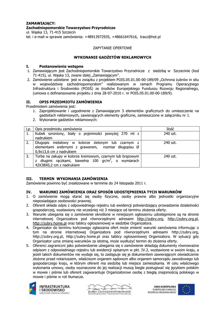 ZAMAWIAJĄCY: Zachodniopomorskie Towarzystwo Przyrodnicze ul. Wąska 13, 71-415 Szczecin tel. i e-mail w sprawie zamówienia: +48913972935, +48661647616, [email protected] ZAPYTANIE OFERTOWE WYKONANIE GADŻETÓW REKLAMOWYCH I. Postanowienia wstępne 1. Zamawiającym jest Zachodniopomorskie Towarzystwo Przyrodnicze z siedzibą w Szczecinie (kod 71-415), ul. Wąska 13, zwane dalej „Zamawiającym”. 2. Zamówienie udzielane jest w związku z projektem POIS.05.01.00-00-189/09 „Ochrona żubrów in situ w województwie zachodniopomorskim” realizowanym w ramach Programu Operacyjnego Infrastruktura i Środowisko (POIiŚ) ze środków Europejskiego Funduszu Rozwoju Regionalnego, (umowa o dofinansowanie projektu z dnia 28-07-2010 r. nr POIS.05.01.00-00-189/9). II. OPIS PRZEDMIOTU ZAMÓWIENIA Przedmiotem zamówienia jest: 1. Zaprojektowanie i uzgodnienie z Zamawiającym 3 elementów graficznych do umieszczenie na gadżetach reklamowych, zawierających elementy graficzne, zamieszczone w załączniku nr 1. 2. Wykonanie gadżetów reklamowych: Lp. 1. 2. 3. Opis przedmiotu zamówienia Kubek szroniony, biały o pojemności powyżej 270 ml z nadrukiem Długopis metalowy w kolorze zielonym lub czarnym z elementami srebrnymi z grawerem, rozmiar długopisu Ø 0,9x13,6 cm z nadrukiem Torba na zakupy w kolorze kremowym, czarnym lub brązowym z długimi rączkami, bawełna 100 gr/m2, o wymiarach 42X38X0,2 cm z nadrukiem Ilość 240 szt. 240 szt. 240 szt. III. TERMIN WYKONANIA ZAMÓWIENIA Zamówienie powinno być zrealizowane w terminie do 24 listopada 2011 r. IV. WARUNKI ZAMÓWIENIA ORAZ SPOSÓB UDOSTĘPNIENIA TYCH WARUNKÓW 1. O zamówienie mogą starać się osoby fizyczne, osoby prawne albo jednostki organizacyjne nieposiadające osobowości prawnej. 2. Oferent składa odpis z odpowiedniego rejestru lub ewidencji potwierdzający prowadzenie działalności gospodarczej, wystawiony nie wcześniej niż 3 miesiące od terminu złożenia oferty. 3. Warunki ubiegania się o zamówienie określone w niniejszym ogłoszeniu udostępnione są na stronie internetowej Organizatora pod równorzędnymi adresami http://zubry.org, http://zubry.org.pl, http://zubry.home.pl oraz tablicy ogłoszeniowej w siedzibie Organizatora. 4. Organizator do terminu końcowego zgłaszania ofert może zmienić warunki zamówienia informując o tym na stronie internetowej Organizatora pod równorzędnymi adresami http://zubry.org, http://zubry.org.pl, http://zubry.home.pl oraz tablicy ogłoszeniowej Organizatora. W sytuacji gdy Organizator uzna zmianę warunków za istotną, może wydłużyć termin do złożenia oferty. 5. Oferenci zagraniczni jako potwierdzenie ubiegania się o zamówienie składają dokumenty równoważne odpisom z odpowiedniego rejestru lub ewidencji opisanym w pkt. IV.2, wystawione w swoim kraju, a jeżeli takich dokumentów nie wydaje się, to zastępuje się je dokumentem zawierającym oświadczenie złożone przed notariuszem, właściwym organem sądowym albo organem samorządu zawodowego lub gospodarczego kraju, w którym oferent ma siedzibę lub miejsce zamieszkania. W celu właściwego wykonania umowy, osoby wyznaczone do jej realizacji muszą biegle posługiwać się językiem polskim w mowie i piśmie lub oferent zagwarantuje Organizatorowi osobę z biegłą znajomością polskiego w mowie i piśmie w roli tłumacza. V. MIEJSCE ORAZ TERMIN SKŁADANIA OFERT Oferta zawierająca wypełniony i podpisany formularz ofertowy (według wzoru stanowiącego załącznik nr 2 do niniejszego zapytania) w formacie pdf lub jpg z ceną brutto wraz z wymaganymi załącznikami, opisanymi w pkt. IV.2 powinna zostać przesłana pocztą elektroniczną w terminie do dnia 27-10-2011 r. na adres [email protected]. Wybór oferty na podstawie zaoferowanej ceny nastąpi dnia 28-10-2011 r., a wszyscy oferenci zostaną powiadomieni za pomocą poczty elektronicznej o dokonanym wyborze. VI. POSTANOWIENIA KOŃCOWE 1. Zamawiający może przeznaczyć na realizację zamówienia 8000 zł brutto. 2. Z wybranym oferentem zostanie podpisana umowa według wzoru, stanowiącego załącznik nr 3 do niniejszego zapytania. Do rozesłania oferentom i publikacji na stronie internetowej Zamawiającego pod równorzędnymi adresami http://zubry.org, http://zubry.org.pl, http://zubry.home.pl dnia 20-10- 2011 r. 1. http://stylreklamy.pl, 82-500 Kwidzyn, ul. Warszawska 7/1, [email protected] 2. http://www.e-gadzet.pl, ul. P. Skargi 60/8, 03-516 Warszawa, [email protected] 3. http://www.mentor-polska.pl, ul. Grunwaldzka 27a, 78-320 Połczyn Zdrój, [email protected] 4. http://bedon.lasy.gov.pl, ul. Sienkiewicza 19, 95-020 Andrespol, [email protected] Zatwierdzam: . Załącznik nr 1 Elementy graficzne do zaprojektowania znaków na kubek, długopis i torbę Projekt POIS.05.01.00-00-189/09 „Ochrona żubrów in situ w województwie zachodniopomorskim” realizowany w ramach Programu Operacyjnego Infrastruktura i Środowisko (POIiŚ) ze środków Europejskiego Funduszu Rozwoju Regionalnego Załącznik nr 2 OFERENT: ZAMAWIAJĄCY: Zachodniopomorskie Towarzystwo Przyrodnicze ul. Wąska 13, 71-415 Szczecin OFERTA na WYKONANIE GADŻETÓW REKLAMOWYCH SKŁADAM OFERTĘ NA WYKONANIE ZAMÓWIENIA ZA CENĘ OFERTOWĄ BRUTTO: …………………………………………. ZŁ słownie zł ………………………………………………………………………………………………… ZAŁĄCZNIKI: ……………………………………………………….. ……………………………………………………….. ……………………………………………………….. ……………………………………………………….. Oświadczam, że: posiadam niezbędną wiedzę i umiejętności do wykonania zamówienia, znajduję się w sytuacji ekonomicznej i finansowej zapewniającej wykonanie zamówienia; zapoznałem(am) się ze wszystkimi warunkami wykonania zamówienia i uwzględniłem(am) wszystkie elementy w cenie ofertowej.