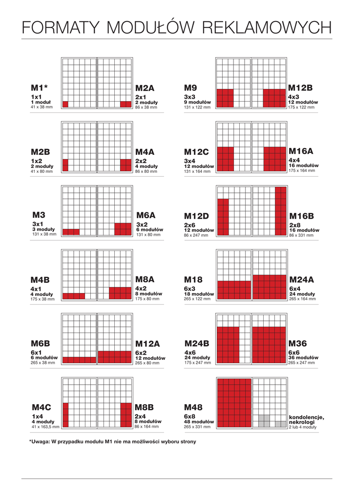 FORMATY MODUŁÓW REKLAMOWYCH M1* M2A M9 M12B 1x1 2x1 3x3 4x3 41 x 38 mm 86 x 38 mm 131 x 122 mm 175 x 122 mm M2B M4A M12C M16A 1x2 2x2 3x4 4x4 41 x 80 mm 86 x 80 mm 131 x 164 mm 175 x 164 mm 1 moduł 2 moduły 2 moduły 4 moduły 9 modułów 12 modułów 12 modułów 16 modułów M3 M6A 3x1 M12D M16B 3x2 2x6 2x8 131 x 80 mm 86 x 247 mm 86 x 331 mm 3 moduły 131 x 38 mm 6 modułów 12 modułów 16 modułów M4B M8A M18 M24A 4x1 4x2 6x3 6x4 175 x 38 mm 175 x 80 mm 265 x 122 mm 265 x 164 mm M6B M12A M24B M36 6x1 6x2 4x6 6x6 265 x 38 mm 265 x 80 mm 175 x 247 mm 265 x 247 mm M4C M8B M48 1x4 2x4 6x8 41 x 163,5 mm 86 x 164 mm 265 x 331 mm 4 moduły 6 modułów 4 moduły 8 modułów 12 modułów 8 modułów 18 modułów 24 moduły 48 modułów *Uwaga: W przypadku modułu M1 nie ma możliwości wyboru strony 24 moduły 36 modułów kondolencje, nekrologi 2 lub 4 moduły