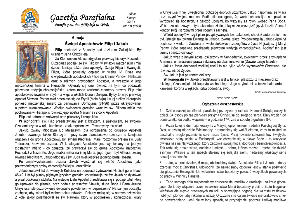 Gazetka Parafialna Parafia p.w. p.w. św. Mikołaja w Wielu Wiele 5 maja 2013 r. Nr 18 (153) 6 maja Święci Apostołowie Filip i Jakub Filip pochodził z Betsaidy nad Jeziorem Galilejskim. Był uczniem Jana Chrzciciela. Za Klemensem Aleksandryjskim pierwszy historyk Kościoła Euzebiusz podaje, że św. Filip był w związku małżeńskim i miał dzieci. Istnieją także dwa apokryfy: Dzieje Filipa i Ewangelia Filipa, które powstały dopiero w wieku IV. Piszą one o wędrówkach apostolskich kich Filipa po krainie Partów i Helladzie oraz o różnych przygodach Apostoła, stoła, a wreszcie o jego męczeńskiej śmierci w Hierapolis. Opierały się one również na tym, co podawała pierwotna tradycja chrześcijańska, zatem mogą zawierać elementy prawdy. Filip miał apostołować również w Scytii - a więc w okolich Donu i Dniepru. Byłby to więc pierwszy Apostoł Słowian. Potem miał przenieść się do Frygii (Mała Azja) i w jej stolicy, Hierapolis, ponieść męczeńską śmierć za panowania Domicjana (81-96) 96) przez ukrzyżowanie ukrzyżowanie, a potem ukamienowanie. Według świadectw greckich wraz ze św św. Filipem miała być pochowana w Hierapolis również jego siostra Marianna i 2 córki Apostoła. Filip jest patronem Antwerpii oraz pilśniarzy i czapników. W ikonografii św. Filip przedstawiany jest z krzyżem, z pastorałem, ze zwojem. Czasami trzyma w ręku kamienie - znak męczeństwa. Towarzyszy mu anioł. Jakub, zwany Młodszym lub Mniejszym (dla odróżnienia od drugiego Apostoła Jakuba, zwanego także Starszym - przy czym starszeństwo oznacza tu kolejno kolejność włączenia do grona Apostołów), był synem Kleofasa i Marii, rodzonym bratem św. Judy Tadeusza, krewnym Jezusa. W katalogach Apostołów łów jest wymieniany na jednym z ostatnich miejsc - co oznacza, że przyłączył się do grona Apostołów najpóźniej. Pochodził z Nazaretu. Jego matka miała na imię Maria, jego ojcem był Alfeusz, zwany również Kleofasem. Jakub Młodszy i św. Juda mieli jeszcze jednego brata, Józefa. Po zmartwychwstaniu Jezusa Jakub wyróżniał się wśród Apostołów jako przewodniczący gminy chrześcijańskiej w Jerozolimie. Jakub zostawił list do wiernych Kościoła narodowości żydowskiej. Napisał go w latach 45-49. List był pisany pięknym językiem greckim, co wskazuje, że św. Jakub go dyktował, a pisał doskonały stylista. Na wstępie Listu Apostoł przedstawia się i podaje tytuł, który go uprawnia do pisania, oraz podaje adresatów: "Jakub, sługa Boga i Pana Jezusa Chrystusa, śle pozdrowienie dwunastu pokoleniom om w rozproszeniu" Na samym początku zachęca, aby wierni byli wobec pokus odważni. Pokusy rodzą się w samym człowieku. Z kolei jakby polemizował ze św. Pawłem, który w podkreśleniu konieczności wiary w Chrystusa mniej uwzględniał potrzebę dobrych uczynków. uczynkó Jakub napomina, że wiara bez uczynków jest martwa.. Podkreśla następnie, że wśród chrześcijan nie powinno wyróżniać się bogatych, a gardzić ubogimi, bo wszyscy wszy są równi wobec Pana Boga. W bardzo obrazowym stylu akcentuje złość, jaką może wyrządzić język ludzki. Apostoł kończy swój list różnymi przestrogami i zachętą. Wśród apokryfów, czyli pism przypisywanych św. Jakubowi, chociaż autorem ich nie był, istnieje tak zwana Ewangelia Jakuba, zwana także Protoewangelią Jakuba.Apokryf pochodzi z wieku II. Zawiera era on wiele ciekawych szczegółów z życia Najświętszej Maryi Panny, które zapewne przekazała pierwotna tradycja chrześcijańska. Apokryf ten jest cenny i bardzo ciekawy. Jakub wraz z innymi został oskarżony ony w Sanhedrynie, zwołanym przez arcykapłana Ananosa, o naruszenie prawa i skazany na ukamienowanie (Dawne dzieje Izraela). Już za życia doznawał wielkiej czci i to nie tylko wśród wyznawców Chrystusa, ale również wśród Żydów. Św. Jakub jest patronem dekarzy. W ikonografii św. Jakub przedstawiany jest w tunice i płaszczu, z mieczem oraz z księgą. Czasami jako biskup rytu wschodniego. Jego atrybutami są także: halabarda, kamienie, korona w rękach, torba podróżna, zwój. źródło:www.brewiarz.katolik.pl Ogłoszenia duszpasterskie 1. Dziś w naszej wspólnocie parafialnej przeżywamy radość I Komunii Świętej naszych dzieci. 34 osoby po raz pierwszy przyjmą Chrystusa do swojego serca. Biały tydzień od poniedziałku do piątku włącznie – o godzinie 1700, zaś w sobotę o godzinie 800. 2. Przez kolejne dni maja kroczymy z Maryją, opromienieni i radośni Paschą Pas Jej Syna. Dziś, w szóstą niedzielę Wielkanocy, gromadzimy się wokół ołtarza, żeby to misterium paschalne mogło przemienić całe nasze życie. Przyjmowanie sakramentów świętych, świ zwłaszcza pełny udział w Eucharystii, wsłuchiwanie się w słowo Boże – to wszystko otwiera nas na Najwyższego, który zadziwia swoją mocą, dobrocią i bezinteresownością. Tak rodzi się nasza wiara, nadzieja i miłość – dobro, którym można i trzeba się dzielić z innymi. ymi. Właśnie w ten sposób stajemy się solą dla ziemi, nadajemy właściwy sens naszej doczesności. 3. Jutro, w poniedziałek, 6 maja, obchodzimy święto Apostołów Filipa Fi i Jakuba, którzy czerpiąc moc z Chrystusa, udowodnili, że nawet słaby człowiek jest w stanie s poświęcić się głoszeniu Ewangelii. Ich wstawiennictwu będziemy polecać wszystkich powołanych do pracy w Winnicy Pańskiej. 4. Tego samego dnia rozpoczniemy doroczne dni d modlitw o urodzaje i za kraje głodujące. Do środy włącznie przez wstawiennictwo Maryi będziemy prosili o Boże błogosławieństwo dla ciężko pracujących na roli, o sprzyjającą pogodę dla wzrostu zasiewów i obfitych plonów, aby nikomu w naszej Ojczyźnie i na całym świecie nie brakowało chlechl ba powszedniego. Jeśli nie w inny sposób, to przynajmniej prz poprzez żarliwą modlitwę prośmy naszego Ojca w niebie o sprawiedliwy podział plonów ziemi,