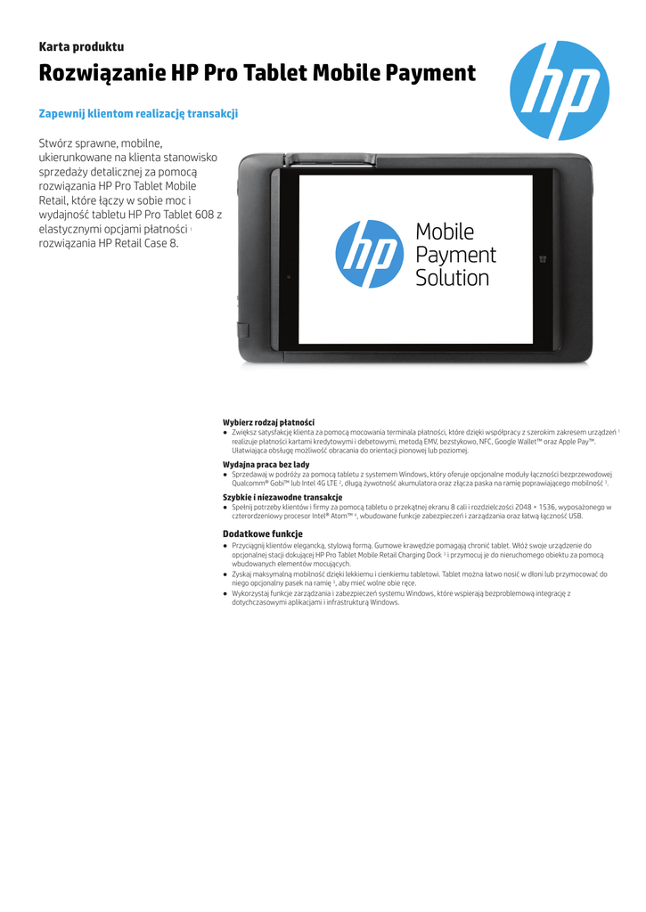 Karta produktu Rozwiązanie HP Pro Tablet Mobile Payment Zapewnij klientom realizację transakcji Stwórz sprawne, mobilne, ukierunkowane na klienta stanowisko sprzedaży detalicznej za pomocą rozwiązania HP Pro Tablet Mobile Retail, które łączy w sobie moc i wydajność tabletu HP Pro Tablet 608 z elastycznymi opcjami płatności rozwiązania HP Retail Case 8. 1 Wybierz rodzaj płatności ● Zwiększ satysfakcję klienta za pomocą mocowania terminala płatności, które dzięki współpracy z szerokim zakresem urządzeń 1 realizuje płatności kartami kredytowymi i debetowymi, metodą EMV, bezstykowo, NFC, Google Wallet™ oraz Apple Pay™. Ułatwiająca obsługę możliwość obracania do orientacji pionowej lub poziomej. Wydajna praca bez lady ● Sprzedawaj w podróży za pomocą tabletu z systemem Windows, który oferuje opcjonalne moduły łączności bezprzewodowej Qualcomm® Gobi™ lub Intel 4G LTE 2, długą żywotność akumulatora oraz złącza paska na ramię poprawiającego mobilność 3. Szybkie i niezawodne transakcje ● Spełnij potrzeby klientów i firmy za pomocą tabletu o przekątnej ekranu 8 cali i rozdzielczości 2048 × 1536, wyposażonego w czterordzeniowy procesor Intel® Atom™ 4, wbudowane funkcje zabezpieczeń i zarządzania oraz łatwą łączność USB. Dodatkowe funkcje ● Przyciągnij klientów elegancką, stylową formą. Gumowe krawędzie pomagają chronić tablet. Włóż swoje urządzenie do opcjonalnej stacji dokującej HP Pro Tablet Mobile Retail Charging Dock 3 i przymocuj je do nieruchomego obiektu za pomocą wbudowanych elementów mocujących. ● Zyskaj maksymalną mobilność dzięki lekkiemu i cienkiemu tabletowi. Tablet można łatwo nosić w dłoni lub przymocować do niego opcjonalny pasek na ramię 3, aby mieć wolne obie ręce. ● Wykorzystaj funkcje zarządzania i zabezpieczeń systemu Windows, które wspierają bezproblemową integrację z dotychczasowymi aplikacjami i infrastrukturą Windows. Karta produktu Rozwiązanie HP Pro Tablet Mobile Payment Tabela specyfikacji Dostępny system operacyjny Windows 10 Pro 641 Windows 10 IoT Enterprise for Retail 641 Windows Embedded 8.1 Pro Industry 641 Windows 8.1 Pro 641 Dostępne procesory Procesor Intel® Atom™ x5-Z8500 z kartą graficzną Intel HD Graphics (1,44 GHz, maks. 2,24 GHz z technologią Intel Burst, 2 MB pamięci podręcznej, 4 rdzenie)2 Zestaw układów Układ zintegrowany z procesorem Maksymalna wielkość pamięci Pamięć LPDDR3-1600, maks. 4 GB Szybkość transmisji do 1600 mln transferów/s Wewnętrzna pamięć masowa 32 GB eMMC; 64 GB eMMC3 Ekran / technologia dotykowa Wielodotykowy ekran pojemnościowy FHD QXGA BrightView WLED UWVA (2048 × 1536) o przekątnej 19,96 cm (7,86″) Dostępna karta graficzna Zintegrowana karta graficzna Intel® HD5 Bezprzewodowe Zintegrowana 2-zakresowa karta sieci bezprzewodowej Intel® Wireless-AC 7265 802.11 a/b/g/b/ac WiDi (2 × 2) Wi-Fi z modułem Bluetooth® 4.0 Combo; LTE/EVDO/HSPA+ z GPS M.2 (opcjonalnie); WWAN LTE/HSPA+ z GPS M.2 (opcjonalnie); WWAN HSPA+ z GPS M.2 (opcjonalnie)4 Karta dźwiękowa Dźwięk HD, dwa głośniki stereo i 2 zintegrowane mikrofony Kamera internetowa Aparat HD 2 Mpx z przodu; Aparat HD 8 Mpx z tyłu z autofokusem i lampą błyskową LED Czujniki Akcelerometr; kompas elektroniczny; żyroskop; czujnik oświetlenia zewnętrznego; czujnik efektu Halla; Haptics; czujnik odległości (tylko WWAN) Gniazda rozszerzeń 1 port microSD Obsługuje karty microSD SDXC o pojemności do 2 TB Porty i złącza 1 gniazdo słuchawkowe/mikrofonowe; 1 port USB-C™ Zasilanie Ładowarka 15 W z przewodem USB Type-C™ Bateria 21 Wh polimerowy litowo-jonowy Wymiary (sz. x gł. x wys.) 207 × 8,35 × 137 mm Wymiary samego tabletu w orientacji poziomej Waga Od 360 g Masa samego tabletu. Masa zależy od konfiguracji. Zarządzanie bezpieczeństwem TPM 1.2/2.0; HP Client Security Certyfikat zgodności ze standardami ochrony środowiska Niska zawartość halogenu6 Spełniane normy w zakresie sprawności energetycznej Certyfikat ENERGY STAR® Gwarancja opcje rocznej standardowej gwarancji na części i robociznę w miejscu instalacji w zależności od kraju; roczna ograniczona gwarancja na akumulator podstawowy. Opcjonalne usługi HP Care Pack rozszerzają zakres gwarancji standardowych. Poziomy usług i czasy reakcji na zgłoszenia w ramach usług HP Care Pack mogą być różne w zależności od lokalizacji klienta. Usługi są dostępne od dnia zakupu sprzętu. Obowiązują pewne ograniczenia i wyłączenia. Szczegółowe informacje są dostępne na stronie hp.com/go/cpc. Karta produktu Rozwiązanie HP Pro Tablet Mobile Payment Akcesoria i usługi (nie wchodzą w skład zestawu) Bezprzewodowy czytnik kodów kreskowych HP Wydajny skaner bezprzewodowy, który ładuje się podczas pracy. Lepsze wykorzystanie przestrzeni roboczej dzięki wydajnemu, bezprzewodowemu skanerowi, który odczytuje szereg kodów i ładuje się w dołączonej podstawie. Wyświetlacz LCD HP na uchwycie Ten mocowany na wsporniku wyświetlacz LCD o przekątnej ekranu 7" zapewnia przejrzysty obraz transakcji klientów oraz udostępnianie treści dynamicznych w punktach sprzedaży. Umożliwia łatwą integrację z posiadanym systemem sprzedaży detalicznej i zwiększa satysfakcję klienta przez dodanie elementów graficznych i wideo. Oznaczenie produktu: E6P34AA Oznaczenie produktu: F7A93AA Szuflada kasowa HP do pracy w ciężkich warunkach Niewielka, wytrzymała konstrukcja zapewnia niezawodną wydajność nawet w najbardziej wymagających warunkach sprzedaży detalicznej. Termiczna drukarka paragonów HP PUSB Drukarka kwitów kasowych HP PUSB Thermal to idealna jednostanowiskowa drukarka do sklepów detalicznych. Dzięki niewielkim rozmiarom doskonale pasuje do małych wnętrz. Czytnik kodów kreskowych HP Czytnik kodów kreskowych HP oferuje wszystkie cechy wymagane w przypadku podstawowych urządzeń tego typu — niewielką cenę, właściwy zestaw fun