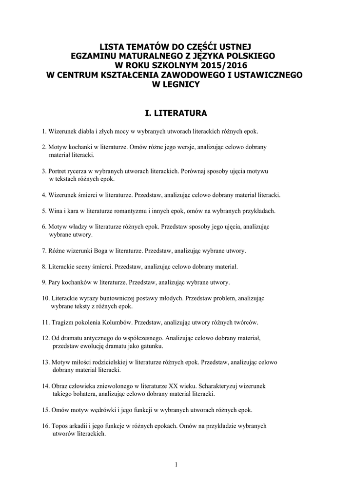 LISTA TEMATÓW DO CZĘŚĆI USTNEJ EGZAMINU MATURALNEGO Z JĘZYKA POLSKIEGO W ROKU SZKOLNYM 2015/2016 W CENTRUM KSZTAŁCENIA ZAWODOWEGO I USTAWICZNEGO W LEGNICY I. LITERATURA 1. Wizerunek diabła i złych mocy w wybranych utworach literackich róŜnych epok. 2. Motyw kochanki w literaturze. Omów róŜne jego wersje, analizując celowo dobrany materiał literacki. 3. Portret rycerza w wybranych utworach literackich. Porównaj sposoby ujęcia motywu w tekstach róŜnych epok. 4. Wizerunek śmierci w literaturze. Przedstaw, analizując celowo dobrany materiał literacki. 5. Wina i kara w literaturze romantyzmu i innych epok, omów na wybranych przykładach. 6. Motyw władzy w literaturze róŜnych epok. Przedstaw sposoby jego ujęcia, analizując wybrane utwory. 7. RóŜne wizerunki Boga w literaturze. Przedstaw, analizując wybrane utwory. 8. Literackie sceny śmierci. Przedstaw, analizując celowo dobrany materiał. 9. Pary kochanków w literaturze. Przedstaw, analizując wybrane utwory. 10. Literackie wyrazy buntowniczej postawy młodych. Przedstaw problem, analizując wybrane teksty z róŜnych epok. 11. Tragizm pokolenia Kolumbów. Przedstaw, analizując utwory róŜnych twórców. 12. Od dramatu antycznego do współczesnego. Analizując celowo dobrany materiał, przedstaw ewolucję dramatu jako gatunku. 13. Motyw miłości rodzicielskiej w literaturze róŜnych epok. Przedstaw, analizując celowo dobrany materiał literacki. 14. Obraz człowieka zniewolonego w literaturze XX wieku. Scharakteryzuj wizerunek takiego bohatera, analizując celowo dobrany materiał literacki. 15. Omów motyw wędrówki i jego funkcji w wybranych utworach róŜnych epok. 16. Topos arkadii i jego funkcje w róŜnych epokach. Omów na przykładzie wybranych utworów literackich. 1 17. „Miłość wszystko zwycięŜa i my ulegamy miłości” ( Wergiliusz ). Przedstaw róŜne ujęcia motywu miłości w wybranych utworach literackich pochodzących z róŜnych epok. 18. Miłość w literaturze polskiej. Analizując wybrane utwory, przedstaw funkcjonowanie tego motywu w dziełach róŜnych epok. 19. Wpływ wojny na ludzką psychikę i moralność. Omów, analizując celowo wybrane dzieła literackie. 20. Przedstaw motyw samotności człowieka w znanych Ci utworach literackich. 21. Starość jako motyw literacki. Omów zagadnienie na wybranych przykładach. 22. Człowiek wobec cierpienia. Omów na przykładach utworów róŜnych epok. 23. Literackie portrety dzieci. Omów zagadnienie na wybranych przykładach literackich. 24. Motyw drzewa w literaturze. Przedstaw sposoby jego ujęcia na podstawie wybranych utworów. 25. Postacie historyczne w literaturze polskiej. Omów zagadnienie na wybranych tekstach literackich. 26. Zwierzęta jako bohaterowie literaccy. Przedstaw, analizując celowo wybrany materiał literacki. 27. Kreacje nieszczęśliwych kochanków w literaturze róŜnych epok. Przedstaw i porównaj bohaterów. 28. Wzorce osobowe promowane w dziełach literackich róŜnych epok. Omów temat na wybranych przykładach z literatury polskiej i obcej. 29. Koncepcja losu ludzkiego w antyku i dziełach Williama Szekspira. Porównaj ujęcia motywu, zestawiając wybrane utwory. 30. Literacki obraz młodości. Przedstaw temat, analizując wybrane utwory literatury XIX i XX wieku. 31. Obłąkani i szaleni w dramatach Williama Szekspira i utworach romantyków. Zaprezentuj temat w oparciu o wybrane przykłady. 32. Pokora i pycha – przedstaw funkcjonowanie tego motywu w Biblii oraz innych tekstach literackich. 33. Sposób kreowania portretu córki w literaturze polskiej i obcej. Omów zagadnienie, analizując wybrane przykłady. 34. Literackie obrazy miasta. Omów temat na przykładzie wybranych utworów literackich. 2 35. Obraz kobiety w twórczości Bolesława Prusa i Henryka Sienkiewicza. Zaprezentuj temat w oparciu o wybrane przykłady. 36. Czas beztroski i szczęścia czy biedy i poniŜenia ? Omów motyw dzieciństwa, analizując wybrane utwory literackie. 37. Człowiek w systemie totalitarnym. Analizując wybrane dzieła literatury polskiej i obcej, omów wpływ totalitaryzmu na psychikę i morale człowieka. 38. Kara jako konsekwencja zbrodni. Przedstaw zagadnienie na podstawie wybranych przykładów z literatury polskiej i obcej. 39. „Non omnis moriar”. Na podstawie analizy tekstów poetyckich z róŜnych epok przedstaw motyw nieśmiertelności poety. 40. Buntownicy w tekstach literackich z róŜnych epok. Zaprezentuj temat na podstawie wybranych tekstów literackich. 41. Motyw władcy w literaturze. Na podstawie analizy celowo dobranego materiału z róŜnych epok porównaj kreacje postaci. 42. Na podstawie analizy celowo dobranych przykładów omów rolę opisów przyrody w tekstach literackich. 43. Symbol, alegoria, parabola. Analizując celowo dobrany materiał, omów sposoby niedosłownego mówienia o rzeczywistości w literaturze. II. ZWIĄZKI LITERATURY Z INNYMI DZIEDZINAMI SZTUKI 1. RóŜne ujęcia motywu tańca w literaturze, malarstwie i filmie. Omów, analizując wybrane przykłady. 2. Motyw Ikara w literaturze i malarstwie. Przedstaw, analizując celowo dobrany materiał. 3. Krajobraz górski w literaturze i malarstwie. Omów sposób jego ukazania na wybranych przykładach. 4. Natura w oczach poety i malarza. Porównaj sposoby ujęcia motywu w wybranych dziełach. 5. Katastroficzne wizje i obrazy zagłady w dziełach literackich i filmowych ( analiza wybranych dzieł ). 6. Literackie i malarskie obrazy wsi w znanych dziełach. Omów ich funkcję, analizując wybrane teksty kultury. 7. RóŜnorodne ujęcia motywu poŜegnania w literaturze i sztuce. Przedstaw temat na wybranych przykładach. 3 8. Sztuka wobec niewyraŜalnego. Symbol jako środek wyrazu w poezji i malarstwie. Omów temat na wybranych przykładach. 9. Danse macabre w literaturze i sztuce. Zaprezentuj temat na podstawie wybranych tekstów kultury. 10. Portrety duchownych w literaturze i filmie. Przedstaw róŜnorodne wizerunki bo