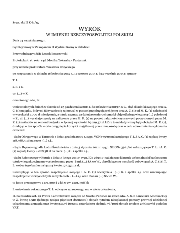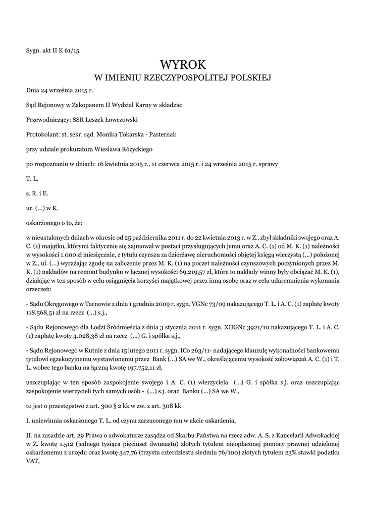 Sygn. akt II K 61/15 WYROK W IMIENIU RZECZYPOSPOLITEJ POLSKIEJ Dnia 24 września 2015 r. Sąd Rejonowy w Zakopanem II Wydział Karny w składzie: Przewodniczący: SSR Leszek Łowczowski Protokolant: st. sekr. sąd. Monika Tokarska - Pasternak przy udziale prokuratora Wiesława Różyckiego po rozpoznaniu w dniach: 16 kwietnia 2015 r., 11 czerwca 2015 r. i 24 września 2015 r. sprawy T. L. s. R. i E. ur. (...) w K. oskarżonego o to, że: w nieustalonych dniach w okresie od 25 października 2011 r. do 22 kwietnia 2013 r. w Z., zbył składniki swojego oraz A. C. (1) majątku, którymi faktycznie się zajmował w postaci przysługujących jemu oraz A. C. (1) od M. K. (1) należności w wysokości 1.000 zł miesięcznie, z tytułu czynszu za dzierżawę nieruchomości objętej księgą wieczystą (...) położonej w Z., ul. (...) wyrażając zgodę na zaliczenie przez M. K. (1) na poczet należności czynszowych poczynionych przez M. K. (1) nakładów na remont budynku w łącznej wysokości 69.219,57 zł, które to nakłady winny były obciążać M. K. (1), działając w ten sposób w celu osiągnięcia korzyści majątkowej przez inną osobę oraz w celu udaremnienia wykonania orzeczeń: - Sądu Okręgowego w Tarnowie z dnia 1 grudnia 2009 r. sygn. VGNc 73/09 nakazującego T. L. i A. C. (1) zapłatę kwoty 118.568,51 zł na rzecz (...) s.j., - Sądu Rejonowego dla Łodzi Śródmieścia z dnia 3 stycznia 2011 r. sygn. XIIGNc 3921/10 nakazującego T. L. i A. C. (1) zapłatę kwoty 4.028,38 zł na rzecz (...) G. i spółka s.j., - Sądu Rejonowego w Kutnie z dnia 15 lutego 2011 r. sygn. ICo 263/11- nadającego klauzulę wykonalności bankowemu tytułowi egzekucyjnemu wystawionemu przez Bank (...) SA we W., określającemu wysokość zobowiązań A. C. (1) i T. L. wobec tego banku na łączną kwotę 197.752,11 zł, uszczuplając w ten sposób zaspokojenie swojego i A. C. (1) wierzyciela (...) G. i spółka s.j. oraz uszczuplając zaspokojenie wierzycieli tych samych osób - (...) s.j. oraz Banku (...) SA we W., to jest o przestępstwo z art. 300 § 2 kk w zw. z art. 308 kk I. uniewinnia oskarżonego T. L. od czynu zarzuconego mu w akcie oskarżenia, II. na zasadzie art. 29 Prawa o adwokaturze zasądza od Skarbu Państwa na rzecz adw. A. S. z Kancelarii Adwokackiej w Z. kwotę 1.512 (jednego tysiąca pięciuset dwunastu) złotych tytułem nieopłaconej pomocy prawnej udzielonej oskarżonemu z urzędu oraz kwotę 347,76 (trzystu czterdziestu siedmiu 76/100) złotych tytułem 23% stawki podatku VAT, III. na zasadzie art. 632 pkt 2 kpk kosztami postępowania obciąża Skarb Państwa. Sygn. akt II K 61/15 Z., dnia 14 października 2015 r. UZASADNIENIE wyroku z dnia 24 września 2015 r. T. L. oskarżony został o to, że w nieustalonych dniach w okresie od 25 października 2011 r. do 22 kwietnia 2013 r. w Z., zbył składniki swojego oraz A. C. (1) majątku, którymi faktycznie się zajmował w postaci przysługujących jemu oraz A. C. (1) od M. K. (1) należności w wysokości 1.000 zł miesięcznie, z tytułu czynszu za dzierżawę nieruchomości objętej księgą wieczystą (...) położonej w Z., ul. (...) wyrażając zgodę na zaliczenie przez M. K. (1) na poczet należności czynszowych poczynionych przez M. K. (1) nakładów na remont budynku w łącznej wysokości 69.219,57 zł, które to nakłady winny były obciążać M. K. (1), działając w ten sposób w celu osiągnięcia korzyści majątkowej przez inną osobę oraz w celu udaremnienia wykonania orzeczeń: - Sądu Okręgowego w Tarnowie z dnia 1 grudnia 2009 r. sygn. VGNc 73/09 nakazującego T. L. i A. C. (1) zapłatę kwoty 118.568,51 zł na rzecz (...) s.j., - Sądu Rejonowego dla Łodzi Śródmieścia z dnia 3 stycznia 2011 r. sygn. XIIGNc 3921/10 nakazującego T. L. i A. C. (1) zapłatę kwoty 4.028,38 zł na rzecz (...) G. i spółka s.j., - Sądu Rejonowego w Kutnie z dnia 15 lutego 2011 r. sygn. ICo 263/11- nadającego klauzulę wykonalności bankowemu tytułowi egzekucyjnemu wystawionemu przez Bank (...) SA we W., określającemu wysokość zobowiązań A. C. (1) i T. L. wobec tego banku na łączną kwotę 197.752,11 zł, uszczuplając w ten sposób zaspokojenie swojego i A. C. (1) wierzyciela (...) G. i spółka s.j. oraz uszczuplając zaspokojenie wierzycieli tych samych osób - (...) s.j. oraz Banku (...) SA we W., to jest o przestępstwo z art. 300 § 2 kk w zw. z art. 308 kk. Sąd ustalił następujący stan faktyczny: Oskarżony T. L. wraz z A. C. (1) prowadzą działalność gospodarczą pod firmą P. P. H.U. A (...) s.c. A. C. (1) T. L.. A. C. (1) i T. L. byli właścicielami nieruchomości położonej w Z., przy ul. (...), objętej księgą wieczystą nr (...), zabudowanej budynkiem pensjonatowym. Dowód: - zeznania świadka: M. K. (1) k. 168, 233-234, 641, 811-812, (...) .H.U. (...) sp.j. w ramach prowadzonej działalności gospodarczej kilkakrotnie sprzedawała swoje towary P.P.H.U. A (...) s.c. A. C. (1), T. L.. Nabywca nie zapłacił należności wynikających z kolejno wystawianych faktur VAT. Nakazem zapłaty z dnia 1.12.2009 r. sygn. akt V GNc 73/09 Sąd Okręgowy w Tarnowie nakazał A. C. (1) i T. L. zapłatę kwoty 118 568,51 zł na rzecz (...) .H.U. (...) sp.j. wraz z kwotą 5 100 zł tytułem zwrotu koszów postępowania. W dniu 7.05.2010 r. (...) .H.U. (...) sp.j. wystąpiła do komornika o wszczęcie postępowania egzekucyjnego przeciwko A. C. (1) i oskarżonemu T. L., przedkładając w/w wyrok Sądu Okręgowego w Tarnowie. Dowód: - zeznania świadków: B. B. k. 127, 657, J. K. k. 129-130, 440-444, Z. T. (1) k. 22-23, 642, - protokół oględzin akt Km 682/12 Komornika Sądowego przy Sądzie Rejonowym w Kutnie k. 28-107, - protokół oględzin akt Sądu Okręgowego w Krakowie sygn.. IX Gnc 99/10 k. 195-214, - protokół oględzin akt Km 628/10 Komornika Sądowego przy Sądzie Rejonowym w Kutnie sprawy z wniosku B. sp.j. k. 283-345, W dniu 3.11.2008 r. A. C. (1) i oskarżony T. L. zawarli z Bankiem (.