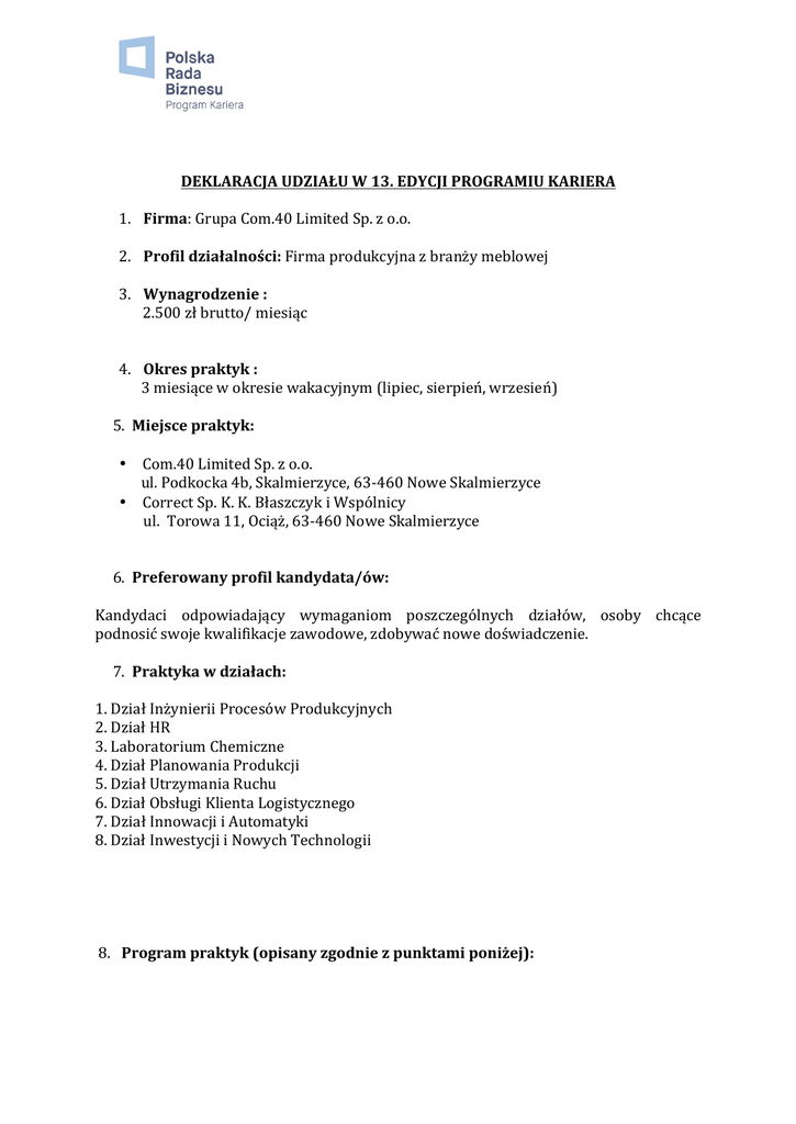 DEKLARACJA UDZIAŁU W 13. EDYCJI PROGRAMIU KARIERA 1. Firma: Grupa Com.40 Limited Sp. z o.o. 2. Profil działalności: Firma produkcyjna z branży meblowej 3. Wynagrodzenie : 2.500 zł brutto/ miesiąc 4. Okres praktyk : 3 miesiące w okresie wakacyjnym (lipiec, sierpień, wrzesień) 5. Miejsce praktyk: • Com.40 Limited Sp. z o.o. ul. Podkocka 4b, Skalmierzyce, 63-‐460 Nowe Skalmierzyce • Correct Sp. K. K. Błaszczyk i Wspólnicy ul. Torowa 11, Ociąż, 63-‐460 Nowe Skalmierzyce 6. Preferowany profil kandydata/ów: Kandydaci odpowiadający wymaganiom poszczególnych działów, osoby chcące podnosić swoje kwalifikacje zawodowe, zdobywać nowe doświadczenie. 7. Praktyka w działach: 1. Dział Inżynierii Procesów Produkcyjnych 2. Dział HR 3. Laboratorium Chemiczne 4. Dział Planowania Produkcji 5. Dział Utrzymania Ruchu 6. Dział Obsługi Klienta Logistycznego 7. Dział Innowacji i Automatyki 8. Dział Inwestycji i Nowych Technologii 8. Program praktyk (opisany zgodnie z punktami poniżej): I. Dział Inżynierii Procesów Produkcyjnych (opiekun: Łukasz Pluciński) Cel praktyk: zdobycie doświadczenia, nabycie umiejętności praktycznego wykorzystania i zastosowania wiedzy teoretycznej dotyczącej Procesów Produkcyjnych Zakres obowiązków: • • • • tworzenie, rozpisywanie, analizowanie planów produkcyjnych poszukiwanie nowych technologii produkcji usprawnianie procesu produkcyjnego poszukiwanie rozwiązań technologicznych wpływających na redukcję kosztów, zwiększających wydajność, zapewniających jakość i powtarzalność w procesie produkcyjnym PROSIMY O ROWIĄZANIE ZADANIA Z DZIEDZINY INŻYNIERII I PROCESÓW PRODUKCYJNYCH II. Dział HR (opiekun: Paulina Makowska / Anna Marszałek) Cel praktyk: zapoznanie ze strukturą organizacyjną przedsiębiorstwa, przygotowanie i wdrożenie praktykanta do samodzielnej realizacji zadań z zakresu Zarządzania Zasobami Ludzkimi w oparciu o istniejące w firmie procedury. Zakres obowiązków: • • • • • proces rekrutacji proces wdrożenia i adaptacji pracownika organizacja szkoleń organizacja praktyk przygotowanie dokumentów związanych z delegacjami zagranicznymi pracowników PROSIMY O ROWIĄZANIE ZADANIA Z DZIEDZINY HR III. Laboratorium Chemiczne (opiekun praktyk: Marlena Małecka – Grycz) Cel praktyk: zdobycie doświadczenia, nabycie umiejętności praktycznego wykorzystania i zastosowania wiedzy teoretycznej. Zakres obowiązków: • udział we wszystkich badaniach i operacjach wykonywanych w Laboratorium, w tym: badania fizykomechaniczne elastycznych tworzyw sztucznych porowatych • oznaczanie emisji/ zawartości formaldehydu • badania wody, ścieków • badania surowców do produkcji pianki PUR PROSIMY O ROWIĄZANIE ZADANIA Z DZIEDZINY LABORATORIUM CHEMICZNE IV. Dział Planowania Produkcji (opiekun praktyk: Łukasz Lorenc) Cel praktyk: zapoznanie się ze strukturą organizacyjną przedsiębiorstwa; zdobycie doświadczenia związanego z przygotowaniem planów produkcyjnych w Dziale Planowania Produkcji; zapoznanie się z programami informatycznymi wspomagającymi zarządzanie i rozliczanie produkcji. Zakres obowiązków: • • • • tworzenie analiz danych z obszaru produkcji wsparcie w zakresie tworzenia prognoz zapotrzebowania na surowce pomoc w zakresie opracowania kart technologicznych wsparcie w tworzeniu planów produkcyjnych PROSIMY O ROWIĄZANIE ZADANIA Z DZIEDZINY PLANOWANIA PRODUKCJI V. Dział Utrzymania Ruchu (opiekun praktyk: Michał Gądek) Cel praktyk: zdobycie doświadczenia, nabycie umiejętności praktycznego wykorzystania i zastosowania wiedzy teoretycznej. Zakres obowiązków: • poszukiwanie nowych technologii produkcji • usprawnianie procesu produkcyjnego • poszukiwanie rozwiązań technologicznych wpływających na redukcję kosztów, zwiększających wydajność, zapewniających jakość i powtarzalność w procesie produkcyjnym • nadzór nad eksploatacją maszyn i urządzeń zainstalowanych w Spółce. • nadzór nad eksploatacją urządzeń elektroenergetycznych Spółki. • prowadzenie prac modernizacyjnych maszyn i urządzeń w celu poprawy warunków bhp, obniżania kosztów ich eksploatacji, poprawy jakości i powtarzalności, poprawy wydajności oraz dopasowanie ich do nowych wymagań odbiorców produkowanych wyrobów PROSIMY O ROWIĄZANIE ZADANIA Z DZIEDZINY UTRZYMANIA RUCHU VI. Dział Obsługi Klienta Logistycznego (opiekun praktyk: Jakub Utecht) Cel praktyk: zdobycie doświadczenia, nabycie umiejętności praktycznego wykorzystania i zastosowania wiedzy teoretycznej. Zakres obowiązków: • • • • tworzenie, rozpisywanie, analizowanie planów produkcyjnych poszukiwanie nowych technologii produkcji usprawnianie procesu produkcyjnego poszukiwanie rozwiązań technologicznych wpływających na redukcję kosztów, zwiększających wydajność, zapewniających jakość i powtarzalność w procesie produkcyjnym PROSIMY O ROWIĄZANIE ZADANIA Z DZIEDZINY LOGISTYKI Dział Innowacji i Automatyki (opiekun praktyk: Łukasz Dyczkowski) VII. Cel praktyk: zdobycie doświadczenia, nabycie umiejętności praktycznego wykorzystania i zastosowania wiedzy teoretycznej. Zakres obowiązków: • poszukiwanie nowych technologii produkcji • usprawnianie procesu produkcyjnego • poszukiwanie rozwiązań technologicznych wpływających na redukcję kosztów, zwiększających wydajność, zapewniających jakość i powtarzalność w procesie produkcyjnym • nadzór nad eksploatacją maszyn i urządzeń zainstalowanych w Spółce. PROSIMY O ROWIĄZANIE ZADANIA Z DZIEDZINY INNOWACJI I AUTOMATYKI VIII. Dział Inwestycji i Nowych Technologii (opiekun praktyk: Dariusz Frątczak) Cel praktyk: zapoznanie ze strukturą organizacyjną przedsiębiorstwa, poznanie procesu wdrożenia nowych technologii, zapoznanie ze specyfikacją pracy Zakres obowiązków: • • • • poszukiwanie nowych technologii możliwych do wdrożenia w Spółkach uczestnictwo w przygotowywaniu zapytań o