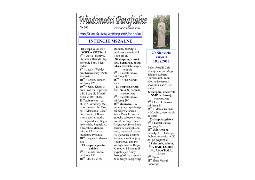 Nr 205 www.anin.parafia.info Parafia Matki BoŜej Królowej Polski w Aninie INTENCJE MSZALNE 18 sierpnia, 20 NIEDZIELA ZWYKŁA 700 + Zofia i Henryk, Stefania i Henryk Flejszerowie i zm. z ich rodzin 830 + Jacek i Waldemar Kruszewscy, Piotr Zieliński 1000 + Leszek Janowski /greg.17/ 1000 + Jerzy Kraus w dniu urodzin i z prośbą o bł. Boże dla Madzi i Julka w 10 r. ślubu 1130 zbiorowa: - dz.bł. w 70 urodziny Marii o zdrowie i bł. Boże; + Marianna i Józef Drozdowie; + Bolesław z racji urodzin, cr. Łęgowskich, Boguszewskich, Roguskich; + Karolina Melnarowicz w 15 r.śm.; + Stanisław Prządka; 1800 + Agata Szabłowska 19 sierpnia, poniedziałek 700 + Leszek Janowski /greg.18/ 1800 – dz.-bł. w 76. urodziny Jadwigi z prośbą o zdrowie i bł. Boże dla cr. 20 sierpnia, wtorek, Św. Bernarda, opata i d-ra Kościoła, wspomnienie 700 + Leszek Janowski /greg.19/ 1800 + Alina Siarkiewicz 21 sierpnia, środa, Św. Piusa X, papieża, wspomnienie 700 + Leszek Janowski /greg.20/ 1800 zbiorowa: - w intencji wynagradzającej Najświętszemu Sercu Pana Jezusa za grzechy całego świata; - o intronizację Najświętszego Serca Pana Jezusa w naszych sercach, rodzinach, parafii, ojczyźnie i całym świecie; - za Krucjatą Różańcową, aby Polska była wierna Bogu, Krzyżowi i Ewangelii wypełniając Śluby Jasnogórskie; - z prośbą o beatyfikację Sługi 20 Niedziela Zwykła 18.08.2013 Bożej Rozalii Celakówny; - w int. Magdaleny i Roberta Ostrowskich, rodziców, rodzeństwa i szwagra z okazji 3 r. ślubu; 22 sierpnia, czwartek, NMP, Królowej, wspomnienie 700 + Leszek Janowski /greg.21/ 1800 + Marek Goliński w 30 r.śm., jego rodzice i brat 23 sierpnia, piątek 700 + Leszek Janowski /greg.22/ 1800 zbiorowa za zmarłych: + Jadwiga Jachner-Wyrwicz w 30 dni po pogrzebie; 24 sierpnia, sobota, ŚW. BARTŁOMIEJA, APOSTOŁA, święto 700 zajęta 1500 ślub: MatrajPijarczyk Liturgia Słowa Bożego Jr 38,4-6.8-10 Panie, mój Boże, pośpiesz mi z pomocą Hbr 12,1-4 Łk 12,49-53 Jezus powiedział do swoich uczniów: Przyszedłem rzucić ogień na ziemię i jakże bardzo pragnę, żeby on już zapłonął. Chrzest mam przyjąć i jakiej doznaję udręki, aż się to stanie. Czy myślicie, że przyszedłem dać ziemi pokój? Nie, powiadam wam, lecz rozłam. Odtąd bowiem pięcioro będzie rozdwojonych w jednym domu: troje stanie przeciw dwojgu, a dwoje przeciw trojgu; ojciec przeciw synowi, a syn przeciw ojcu; matka przeciw córce, a córka przeciw matce; teściowa przeciw synowej, a synowa przeciw teściowej. Ogłoszenia na 20 Niedzielę Zwykłą 18.08.2013 r. • Wszystkich sierpniowych pielgrzymów zmierzających z różnych miejsc Polski do sanktuariów maryjnych polecamy wspólnym modlitwom wiernych. • Wszystkim przebywającym na wakacjach życzymy pomyślnego wypoczynku i radosnego odkrywania obecności Boga w przyrodzie i czasie wolnym. Jednocześnie przypominamy o obowiązku uczestniczenia w niedzielnej mszy św. i uczulamy na godny strój w czasie obecności w świątyni. • Z racji na sierpień weźmy sobie do serca słowa Apelu Trzeźwości. • W dzisiejszą niedzielę nasz Parafialny Caritas organizuje zbiórkę artykułów i przyborów szkolnych dla dzieci potrzebujących wsparcia z naszej Parafii. Do kosza wystawionego przy wejściu do kościoła można też włożyć szampon lub inne środki czystości. Dziękujemy za okazaną pomoc w rozpoczynającym się Nowym Roku Szkolnym. • W sobotę 24 sierpnia o godz. 9.00 z Placu Zamkowego wyruszy XIII Międzynarodowy Motocyklowy Rajd Katyński. W Rajdzie Katyńskim pojadą również motocykliści Zlotu w Ponarach na Wileńszczyźnie, Zlotu w Hucie Pieniackiej na Kresach i Zlotu w Wiedniu w Austrii. Naszych Parafian i wszystkich Gości serdecznie zapraszamy na rozpoczęcie i start Rajdu. • Na zakończenie Roku Wiary, który ogłosił Ojciec Święty nasza parafia organizuje w dniach 5-12 października pielgrzymkę do Ziemi Św. i Jordanii. Bliższe informacje można znaleźć na ulotce na stolikach przy wyjściu z kościoła. Pozostało jeszcze 15. wolnych miejsc! • W przyszłą niedzielę, 25 sierpnia Fundacja Gargano, która ma na celu propagowanie wartości chrześcijańskich, krótko przedstawi zarys swojej działalności. Wolontariusze będą zbierać datki na wsparcie działalności fundacji. Będzie można także nabyć komiks dla młodzieży o wpływie Św. Michała Archanioła na życie młodego człowieka. • Biuro Radia Maryja organizuje w dniach 5-7 września 2013 (3 dni) pielgrzymkę do Sanktuarium Św. Józefa w Kaliszu - w intencji naszych rodzin, Sanktuarium Matki Bożej Licheńskiej w Licheniu - prosząc o jedność i pokój w sercach Narodu Polskiego oraz na uroczystości dziękczynne Rodziny Radia Maryja w Torunia. Bliższe informacje w kiosku. Serdecznie zapraszamy do udziału do bogatej duchowo pielgrzymki. ⇒ ⇒ ⇒ Zapowiedzi przedślubne: Jan Robert Lach, kawaler z par. tut. Alina Maria Chołodniuk, panna z par. tut. Jakub Niemirka, kawaler z par. tut. Anna Wąsowska, panna z Kraśnika Maciej Piotr Bujnik, kawaler z par. w Piasecznie i Magdalena Anna Kowalczyk, panna z par. tutejszej XX Niedziela zwykła – 18.08 Opamiętanie W obecnym porządku świata widzimy dezintegrację osób i narodów, lekceważenie sprawiedliwości, pogardzanie miłością, łamanie norm moralności, ale także słyszymy przenikliwe wołanie o opamiętanie i rozsądek. Klęski, nieszczęścia, zagłady – mogą przynieść opamiętanie i odmianę, jeżeli człowiek jest w stanie je odczytać i zrozumieć, „opierać się im aż do krwi”. Jezus zbliża się do Jerozolimy na godziny swojej męki i śmierci, sądu i zbawienia. Są to chwile, w których rozstrzygną się losy świata i ludzkości. Krzyż Jezusa przyniesie rozłam, ale stanie się przede wszystkim znakiem zbawienia. Ogień w Piśmie św. jest obrazem sądu, ale też i miłości, która wszystko oczyszcza. Woda, to chrzest zanurzenia się w Chrystusie, w Jego mę