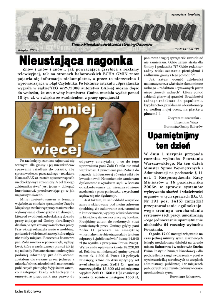 egzemplarz bezpłatny Pismo Mieszkańców Miasta i Gminy Baborów ISSN 1427-8138 6/lipiec 2008 r. Nieustająca nagonka Znów i znów i znów… jak powracająca grzybica z reklamy telewizyjnej, tak na stronach baborowskich ECHA GMIN znów pojawia się informacja niekompletna, a przez to nierzetelna i wprowadzająca w błąd Czytelnika. Po lekturze artykułu „Sprzątaczka wygrała w sądzie”(EG nr29/2008 autorstwa BAK-a) można dojść do wniosku, że oto z winy burmistrza Gmina musiała wydać ponad 18 tys. zł. w związku ze zwolnieniem z pracy sprzątaczki ponieważ drugiej sprzątaczki zatrudniać nie zamierzam. Gdzie zatem strata dla Gminy i podatnika ??? Gdzie redaktorradny widzi szastanie pieniędzmi i zadłużanie gminy z tego powodu??? . Jak zatem ocenić zdolności matematyczne, a właściwie ekonomiczne radnego – redaktora i cytowanych przez niego „innych radnych”, którzy ponoć zabierali głos w tej sprawie? Bo zdolności radnego-redaktora do populizmu, krytykanctwa, przekłamań i dezinformacji są, według mojej oceny, na piątkę z plusem !!! . Z wyrazami szacunku Eugeniusz Waga Burmistrz Gminy Baborów Upamiętnijmy ten dzień Po raz kolejny, zamiast zajmować się ważnymi dla gminy i jej mieszkańców sprawami usiadłem do pisania, aby sprostować to, co przez radnego – redaktora Kanasa (BAK-a)- zostało opisane w sposób nieobiektywny i stronniczy. A cel takiego „dziennikarstwa” jest jeden – dokopać burmistrzowi, przedstawiając go w jak najgorszym świetle. Mniej zorientowanym w temacie wyjaśnię, że chodzi o sprzątaczkę Urzędu Miejskiego zwolnioną z pracy za nierzetelne wykonywanie obowiązków służbowych, która od zwolnienia odwołała się do sądu pracy żądając od Gminy określonych działań, w tym zmiany świadectwa pracy. Przy okazji oskarżyła mnie o mobbing, poniżanie i wiele innych rzeczy, które nigdy nie miały miejsca! Roszczenia finansowe pani Zofia również w pozwie ujęła, żądając kwot, które w części z mocy prawa i tak jej się należały. Posiane ziarno tendencyjnie podanej informacji już dało owoce: zostałem okrzyczany przez jednego z mieszkańców za nieudolność i marnowanie publicznych pieniędzy. Wyjaśniam zatem, co następuje: każdy odchodzący na emeryturę pracownik ma prawo do Echo Baborowa odprawy emerytalnej i co do tego uprawnienia pani Zofii O. nikt nie miał wątpliwości. Uprawnienia pani Zofii O. do nagrody jubileuszowej również nikt nie kwestionował. Natomiast nie zamierzam dyskutować z wyrokiem sądu w kwestii odszkodowania za nieuzasadnione zwolnienie z pracy ponieważ… z wyrokami sądów się nie dyskutuje. Jest faktem, że sąd oddalił wszystkie zarzuty skierowane pod moim adresem (mobbing, złe traktowanie etc), natomiast z koniecznością wypłaty odszkodowania za likwidację stanowiska pracy się liczyłem. Przejdźmy zatem do rzekomych strat poniesionych przez Gminę: gdyby pani Zofia O. przeszła na emeryturę w normalnym trybie otrzymałaby tytułem odprawy i „jubileuszówki” kwotę 14.040 zł (to wynika z przepisów Prawa Pracy). Wyrok sądu opiewa na kwotę 18.220,80 zł. Różnica na niekorzyść gminy wynosi zatem ok. 4.200 zł. Przez 10 pełnych miesięcy, które do dziś upłynęły od zwolnienia pani Zofii O. gmina zaoszczędziła 15.600 zł.( miesięczna wypłata Zofii O. 1560 x 10) i co miesiąc kwota ta rośnie o następne 1560 zł, W dniu 1 sierpnia przypada rocznica wybuchu Powstania Warszawskiego. Na ten dzień Minister Spraw Wewnętrznych i Administracji na podstawie § 11 ust. 1 Rozporządzenia Rady Ministrów z 16 października 2006r. w sprawie systemów wykrywania skażeń i właściwości organów w tych sprawach (Dz. U. Nr 191 poz. 1415) zarządził przeprowadzenie ogólnokrajowego treningu uruchamiania systemów i ich pracy, umożliwiają -cego jednocześnie upamiętnienie obchodów 64 rocznicy wybuchu Powstania. O godz. 17.00 nastąpi włączenie na czas jednej minuty syren alarmowych (ciągły, modulowany dźwięk) na terenie miasta Baborowa i w sołectwie Sucha Psina. Instytut Pamięci Narodowej – dla podkreślenia rangi wydarzenia – prosi o wywieszenie flag narodowych na urzędach administracji publicznej i w miejscach publicznych oraz minutę zadumy w czasie uruchomienia syren. Burmistrz Baborowa. 1 Przekłamania i manipula cje manipulacje Po lekturze czerwcowego wydania NIE-GŁOS MIESZKAŃCÓW, który to periodyk staraniem radnego baborowskiej Rady Miejskiej Lesława Górskiego się ukazuje, doszedłem do wniosku, że czas dać odpór działaniom, które z rzetelną informacją prasową niewiele mają wspólnego. Nie wiem, czy moje widzenie dziennikarstwa jest błędne, ale informacje prasowe z którymi spotykam się w NIE…w przerażającej większości są niekompletne, a przez to tendencyjne, co w znaczącym stopniu zaciemnia i wykrzywia obiektywny obraz rzeczywistości. Przykłady można mnożyć, ot, choćby tytułowa strona i podane przez radnego Górskiego informacje o udzielonej pomocy publicznej. Wśród beneficjentów tej pomocy znajduje się nazwisko żony jednego z radnych RM – Pani Lidii Hończak, która prowadzi lokal gastronomiczny w Baborowie. Bezpośrednio pod tabelką widnieje pytanie: „Dlaczego Radny Mieczysław Hończak popiera Burmistrza Wagę?”. W tekście nie ma ani słowa wyjaśnienia na temat pomocy publicznej. Czytelnik może ją nawet pomylić z pomocą społeczną i być może, radnemu Górskiemu właśnie o to chodziło. Zresztą, ktoś nawet mnie pytał, czy to prawda, że Pan Hończak chodzi do „Opieki”, w co mój Rozmówca – jak stwierdził- absolutnie nie wierzy. Zatem i u Czytelnika wiara w bzdurę może być niewielka. Myślę, że należałoby wyjaśnić, co to jest ta „pomoc publiczna”. Otóż na szczeblu Gminy są to wszelkiego rodzaju umorzenia i przesunięcia terminów płatności podatków i opłat lokalnych. Obowiązkiem burmistrza jest podawanie ich do publicznej wiadomości. W 