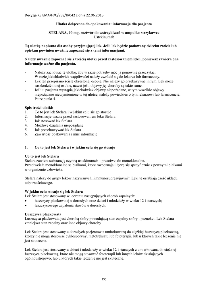 Decyzja KE EMA/H/C/958/II/042 z dnia 22.06.2015 Ulotka dołączona do opakowania: informacja dla pacjenta STELARA, 90 mg, roztwór do wstrzykiwań w ampułko-strzykawce Ustekinumab Tą ulotkę napisano dla osoby przyjmującej lek. Jeśli lek będzie podawany dziecku rodzic lub opiekun powinien uważnie zapoznać się z tymi informacjami. Należy uważnie zapoznać się z treścią ulotki przed zastosowaniem leku, ponieważ zawiera ona informacje ważne dla pacjenta. - Należy zachować tę ulotkę, aby w razie potrzeby móc ją ponownie przeczytać. W razie jakichkolwiek wątpliwości należy zwrócić się do lekarza lub farmaceuty. Lek ten przepisano ściśle określonej osobie. Nie należy go przekazywać innym. Lek może zaszkodzić innej osobie, nawet jeśli objawy jej choroby są takie same. Jeśli u pacjenta wystąpią jakiekolwiek objawy niepożądane, w tym wszelkie objawy niepożądane niewymienione w tej ulotce, należy powiedzieć o tym lekarzowi lub farmaceucie. Patrz punkt 4. Spis treści ulotki: 1. Co to jest lek Stelara i w jakim celu się go stosuje 2. Informacje ważne przed zastosowaniem leku Stelara 3. Jak stosować lek Stelara 4. Możliwe działania niepożądane 5. Jak przechowywać lek Stelara 6. Zawartość opakowania i inne informacje 1. Co to jest lek Stelara i w jakim celu się go stosuje Co to jest lek Stelara Stelara zawiera substancję czynną ustekinumab – przeciwciało monoklonalne. Przeciwciała monoklonalne są białkami, które rozpoznają i łączą się specyficznie z pewnymi białkami w organizmie człowieka. Stelara należy do grupy leków nazywanych „immunosupresyjnymi”. Leki te osłabiają część układu odpornościowego. W jakim celu stosuje się lek Stelara Lek Stelara jest stosowany w leczeniu następujących chorób zapalnych: łuszczycy plackowatej u dorosłych oraz dzieci i młodzieży w wieku 12 i starszych; łuszczycowego zapalenia stawów u dorosłych. Łuszczyca plackowata Łuszczyca plackowata jest chorobą skóry powodującą stan zapalny skóry i paznokci. Lek Stelara zmniejsza stan zapalny oraz inne objawy choroby. Lek Stelara jest stosowany u dorosłych pacjentów z umiarkowaną do ciężkiej łuszczycą plackowatą, którzy nie mogą stosować cyklosporyny, metotreksatu lub fototerapii, lub u których takie leczenie nie jest skuteczne. Lek Stelara jest stosowany u dzieci i młodzieży w wieku 12 i starszych z umiarkowaną do ciężkiej łuszczycą plackowatą, które nie mogą stosować fototerapii lub innych leków działających ogólnoustrojowo, lub u których takie leczenie nie jest skuteczne. 133 Decyzja KE EMA/H/C/958/II/042 z dnia 22.06.2015 Łuszczycowe zapalenie stawów Łuszczycowe zapalenie stawów to choroba zapalna stawów, zwykle związana z łuszczycą. Pacjenci z aktywnym łuszczycowym zapaleniem stawów są wcześniej leczeni innymi lekami. Dopiero gdy odpowiedź na to leczenie jest niewystarczająca, pacjent może otrzymać lek Stelara w celu: zmniejszenia objawów choroby; poprawy sprawności fizycznej; spowolnienia postępu uszkodzenia stawów. 2. Informacje ważne przed zastosowaniem leku Stelara Kiedy nie stosować leku Stelara: jeśli pacjent ma uczulenie na ustekinumab lub którykolwiek z pozostałych składników tego leku (wymienionych w punkcie 6). jeśli pacjent ma czynne zakażenie, które według lekarza jest istotne klinicznie. W przypadku jakichkolwiek wątpliwości, czy którakolwiek z powyższych sytuacji dotyczy pacjenta, należy skontaktować się z lekarzem lub farmaceutą przed zastosowaniem leku Stelara. Ostrzeżenia i środki ostrożności Przed rozpoczęciem stosowania leku Stelara należy zwrócić się do lekarza lub farmaceuty. Lekarz oceni stan zdrowia pacjenta przed rozpoczęciem każdego leczenia. Pacjent powinien upewnić się, że przed rozpoczęciem każdego leczenia poinformował lekarza o wszystkich swoich dolegliwościach. Należy także powiedzieć lekarzowi, jeśli pacjent ostatnio przebywał w otoczeniu osoby, która mogła mieć gruźlicę. Przed rozpoczęciem stosowania leku Stelara lekarz zbada pacjenta oraz zleci wykonanie testów wykrywających gruźlicę. Jeżeli lekarz stwierdzi u pacjenta istnienie ryzyka gruźlicy, pacjent otrzyma leki przeciwgruźlicze. Uwaga na ciężkie działania niepożądane Lek Stelara może powodować ciężkie działania niepożądane, w tym reakcje alergiczne i zakażenia. Należy zwracać uwagę na pewne objawy w trakcie stosowania leku Stelara. Pełna lista tych działań niepożądanych znajduje się w punkcie 4 „Ciężkie działania niepożądane”). Przed rozpoczęciem stosowania leku Stelara należy powiedzieć lekarzowi: jeśli pacjent miał kiedykolwiek reakcję alergiczną na lek Stelara. Należy zapytać lekarza, jeśli pacjent nie jest pewien. o wszelkiego rodzaju przebytych chorobach nowotworowych – gdyż leki immunosupresyjne, takie jak lek Stelara zmniejszają aktywność układu odpornościowego. Może to zwiększyć ryzyko raka. jeśli pacjent ma lub miał ostatnio zakażenie. jeśli pojawią się nowe zmiany lub nastąpią zmiany istniejących miejsc łuszczycowych lub na zdrowej skórze. jeśli pacjent miał kiedykolwiek reakcję alergiczną na lateks lub po wstrzyknięciu leku Stelara – opakowanie tego produktu leczniczego zawiera gumę lateksową, która może powodować ciężkie reakcje uczuleniowe u osób wrażliwych na lateks. Objawy reakcji alergicznej patrz punkt 4 „Uwaga na ciężkie działania niepożądane”. o stosowaniu wszelkich innych rodzajów leczenia łuszczycy i (lub) łuszczycowego zapalenia stawów – takich jak inny lek immunosupresyjny lub fototerapia (leczenie za pomocą światła ultrafioletowego (UV)). Te terapie również mogą zmniejszać aktywność układu odpornościowego pacjenta. Jednoczesne stosowanie tych terapii z lekiem Stelara nie zostało zbadane. Jednakże może to zwiększać ryzyko chorób związanych z osłabieniem układu odpornościowego. jeśli pacjent kiedyko