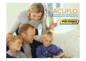 Centralne Odkurzanie Dlaczego VACUFLO? • Nowoczesność i wysoka jakość • Właściwe rozwiązanie dla kaŜdego uŜytkownika – True Cyclonic (pełna filtracja cykloniczna, bez filtrów), Filtered Cyclonic (jednostka z filtrem), Inverted Filter (jednostka z odwróconym workiem) • Aspekty zdrowotne – redukcja wszelkich zanieczyszczeń i alergenów z domu • Bardzo wydajne i skuteczne produkty • Nawet do 7-miu lat gwarancji • Największy odsetek zadowolonych klientów • Wyjątkowa jakość i zgodność z normami ISO • Zwiększenie wartości domu • Szeroki wybór akcesoriów i zestawów do sprzątania Centralne Odkurzanie Wyjątkowa Technologia Filtracji Cyklonicznej Właściwe rozwiązanie dla kaŜdego uŜytkownika VACUFLO True Cyclonic® VACUFLO Filtered Cyclonic® ELEMENT Inverted Filter Filtracja Cykloniczna separuje zanieczyszczenia z wirującego strumienia powietrza Odkurzacz Centralny Wyjątkowa Technologia Filtracji Cyklonicznej • Trzy metody filtracji: – VACUFLO True Cyclonic ( jednostka bez filtra) – VACUFLO Filtered Cyclonic ( jednostka z filtrem) – ELEMENT Inverted Filter ( jednostka z odwróconym workiem) • Eliminacja 100% zassanego brudu, kurzu i alergenów z domu, co gwarantuje poprawę jakości powietrza którym oddychamy • Bardzo wydajny silnik, pozwala osiągnąć nawet do pięciu razy większa moc ssącą od tradycyjnych rozwiązań odkurzaczy • Sprzątanie bardziej dokładne przy mniejszym zuŜyciu sprzętu i powierzchni sprzątanej Centralne Odkurzanie Rozwiązania dla przechowywania węŜa ssącego VACUFLO VACUFLO liderem liderem w w rozwiązaniach rozwiązaniach dla dla szybkiego szybkiego sprzątania sprzątania Centralne Odkurzanie Wygoda w sprzątaniu – NOWOŚĆ!!! •Pozwala ukryć w ścianie do 15 m węŜa •Brak konieczności przenoszenia niewygodnego zwoju z węŜem • System blokowania węŜa – pozwala wyciągnąć wąŜ na taką długość, jaka jest niezbędna do sprzątania oraz zapobiega jego wciągnięciu Centralne Odkurzanie SPOT SPOT –– wyścigowe wyścigowe rozwiązanie rozwiązanie •Szybki dostęp – wystarczy podnieść klapkę i wyciągnąć wąŜ •Pozwala ukryć 3 m węŜa ssącego •Idealne rozwiązanie przy codziennych obowiązkach Centralne Odkurzanie Szybkość w sprzątaniu •Zawsze na swoim miejscu, idealny do codziennego uŜytku •Zaprojektowany do usuwania wszelkich zanieczyszczeń •Prosta obsługa • Zasięg do 7,5 metra! • Idealny do sprzątania w kuchni Kontakt Ekspozycja: ul. Bartycka 26 lok. 905, 00-716 Warszawa Biuro: ul. Kościelna 12, 05-135 Wieliszew Tel: 22 814 16 20 Kom. 515 274 793 Fax: 22 811 02 61 501 060 397 [email protected] [email protected] www.polterms.com.pl