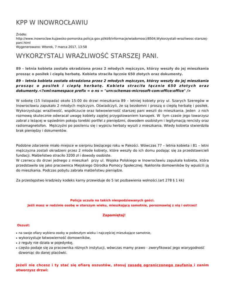 KPP W INOWROCŁAWIU Źródło: http://www.inowroclaw.kujawsko-pomorska.policja.gov.pl/kb9/informacje/wiadomosci/8504,Wykorzystali-wrazliwosc-starszejpani.html Wygenerowano: Wtorek, 7 marca 2017, 13:58 WYKORZYSTALI WRAŻLIWOŚĆ STARSZEJ PANI. 89 – letnia kobieta została okradziona przez 2 młodych mężczyzn, którzy weszły do jej mieszkania prosząc o posiłek i ciepłą herbatę. Kobieta straciła łącznie 650 złotych oraz dokumenty. 89 – letnia kobieta została okradziona przez 2 młodych mężczyzn, którzy weszły do jej mieszkania prosząc o posiłek i ciepłą herbatę. Kobieta straciła łącznie 650 złotych oraz dokumenty.<?xml:namespace prefix = o ns = "urn:schemas-microsoft-com:office:office" /> W sobotę (15 listopada) około 15:00 do drzwi mieszkania 89 – letniej kobiety przy ul. Szarych Szeregów w Inowrocławiu zapukało 2 młodych mężczyzn. Oświadczyli, że są bezdomni i proszą o ciepłą herbatę i posiłek. Wykorzystując wrażliwość, współczucie oraz łatwowierność starszej pani weszli do mieszkania. Jeden z nich rozmową skutecznie odwracał uwagę kobiety zajętej przygotowaniem kanapek. W tym czasie jego towarzysz zabrał z leżącej w sąsiednim pokoju torebki portfel z pieniędzmi, dowodem osobistym i legitymacją rencisty oraz radiomagnetofon. Mężczyźni po posileniu się i wypiciu herbaty wyszli z mieszkania. Wtedy kobieta stwierdziła brak pieniędzy i dokumentów. Podobne zdarzenie miało miejsce w sierpniu bieżącego roku w Pakości. Wówczas 77 – letnia kobieta i 81 – letni mężczyzna zostali okradzeni przez 2 młode kobiety, które weszły do ich domu podając się za przedstawicieli fundacji. Małżeństwo straciło 3200 zł i dowody osobiste. W czerwcu do drzwi jednego z mieszkań przy ul. Wojska Polskiego w Inowrocławiu zapukała kobieta, która przedstawiła się jako pracownica Miejskiego Ośrodka Pomocy Społecznej. Nakłoniła domowników by wpuścili ją do mieszkania. Podczas pobytu zabrała małżeństwu pieniądze. Za przestępstwo kradzieży kodeks karny przewiduje do 5 lat pozbawienia wolności.(art 278 § 1 kk) Policja uczula na takich niespodziewanych gości. Jeśli masz w rodzinie osobę w starszym wieku, mieszkającą samotnie, porozmawiaj z nią i ostrzeż! Zapamiętaj! Oszust: ● ● ● ● na swoje ofiary wybiera osoby w podeszłym wieku i najczęściej mieszkające samotnie, wykorzystuje łatwowierność domowników, z reguły nie działa w pojedynkę, często podaje się za pracownika różnych instytucji, wówczas mamy prawo - zweryfikować jego wiarygodność dzwoniąc do danej placówki. Jeżeli nie chcesz i ty stać się ofiarą oszustów, stosuj zasadę ograniczonego zaufania i zanim otworzysz drzwi: ● ● ● ● ● spójrz przez wizjer w drzwiach lub przez okno i sprawdź, kto chce Cię odwiedzić, jeśli nie znasz osoby, zapytaj o cel wizyty oraz poproś o pokazanie dowodu tożsamości, następnie sprawdź dokładnie okazany dokument, jeżeli nieznajomy ma nietypową prośbę lub czymś handluje, nie wdawajmy się w rozmowę, jeżeli gość jest natarczywy, zadzwoń na Policję 997 lub 112, zwróć się o pomoc do sąsiadów lub najbliższych, postaraj się zapamiętać wygląd nieznajomego. Autor: red2.kppin Publikacja: red2.kppin Ocena: 0/5 (0) Tweetnij