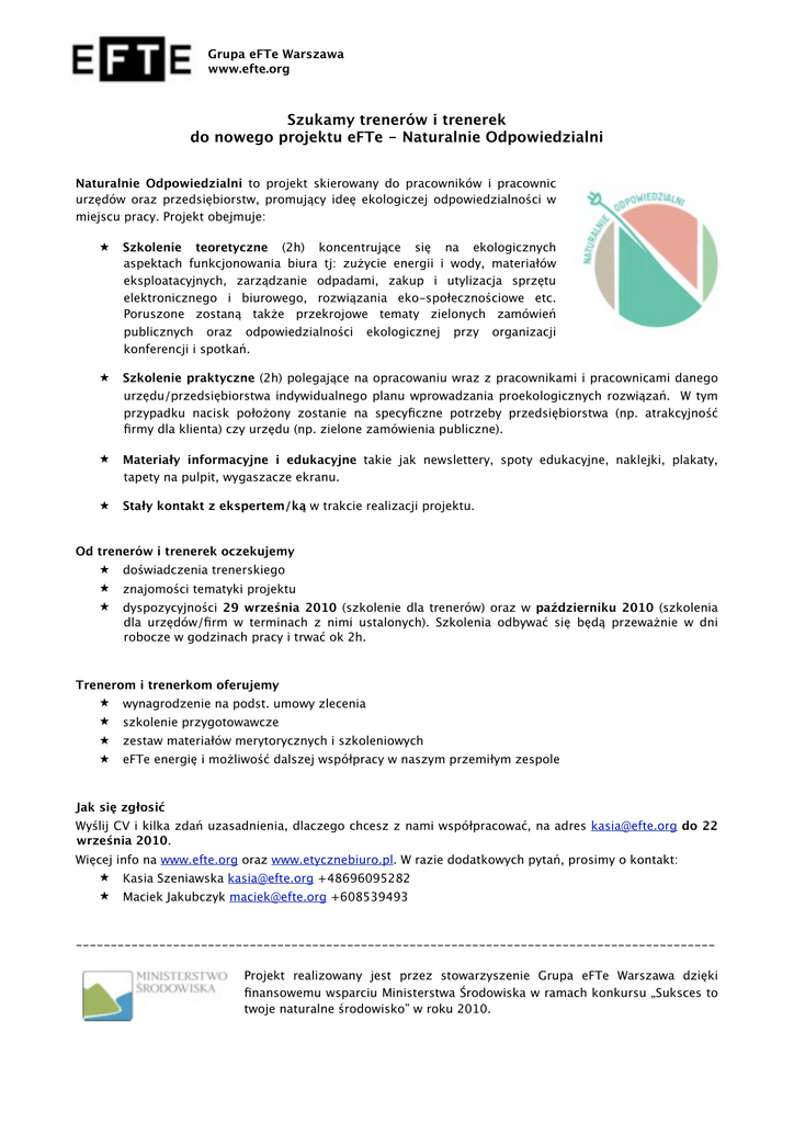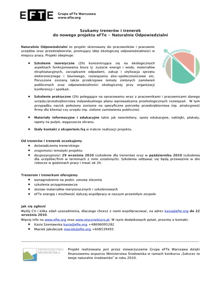 Grupa eFTe Warszawa www.efte.org Szukamy trenerów i trenerek do nowego projektu eFTe - Naturalnie Odpowiedzialni Naturalnie Odpowiedzialni to projekt skierowany do pracowników i pracownic urzędów oraz przedsiębiorstw, promujący ideę ekologiczej odpowiedzialności w miejscu pracy. Projekt obejmuje: ★ Szkolenie teoretyczne (2h) koncentrujące się na ekologicznych aspektach funkcjonowania biura tj: zużycie energii i wody, materiałów eksploatacyjnych, zarządzanie odpadami, zakup i utylizacja sprzętu elektronicznego i biurowego, rozwiązania eko-społecznościowe etc. Poruszone zostaną także przekrojowe tematy zielonych zamówień publicznych oraz odpowiedzialności ekologicznej przy organizacji konferencji i spotkań. ★ Szkolenie praktyczne (2h) polegające na opracowaniu wraz z pracownikami i pracownicami danego urzędu/przedsiębiorstwa indywidualnego planu wprowadzania proekologicznych rozwiązań. W tym przypadku nacisk położony zostanie na specyficzne potrzeby przedsiębiorstwa (np. atrakcyjność firmy dla klienta) czy urzędu (np. zielone zamówienia publiczne). ★ Materiały informacyjne i edukacyjne takie jak newslettery, spoty edukacyjne, naklejki, plakaty, tapety na pulpit, wygaszacze ekranu. ★ Stały kontakt z ekspertem/ką w trakcie realizacji projektu. Od trenerów i trenerek oczekujemy ★ doświadczenia trenerskiego ★ znajomości tematyki projektu ★ dyspozycyjności 29 września 2010 (szkolenie dla trenerów) oraz w październiku 2010 (szkolenia dla urzędów/firm w terminach z nimi ustalonych). Szkolenia odbywać się będą przeważnie w dni robocze w godzinach pracy i trwać ok 2h. Trenerom i trenerkom oferujemy ★ wynagrodzenie na podst. umowy zlecenia ★ szkolenie przygotowawcze ★ zestaw materiałów merytorycznych i szkoleniowych ★ eFTe energię i możliwość dalszej współpracy w naszym przemiłym zespole Jak się zgłosić Wyślij CV i kilka zdań uzasadnienia, dlaczego chcesz z nami współpracować, na adres [email protected] do 22 września 2010. Więcej info na www.efte.org oraz www.etycznebiuro.pl. W razie dodatkowych pytań, prosimy o kontakt: ★ Kasia Szeniawska [email protected] +48696095282 ★ Maciek Jakubczyk [email protected] +608539493 -------------------------------------------------------------------------------------------Projekt realizowany jest przez stowarzyszenie Grupa eFTe Warszawa dzięki finansowemu wsparciu Ministerstwa Środowiska w ramach konkursu „Suksces to twoje naturalne środowisko” w roku 2010.