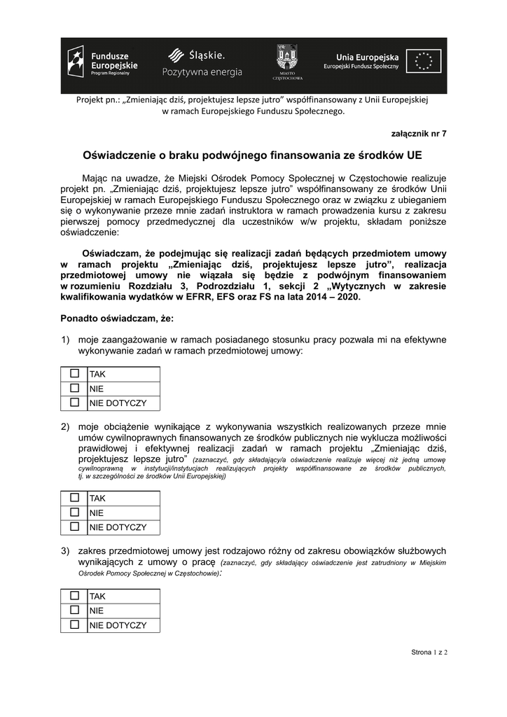 Projekt pn.: „Zmieniając dziś, projektujesz lepsze jutro” współfinansowany z Unii Europejskiej w ramach Europejskiego Funduszu Społecznego. załącznik nr 7 Oświadczenie o braku podwójnego finansowania ze środków UE Mając na uwadze, że Miejski Ośrodek Pomocy Społecznej w Częstochowie realizuje projekt pn. „Zmieniając dziś, projektujesz lepsze jutro” współfinansowany ze środków Unii Europejskiej w ramach Europejskiego Funduszu Społecznego oraz w związku z ubieganiem się o wykonywanie przeze mnie zadań instruktora w ramach prowadzenia kursu z zakresu pierwszej pomocy przedmedycznej dla uczestników w/w projektu, składam poniższe oświadczenie: Oświadczam, że podejmując się realizacji zadań będących przedmiotem umowy w ramach projektu „Zmieniając dziś, projektujesz lepsze jutro”, realizacja przedmiotowej umowy nie wiązała się będzie z podwójnym finansowaniem w rozumieniu Rozdziału 3, Podrozdziału 1, sekcji 2 „Wytycznych w zakresie kwalifikowania wydatków w EFRR, EFS oraz FS na lata 2014 – 2020. Ponadto oświadczam, że: 1) moje zaangażowanie w ramach posiadanego stosunku pracy pozwala mi na efektywne wykonywanie zadań w ramach przedmiotowej umowy: TAK NIE NIE DOTYCZY 2) moje obciążenie wynikające z wykonywania wszystkich realizowanych przeze mnie umów cywilnoprawnych finansowanych ze środków publicznych nie wyklucza możliwości prawidłowej i efektywnej realizacji zadań w ramach projektu „Zmieniając dziś, projektujesz lepsze jutro” (zaznaczyć, gdy składający/a oświadczenie realizuje więcej niż jedną umowę cywilnoprawną w instytucji/instytucjach realizujących tj. w szczególności ze środków Unii Europejskiej) projekty współfinansowane ze środków publicznych, TAK NIE NIE DOTYCZY 3) zakres przedmiotowej umowy jest rodzajowo różny od zakresu obowiązków służbowych wynikających z umowy o pracę (zaznaczyć, gdy składający oświadczenie jest zatrudniony w Miejskim Ośrodek Pomocy Społecznej w Częstochowie): TAK NIE NIE DOTYCZY Strona 1 z 2 4) w chwili obecnej moje zaangażowanie w realizację projektów współfinansowanych ze środków z funduszy strukturalnych i FS oraz działań finansowanych z innych źródeł nie przekracza miesięcznie 276 godzin (zaangażowanie etatowe i/lub zatrudnienie w ramach umów cywilnoprawnych): TAK NIE NIE DOTYCZY Jednocześnie zobowiązuje się do: 1) niezwłocznego poinformowania realizatora projektu „Zmieniając dziś projektujesz lepsze jutro” - Miejskiego Ośrodka Pomocy Społecznej w Częstochowie - o zmianie stanu faktycznego mogącego wpływać na uznanie realizacji zadań w ramach w/w projektu, jako niekwalifikowanych, tj. w przypadku podjęcia przeze mnie po dniu rozpoczęcia realizacji umowy zatrudnienia w projektach realizowanych w ramach EFS; 2) niezwłocznego poinformowania realizatora projektu „Zmieniając dziś projektujesz lepsze jutro”o innych okolicznościach mogących wpływać na uznanie realizacji zadań w ramach projektu za niekwalifikowane; 3) zwrotu na rzecz Miejskiego Ośrodka Pomocy Społecznej w Częstochowie pełnych kosztów poniesionych w związku z realizacją umowy zawartej w ramach projektu „Zmieniając dziś projektujesz lepsze jutro”, wraz z należnymi odsetkami liczonymi jak dla zaległości podatkowej, jeżeli treść powyższego oświadczenia nie odzwierciedlałaby stanu faktycznego, w wyniku czego koszty umowy na przeprowadzenie warsztatów rozwoju osobistego zostałyby uznane za niekwalifikowalne przez Instytucję Zarządzającą. Data i czytelny podpis Strona 2 z 2