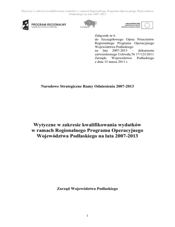Wytyczne w zakresie kwalifikowania wydatków w ramach Regionalnego Programu Operacyjnego Województwa Podlaskiego na lata 2007-2013 Załącznik nr 6 do Szczegółowego Opisu Priorytetów Regionalnego Programu Operacyjnego Województwa Podlaskiego na lata 2007-2013 – dokumentu zatwierdzonego Uchwałą Nr 17/123/2011 Zarządu Województwa Podlaskiego z dnia 15 marca 2011 r. Narodowe Strategiczne Ramy Odniesienia 2007-2013 Wytyczne w zakresie kwalifikowania wydatków w ramach Regionalnego Programu Operacyjnego Województwa Podlaskiego na lata 2007-2013 Zarząd Województwa Podlaskiego 1 Wytyczne w zakresie kwalifikowania wydatków w ramach Regionalnego Programu Operacyjnego Województwa Podlaskiego na lata 2007-2013 SPIS TREŚCI Rozdział 1 – Słowniczek pojęć i skrótów .................................................................................. 4 Rozdział 2 – Podstawa prawna................................................................................................... 6 Rozdział 3 – Zakres regulacji ..................................................................................................... 8 Rozdział 4 – Zasady kwalifikowania projektów ........................................................................ 9 4.1 4.2 4.3 Zasięg geograficzny kwalifikowalności ...................................................................... 9 Ocena kwalifikowalności projektu .............................................................................. 9 Trwałość projektu ........................................................................................................ 9 Rozdział 5 – Zasady kwalifikowania wydatków ...................................................................... 11 5.1 5.2 5.3 5.4 5.5 5.6 Horyzont czasowy kwalifikowalności ....................................................................... 11 Ocena kwalifikowalności wydatku ........................................................................... 11 Wydatki faktycznie poniesione ................................................................................. 12 Dokumentowanie wydatków ..................................................................................... 13 Zakaz podwójnego finansowania .............................................................................. 13 Projekty generujące dochód ...................................................................................... 14 Rozdział 6 – Szczegółowe zasady dotyczące kwalifikowania wydatków ............................... 15 6.1 Wydatki związane z przygotowaniem projektu ........................................................ 15 6.2 Wydatki związane z nadzorem budowlanym i autorskim ......................................... 15 6.3 Wydatki na usługi finansowe i zabezpieczenia ......................................................... 15 6.4 Wkład niepieniężny ................................................................................................... 16 6.5 Roboty budowlane i montażowe ............................................................................... 16 6.6 Zakup gruntu ............................................................................................................. 17 6.7 Zakup nieruchomości zabudowanej .......................................................................... 17 6.8 Zakup środków trwałych ........................................................................................... 17 6.9 Zakup wartości niematerialnych i prawnych ............................................................ 18 6.10 Amortyzacja .............................................................................................................. 18 6.11 Podatek od towarów i usług (VAT) .......................................................................... 19 6.12 Inne podatki i opłaty .................................................................................................. 19 6.13 Leasing i inne techniki finansowania nieruchomości, środków trwałych oraz wartości niematerialnych i prawnych .................................................................................... 19 6.14 Wydatki na instrumenty finansowe (dokapitalizowanie funduszy). ......................... 20 6.15 Działania informacyjne i promocyjne ....................................................................... 21 6.16 Pomoc techniczna ...................................................................................................... 21 6.17 Kary umowne/odszkodowania .................................................................................. 22 6.18 Audyt projektu........................................................................................................... 22 6.19 Wydatki osobowe ...................................................................................................... 22 Rozdział 7 – Wydatki niekwalifikowalne ................................................................................ 23 7.1 7.2 Wydatki niekwalifikowalne na mocy rozporządzeń WE .......................................... 23 Wydatki niekwalifikowalne określone w wytycznych krajowych i IZ RPOWP ..... 23 Rozdział 8 – Wykaz wydatków kwalifikowalnych i niekwalifikowalnych w poszczególnych osiach priorytetowych/działaniach Regionalnego Programu Operacyjnego Województwa Podlaskiego na lata 2007-2013 ................................................................................................ 24 8.1 Oś Priorytetowa I. Wzrost innowacyjności i wspieranie przedsiębiorczości w regionie 24 8.2 Oś Priorytetowa II. Rozwój infrastruktury transportowej ............................................... 39 8.3 Oś Priorytetowa III. Rozwój turystyki i kultury ............................................................. 44 2 Wytyczne w zakresie kwalifikowania wydatków w ramach Regionalnego Programu Operacyjnego Województwa Podlaskiego na lata 2007-2013 8.4 