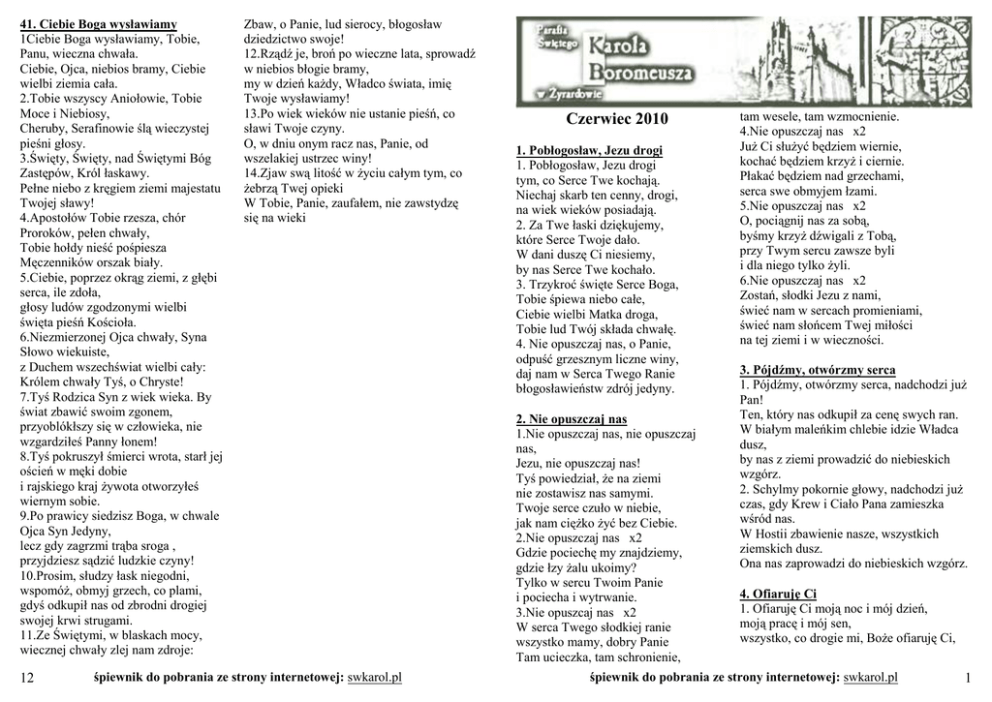 41. Ciebie Boga wysławiamy 1Ciebie Boga wysławiamy, Tobie, Panu, wieczna chwała. Ciebie, Ojca, niebios bramy, Ciebie wielbi ziemia cała. 2.Tobie wszyscy Aniołowie, Tobie Moce i Niebiosy, Cheruby, Serafinowie ślą wieczystej pieśni głosy. 3.Święty, Święty, nad Świętymi Bóg Zastępów, Król łaskawy. Pełne niebo z kręgiem ziemi majestatu Twojej sławy! 4.Apostołów Tobie rzesza, chór Proroków, pełen chwały, Tobie hołdy nieść pośpiesza Męczenników orszak biały. 5.Ciebie, poprzez okrąg ziemi, z głębi serca, ile zdoła, głosy ludów zgodzonymi wielbi święta pieśń Kościoła. 6.Niezmierzonej Ojca chwały, Syna Słowo wiekuiste, z Duchem wszechświat wielbi cały: Królem chwały Tyś, o Chryste! 7.Tyś Rodzica Syn z wiek wieka. By świat zbawić swoim zgonem, przyoblókłszy się w człowieka, nie wzgardziłeś Panny łonem! 8.Tyś pokruszył śmierci wrota, starł jej oścień w męki dobie i rajskiego kraj Ŝywota otworzyłeś wiernym sobie. 9.Po prawicy siedzisz Boga, w chwale Ojca Syn Jedyny, lecz gdy zagrzmi trąba sroga , przyjdziesz sądzić ludzkie czyny! 10.Prosim, słudzy łask niegodni, wspomóŜ, obmyj grzech, co plami, gdyś odkupił nas od zbrodni drogiej swojej krwi strugami. 11.Ze Świętymi, w blaskach mocy, wiecznej chwały zlej nam zdroje: 12 Zbaw, o Panie, lud sierocy, błogosław dziedzictwo swoje! 12.Rządź je, broń po wieczne lata, sprowadź w niebios błogie bramy, my w dzień kaŜdy, Władco świata, imię Twoje wysławiamy! 13.Po wiek wieków nie ustanie pieśń, co sławi Twoje czyny. O, w dniu onym racz nas, Panie, od wszelakiej ustrzec winy! 14.Zjaw swą litość w Ŝyciu całym tym, co Ŝebrzą Twej opieki W Tobie, Panie, zaufałem, nie zawstydzę się na wieki śpiewnik do pobrania ze strony internetowej: swkarol.pl Czerwiec 2010 1. Pobłogosław, Jezu drogi 1. Pobłogosław, Jezu drogi tym, co Serce Twe kochają. Niechaj skarb ten cenny, drogi, na wiek wieków posiadają. 2. Za Twe łaski dziękujemy, które Serce Twoje dało. W dani duszę Ci niesiemy, by nas Serce Twe kochało. 3. Trzykroć święte Serce Boga, Tobie śpiewa niebo całe, Ciebie wielbi Matka droga, Tobie lud Twój składa chwałę. 4. Nie opuszczaj nas, o Panie, odpuść grzesznym liczne winy, daj nam w Serca Twego Ranie błogosławieństw zdrój jedyny. 2. Nie opuszczaj nas 1.Nie opuszczaj nas, nie opuszczaj nas, Jezu, nie opuszczaj nas! Tyś powiedział, Ŝe na ziemi nie zostawisz nas samymi. Twoje serce czuło w niebie, jak nam cięŜko Ŝyć bez Ciebie. 2.Nie opuszczaj nas x2 Gdzie pociechę my znajdziemy, gdzie łzy Ŝalu ukoimy? Tylko w sercu Twoim Panie i pociecha i wytrwanie. 3.Nie opuszcaj nas x2 W serca Twego słodkiej ranie wszystko mamy, dobry Panie Tam ucieczka, tam schronienie, tam wesele, tam wzmocnienie. 4.Nie opuszczaj nas x2 JuŜ Ci słuŜyć będziem wiernie, kochać będziem krzyŜ i ciernie. Płakać będziem nad grzechami, serca swe obmyjem łzami. 5.Nie opuszczaj nas x2 O, pociągnij nas za sobą, byśmy krzyŜ dźwigali z Tobą, przy Twym sercu zawsze byli i dla niego tylko Ŝyli. 6.Nie opuszczaj nas x2 Zostań, słodki Jezu z nami, świeć nam w sercach promieniami, świeć nam słońcem Twej miłości na tej ziemi i w wieczności. 3. Pójdźmy, otwórzmy serca 1. Pójdźmy, otwórzmy serca, nadchodzi juŜ Pan! Ten, który nas odkupił za cenę swych ran. W białym maleńkim chlebie idzie Władca dusz, by nas z ziemi prowadzić do niebieskich wzgórz. 2. Schylmy pokornie głowy, nadchodzi juŜ czas, gdy Krew i Ciało Pana zamieszka wśród nas. W Hostii zbawienie nasze, wszystkich ziemskich dusz. Ona nas zaprowadzi do niebieskich wzgórz. 4. Ofiaruję Ci 1. Ofiaruję Ci moją noc i mój dzień, moją pracę i mój sen, wszystko, co drogie mi, BoŜe ofiaruję Ci, śpiewnik do pobrania ze strony internetowej: swkarol.pl 1 bo dla Ciebie ja Ŝyję, moim Królem jesteś Ty, to, co mam, wszystko ofiaruję Ci. 2. Panie Jezu, przyjm moją słabość i łzy i powroty do Twych drzwi i te chwile, gdy mi świat się zdaje tęczą lśnić, bo Ty drogę rozjaśniasz moją, jesteś światłem mym. Moje Ŝycie ja ofiaruję Ci. 3. Panie Jezu, weź kaŜdy wysiłek mój, kaŜdą pracę i znój, kaŜde dzieło mych rąk, kaŜdą myśl, kaŜdy krok. Pragnę sławić Twe imię poprzez wszystkie moje dni. Moje Ŝycie ja ofiaruję Ci. 5. O Miłosierny BoŜe 1. O Miłosierny BoŜe, co dajesz łaski zdrój, błagamy Cię w pokorze, ach, ratuj naród Twój. W cierpieniu, w kaŜdej dobie, gdy trwogi przyjdzie czas, Jezu, ufamy Tobie, Ŝe nie opuścisz nas. 2. O Miłosierny BoŜe, o dobry Ojcze nasz, błagamy Cię w pokorze, zwróć na nas świętą twarz. O Jezu Miłosierny, przyjmij ten rzewny śpiew, niech grzechy nasze zmyje Twa Przenajświętsza Krew. 6. Kłaniam się Tobie 1. Kłaniam się Tobie, Przedwieczny BoŜe, którego niebo pojąć nie moŜe. Ja, proch mizerny, przed Twą moŜnością 2 z wojskiem Aniołów klękam z radością. 2. Tu Stwórcę mego wiarą wyznaję, kocham serdecznie, pokłon oddaję. Cieszę się wielce z Twej Boskiej chwały, niech Ci się kłania z niebem świat cały. 3. Dziękuję za to, Ŝeś się zostawił w tym Sakramencie, abyś nas zbawił. Za Twoje łaski tu wyświadczone odbieraj od nas serca skruszone. 4. Przed tronem Twoim serca składamy, oto pokornie wszyscy wołamy: „Błogosław, Panie, swemu stworzeniu, broń od nieszczęścia, ciesz w utrapieniu”. zespoleni z Nim. 3.On przez Ŝycie nas prowadzi, strzeŜe naszych dróg. Więc przestąpmy z dziękczynieniem świątyń Pańskich próg. 7. Cały świat jest pełny Twej miłości 1.Cały świat jest pełny Twej miłości I dobroci pełny kaŜdy dzień. KaŜda chwila jest pełna radości, Gdy szukamy Cię wśród Ŝycia mgieł. Naucz nas Ŝyć Twoim Ŝyciem, Panie, naucz, Ŝe drogą jesteś właśnie Ty. Naucz, Ŝe prawdy w Tobie trzeba szukać, bo drogą, prawdą, Ŝyciem jesteś Ty. 2.Twej miłości nie zamkną puste słowa, Bo bez czynów martwe, próŜne są.