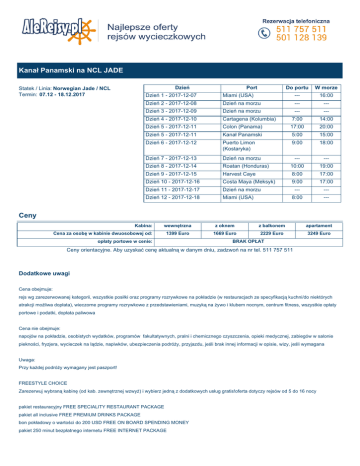 Kanał Panamski na NCL JADE Dzień Statek / Linia: Norwegian Jade / NCL Termin: 07.12 - 18.12.2017 Do portu W morze Dzień 1 - 2017-12-07 Miami (USA) Port --- 16:00 Dzień 2 - 2017-12-08 Dzień na morzu --- --- Dzień 3 - 2017-12-09 Dzień na morzu --- --- Dzień 4 - 2017-12-10 Cartagena (Kolumbia) 7:00 14:00 Dzień 5 - 2017-12-11 Colon (Panama) 17:00 20:00 Dzień 5 - 2017-12-11 Kanał Panamski 5:00 15:00 Dzień 6 - 2017-12-12 Puerto Limon (Kostaryka) 9:00 18:00 Dzień 7 - 2017-12-13 Dzień na morzu --- --- Dzień 8 - 2017-12-14 Roatan (Honduras) 10:00 19:00 Dzień 9 - 2017-12-15 Harvest Caye 8:00 17:00 Dzień 10 - 2017-12-16 Costa Maya (Meksyk) 9:00 17:00 Dzień 11 - 2017-12-17 Dzień na morzu --- --- Dzień 12 - 2017-12-18 Miami (USA) 8:00 --- Ceny Kabina: wewnętrzna z oknem z balkonem apartament 1399 Euro 1669 Euro 2229 Euro 3249 Euro Cena za osobę w kabinie dwuosobowej od: opłaty portowe w cenie: BRAK OPŁAT Ceny orientacyjne. Aby uzyskać cenę aktualną w danym dniu, zadzwoń na nr tel. 511 757 511 Dodatkowe uwagi Cena obejmuje: rejs wg zarezerwowanej kategorii, wszystkie posiłki oraz programy rozrywkowe na pokładzie (w restauracjach ze specyfikacją kuchni/do niektórych atrakcji możliwa dopłata), wieczorne programy rozrywkowe z przedstawieniami, muzyką na żywo i klubem nocnym, centrum fitness, wszystkie opłaty portowe i podatki, dopłata paliwowa Cena nie obejmuje: napojów na pokładzie, osobistych wydatków, programów fakultatywnych, pralni i chemicznego czyszczenia, opieki medycznej, zabiegów w salonie piekności, fryzjera, wycieczek na lądzie, napiwków, ubezpieczenia podróży, przyjazdu, jeśli brak innej informacji w opisie, wizy, jeśli wymagana Uwaga: Przy każdej podróży wymagany jest paszport! FREESTYLE CHOICE Zarezerwuj wybraną kabinę (od kab. zewnętrznej wzwyż) i wybierz jedną z dodatkowych usług gratis!oferta dotyczy rejsów od 5 do 16 nocy pakiet restauracyjny FREE SPECIALITY RESTAURANT PACKAGE pakiet all inclusive FREE PREMIUM DRINKS PACKAGE bon pokładowy o wartości do 200 USD FREE ON BOARD SPENDING MONEY pakiet 250 minut bezpłatnego internetu FREE INTERNET PACKAGE Przy rezerwacji wyższych kategorii (suite lub heaven) wszystkie usługi zawarte w cenie! Norwegian Jade Norwegian Jade Tonaż: 93.502 ton Rok budowy: 2006 Długość: 295 m Szerokość: 33 m Szybkość: 25 węzłów Pokłady pasażerskie: 12 Załoga: 1.154 Pasażerowie: 2.394 Basen: 2 (4 jacuzzi, basen dla dzieci) Waluta: USD Do dyspozycji: restauracje, bary, kasyno, dyskoteka, sala widowiskowa, salon odnowy biologicznej, fitness center, sauna, jacuzzi, boisko i trasa do joggingu, kort tenisowy oraz do gry w koszykówkę i siatkówkę, salon piękności, pokój zabaw dla dzieci, punkt medyczny, biblioteka, kawiarenka internetowa, 2 symulatory do gry w golfa, sala gier video, butiki, kaplica, muzeum, galeria. Kabiny: łazienka (prysznic, wc, suszarka), klimatyzacja, radio pokładowe, telefon do użytku wewnętrznego, sejf, TV, lodówka. Większość kabin ma 2 pojedyncze łóżka, które na zamówienie można połączyć w 1 podwójne. Opis kabin typu suite i apartamentów na zapytanie.