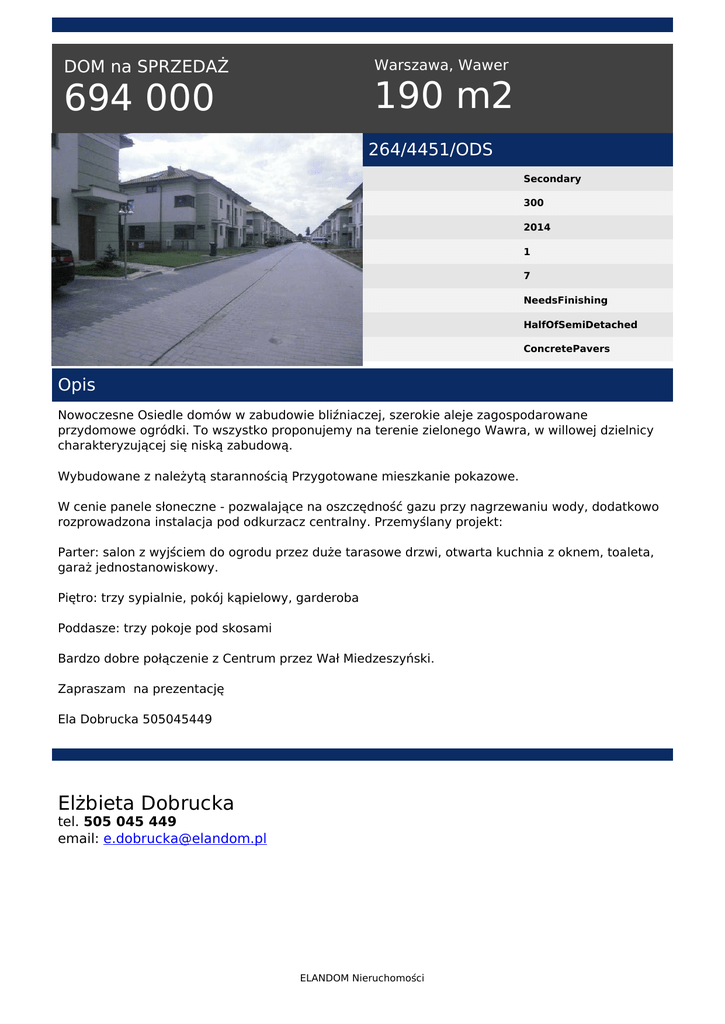Warszawa, Wawer DOM na SPRZEDAŻ 190 m2 694 000 264/4451/ODS Secondary 300 2014 1 7 NeedsFinishing HalfOfSemiDetached ConcretePavers Opis Nowoczesne Osiedle domów w zabudowie bliźniaczej, szerokie aleje zagospodarowane przydomowe ogródki. To wszystko proponujemy na terenie zielonego Wawra, w willowej dzielnicy charakteryzującej się niską zabudową. Wybudowane z należytą starannością Przygotowane mieszkanie pokazowe. W cenie panele słoneczne - pozwalające na oszczędność gazu przy nagrzewaniu wody, dodatkowo rozprowadzona instalacja pod odkurzacz centralny. Przemyślany projekt: Parter: salon z wyjściem do ogrodu przez duże tarasowe drzwi, otwarta kuchnia z oknem, toaleta, garaż jednostanowiskowy. Piętro: trzy sypialnie, pokój kąpielowy, garderoba Poddasze: trzy pokoje pod skosami Bardzo dobre połączenie z Centrum przez Wał Miedzeszyński. Zapraszam na prezentację Ela Dobrucka 505045449 Elżbieta Dobrucka tel. 505 045 449 email: [email protected] ELANDOM Nieruchomości Powered by TCPDF (www.tcpdf.org)