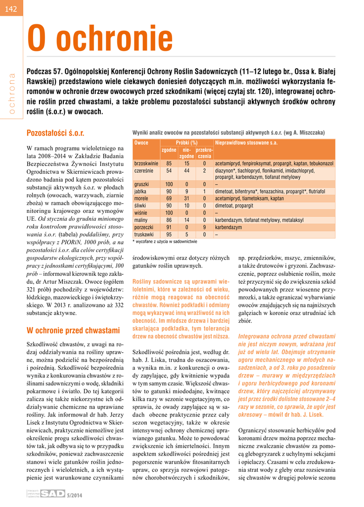 142 ochrona O ochronie Podczas 57. Ogólnopolskiej Konferencji Ochrony Roślin Sadowniczych (11–12 lutego br., Ossa k. Białej Rawskiej) przedstawiono wiele ciekawych doniesień dotyczących m.in. możliwości wykorzystania feromonów w ochronie drzew owocowych przed szkodnikami (więcej czytaj str. 120), integrowanej ochronie roślin przed chwastami, a także problemu pozostałości substancji aktywnych środków ochrony roślin (ś.o.r.) w owocach. Pozostałości ś.o.r. W ramach programu wieloletniego na lata 2008–2014 w Zakładzie Badania Bezpieczeństwa Żywności Instytutu Ogrodnictwa w Skierniewicach prowadzono badania pod kątem pozostałości substancji aktywnych ś.o.r. w płodach rolnych (owocach, warzywach, ziarnie zboża) w ramach obowiązującego monitoringu krajowego oraz wymogów UE. Od stycznia do grudnia minionego roku kontrolom prawidłowości stosowania ś.o.r. (tabela) poddaliśmy, przy współpracy z PIORiN, 1000 prób, a na pozostałości ś.o.r. dla celów certyfikacji gospodarstw ekologicznych, przy współpracy z jednostkami certyfikującymi, 100 prób – informował kierownik tego zakładu, dr Artur Miszczak. Owoce (ogółem 321 prób) pochodziły z województw: łódzkiego, mazowieckiego i świętokrzyskiego. W 2013 r. analizowano aż 332 substancje aktywne. W ochronie przed chwastami Szkodliwość chwastów, z uwagi na rodzaj oddziaływania na rośliny uprawne, można podzielić na bezpośrednią i pośrednią. Szkodliwość bezpośrednia wynika z konkurowania chwastów z roślinami sadowniczymi o wodę, składniki pokarmowe i światło. Do tej kategorii zalicza się także niekorzystne ich oddziaływanie chemiczne na uprawiane rośliny. Jak informował dr hab. Jerzy Lisek z Instytutu Ogrodnictwa w Skierniewicach, praktycznie niemożliwe jest określenie progu szkodliwości chwastów tak, jak odbywa się to w przypadku szkodników, ponieważ zachwaszczenie stanowi wiele gatunków roślin jednorocznych i wieloletnich, a ich wystąpienie jest warunkowane czynnikami 5/2014 Wyniki analiz owoców na pozostałości substancji aktywnych ś.o.r. (wg A. Miszczaka) Owoce Próbki (%) Nieprawidłowo stosowane s.a. zgodne nie- przekrozgodne czenia brzoskwinie 85 15 0 acetamipryd, fenpiroksymat, propargit, kaptan, tebukonazol czereśnie 54 44 2 diazynon*, tiachlopryd, flonikamid, imidachlopryd, propargit, karbendazym, tiofanat metylowy gruszki 100 0 0 – jabłka 90 9 1 dimetoat, bifentryna*, fenazachina, propargit*, flutriafol morele 69 31 0 acetamipryd, tiametoksam, kaptan śliwki 90 10 0 dimetoat, propargit wiśnie 100 0 0 – maliny 86 14 0 karbendazym, tiofanat metylowy, metalaksyl porzeczki 91 0 9 karbendazym truskawki 95 5 0 – * wycofane z użycia w sadownictwie środowiskowymi oraz dotyczy różnych gatunków roślin uprawnych. Rośliny sadownicze są uprawami wieloletnimi, które w zależności od wieku, różnie mogą reagować na obecność chwastów. Również podkładki i odmiany mogą wykazywać inną wrażliwość na ich obecność. Im młodsze drzewa i bardziej skarlająca podkładka, tym tolerancja drzew na obecność chwastów jest niższa. Szkodliwość pośrednia jest, według dr. hab. J. Liska, trudna do oszacowania, a wynika m.in. z konkurencji o owady zapylające, gdy kwitnienie wypada w tym samym czasie. Większość chwastów to gatunki miododajne, kwitnące kilka razy w sezonie wegetacyjnym, co sprawia, że owady zapylające są w sadach obecne praktycznie przez cały sezon wegetacyjny, także w okresie intensywnej ochrony chemicznej uprawianego gatunku. Może to powodować zwiększenie ich śmiertelności. Innym aspektem szkodliwości pośredniej jest pogorszenie warunków fitosanitarnych upraw, co sprzyja rozwojowi patogenów chorobotwórczych i szkodników, np. przędziorków, mszyc, zmienników, a także drutowców i gryzoni. Zachwaszczenie, poprzez osłabienie roślin, może też przyczynić się do zwiększenia szkód powodowanych przez wiosenne przymrozki, a także ograniczać wybarwianie owoców znajdujących się na najniższych gałęziach w koronie oraz utrudniać ich zbiór. Integrowana ochrona przed chwastami nie jest niczym nowym, wdrażana jest już od wielu lat. Obejmuje utrzymanie ugoru mechanicznego w młodych nasadzeniach, a od 3. roku po posadzeniu drzew – murawy w międzyrzędziach i ugoru herbicydowego pod koronami drzew, który najczęściej utrzymywany jest przez środki dolistne stosowane 2–4 razy w sezonie, co sprawia, że ugór jest okresowy – mówił dr hab. J. Lisek. Ograniczyć stosowanie herbicydów pod koronami drzew można poprzez mechaniczne zwalczanie chwastów za pomocą glebogryzarek z uchylnymi sekcjami i opielaczy. Czasami w celu zredukowania strat wody z gleby oraz rozsiewania się chwastów w drugiej połowie sezonu 143 wegetacyjnego, wystarczające okazuje się koszenie chwastów pod koronami drzew, co także można całkowicie zmechanizować. Kolejną możliwość ograniczenia zachwaszczenia pod koronami drzew bez użycia herbicydów daje ściółkowanie gleby. Jednak, jak zaznaczył dr hab. J. Lisek, ma ono pewne wady. Ściółki są łatwo przerastane przez chwasty trwałe, mają ograniczoną żywotność, wymuszają zmiany w dawkowaniu lub sposobie nawożenia, stanowią schronienie dla gryzoni (słoma), a ich utylizacja, np. w przypadku ściółek syntetycznych, nastręcza problemów. Wdrażanie niechemicznych metod regulacji zachwaszczenia jest kosztowne, np. włóknina polipropylenowa to wydatek około 15 000 zł/ha, kora drzewna – 35 000 zł/ha. Nadal najtańsza jest chemiczna metoda walki z chwastami, gdyż stanowi koszt około 1800 zł/ha. Dobór herbicydów zarejestrowanych do ochrony przed chwastami upraw sadowniczych obejmuje 7 substancji aktywnych, z czego jedna (propyzamid) jest doglebowa (Kerb 50 WP). Pozostałe to środki dolistne. Najliczniejsza grupa środków zawiera glifosat. Kolejna grupa to herbicydy zawierające MCPA (Chwastox Extra 300 SL), inna – gotowa mieszanina 