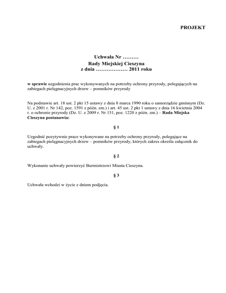 PROJEKT Uchwała Nr ……… Rady Miejskiej Cieszyna z dnia ……………… 2011 roku w sprawie uzgodnienia prac wykonywanych na potrzeby ochrony przyrody, polegających na zabiegach pielęgnacyjnych drzew – pomników przyrody Na podstawie art. 18 ust. 2 pkt 15 ustawy z dnia 8 marca 1990 roku o samorządzie gminnym (Dz. U. z 2001 r. Nr 142, poz. 1591 z późn. zm.) i art. 45 ust. 2 pkt 1 ustawy z dnia 16 kwietnia 2004 r. o ochronie przyrody (Dz. U. z 2009 r. Nr 151, poz. 1220 z późn. zm.) – Rada Miejska Cieszyna postanawia: §1 Uzgodnić pozytywnie prace wykonywane na potrzeby ochrony przyrody, polegające na zabiegach pielęgnacyjnych drzew – pomników przyrody, których zakres określa załącznik do uchwały. §2 Wykonanie uchwały powierzyć Burmistrzowi Miasta Cieszyna. §3 Uchwała wchodzi w życie z dniem podjęcia. Załącznik do uchwały Nr …………… Rady Miejskiej Cieszyna z dnia ………………. 2011 roku Zestawienie drzew – pomników przyrody przewidzianych do zabiegów pielęgnacyjnych. Lp. 1. Pomnik przyrody: gatunek drzewa / obwód pnia jesion wyniosły o obwodzie pnia 415/110 cm Lokalizacja Podstawa prawna objęcia ochroną Zakres zabiegów konserwatorskich Góra Zamkowa, w pobliżu budynku nr 3c rozporządzenie Nr 6/93 Wojewody Bielskiego z dnia 22 grudnia 1993 r. (Dz. U. Woj. Bielskiego z 1994 r. Nr 15, poz. 89) usunięcie posuszu oraz gałęzi w szczytowej partii korony, grożących złamaniem się na dach budynku nr 3c 2. kasztanowiec żółty o obwodzie pnia 258+168 cm Góra Zamkowa, w rejonie murawy szczytowej rozporządzenie Nr 22/98 Wojewody Bielskiego z dnia 16 listopada 1998 r. (Dz. U. Woj. Bielskiego z 1998 r. Nr 20, poz. 346) założenie wiązania elastycznego 3. klon srebrzysty o obwodzie pnia 404 cm Pl. Wolności 7b, przy budynku Liceum Ogólnokształcącego im. M. Kopernika, od strony ul. Stalmacha rozporządzenie Nr 7/92 Wojewody Bielskiego z dnia 28 grudnia 1992 r. (Dz. U. Woj. Bielskiego z 1993 r. Nr 1, poz. 1) usunięcie posuszu 4. klon polny o obwodzie pnia 254 cm Park Kościelny (przy kościele Jezusowym) usunięcie posuszu oraz gałęzi nadłamanych i porażonych w obrębie całej korony 5. sosna wejmutka trzy drzewa o obwodach pni 156, 195, 203 cm rozporządzenie Nr 22/98 Wojewody Bielskiego z dnia 16 listopada 1998 r. (Dz. U. Woj. Bielskiego z 1998 r. Nr 20, poz. 346) 6. kasztanowiec biały sześć drzew o obwodach pni 358, 275, 386, 392, 347, 311 cm usunięcie gałęzi zamarłych i porażonych rdzą wejmutkowo-porzeczkową usunięcie posuszu oraz gałęzi nadłamanych i porażonych w szczytowych partiach koron