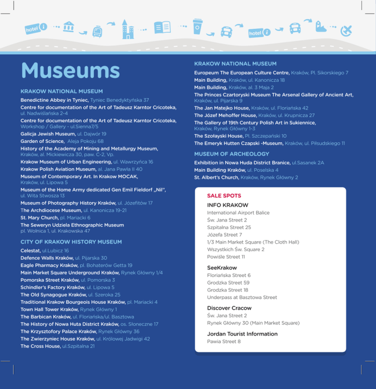 Museums KRAKOW NATIONAL MUSEUM Benedictine Abbey in Tyniec, Tyniec Benedyktyńska 37 Centre for documentation of the Art of Tadeusz Karntor Cricoteka, ul. Nadwiślańska 2-4 Centre for documentation of the Art of Tadeusz Karntor Cricoteka, Workshop / Gallery - ul.Sienna7/5 Galicja Jewish Museum, ul. Dajwór 19 Garden of Science, Aleja Pokoju 68 History of the Academy of Mining and Metallurgy Museum, Kraków, al. Mickiewicza 30, paw. C-2, Vp. Krakow Museum of Urban Engineering, ul. Wawrzyńca 16 Krakow Polish Aviation Museum, al. Jana Pawła II 40 Museum of Contemporary Art. In Krakow MOCAK, Kraków, ul. Lipowa 5 Museum of the Home Army dedicated Gen Emil Fieldorf „Nil”, ul. Wita Stwosza 13 Museum of Photography History Kraków, ul. Józefitów 17 The Archdiocese Museum, ul. Kanonicza 19-21 St. Mary Church, pl. Mariacki 6 The Seweryn Udziela Ethnographic Museum pl. Wolnica 1, ul. Krakowska 47 CITY OF KRAKOW HISTORY MUSEUM Celestat, ul.Lubicz 16 Defence Walls Kraków, ul. Pijarska 30 Eagle Pharmacy Kraków, pl. Bohaterów Getta 19 Main Market Square Underground Kraków, Rynek Główny 1/4 Pomorska Street Kraków, ul. Pomorska 3 Schindler’s Factory Kraków, ul. Lipowa 5 The Old Synagogue Kraków, ul. Szeroka 25 Traditional Krakow Bourgeois House Kraków, pl. Mariacki 4 Town Hall Tower Kraków, Rynek Główny 1 The Barbican Kraków, ul. Floriańska/ul. Basztowa The History of Nowa Huta District Kraków, os. Słoneczne 17 The Krzysztofory Palace Kraków, Rynek Główny 36 The Zwierzyniec House Kraków, ul. Królowej Jadwigi 42 The Cross House, ul.Szpitalna 21 KRAKOW NATIONAL MUSEUM Europeum The European Culture Centre, Kraków, Pl. Sikorskiego 7 Main Building, Kraków, ul. Kanonicza 18 Main Building, Kraków, al. 3 Maja 2 The Princes Czartoryski Museum The Arsenal Gallery of Ancient Art, Kraków, ul. Pijarska 9 The Jan Matejko House, Kraków, ul. Floriańska 42 The Józef Mehoffer House, Kraków, ul. Krupnicza 27 The Gallery of 19th Century Polish Art in Sukiennice, Kraków, Rynek Główny 1-3 The Szołayski House, Pl. Szczepański 10 The Emeryk Hutten Czapski -Museum, Kraków, ul. Piłsudskiego 11 MUSEUM OF ARCHEOLOGY Exhibition in Nowa Huda District Branice, ul.Sasanek 2A Main Building Kraków, ul. Poselska 4 St. Albert’s Church, Kraków, Rynek Główny 2 SALE SPOTS INFO KRAKOW International Airport Balice Św. Jana Street 2 Szpitalna Street 25 Józefa Street 7 1/3 Main Market Square (The Cloth Hall) Wszystkich Św. Square 2 Powiśle Street 11 SeeKrakow Floriańska Street 6 Grodzka Street 59 Grodzka Street 18 Underpass at Basztowa Street Discover Cracow Św. Jana Street 2 Rynek Główny 30 (Main Market Square) Jordan Tourist Information Pawia Street 8