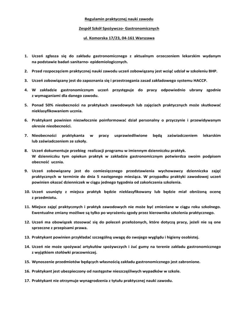 Regulamin praktycznej nauki zawodu Zespół Szkół Spożywczo- Gastronomicznych ul. Komorska 17/23, 04-161 Warszawa 1. Uczeń zgłasza się do zakładu gastronomicznego z aktualnym orzeczeniem lekarskim wydanym na podstawie badań sanitarno- epidemiologicznych. 2. Przed rozpoczęciem praktycznej nauki zawodu uczeń zobowiązany jest wziąć udział w szkoleniu BHP. 3. Uczeń zobowiązany jest do zapoznania się i przestrzegania zasad zakładowego systemu HACCP. 4. W zakładzie gastronomicznym uczeń przystępuje do pracy odpowiednio ubrany zgodnie z wymaganiami dla danego zawodu. 5. Ponad 50% nieobecności na praktykach zawodowych lub zajęciach praktycznych może skutkować nieklasyfikowaniem ucznia. 6. Praktykant powinien niezwłocznie poinformować dział personalny o przyczynie i przewidywanym okresie nieobecności. 7. Nieobecności praktykanta w lub zaświadczeniem ze szkoły. pracy usprawiedliwione będą zaświadczeniem lekarskim 8. Uczeń dokumentuje przebieg realizacji programu w imiennym dzienniczku praktyk. W dzienniczku tym opiekun praktyk w zakładzie gastronomicznym potwierdza swoim podpisem obecność ucznia. 9. Uczeń zobowiązany jest do comiesięcznego przedstawienia wychowawcy dzienniczka zajęć praktycznych w terminie do dnia 5 następnego miesiąca. W przypadku praktyki zawodowej uczeń powinien okazać dzienniczek w ciągu jednego tygodnia od zakończenia szkolenia. 10. Uczeń usunięty z miejsca praktyk będzie nieklasyfikowany lub będzie miał obniżoną ocenę z przedmiotu. 11. Miejsce zajęć praktycznych i praktyk zawodowych nie może być zmieniane w ciągu roku szkolnego. Ewentualne zmiany możliwe są tylko po wyrażeniu zgody przez kierownika szkolenia praktycznego. 12. Uczeń ma obowiązek stosować się do poleceń przełożonych, które dotyczą pracy, jeżeli nie są one sprzeczne z przepisami prawa. 13. Praktykant powinien przykładać szczególną uwagę do swojego wyglądu i higieny osobistej. 14. Uczeń nie może spożywać artykułów spożywczych i żuć gumy na terenie zakładu gastronomicznego z wyjątkiem stołówki pracowniczej. 15. Wynoszenie przedmiotów będących własnością zakładu gastronomicznego jest zabronione. 16. Praktykant jest ubezpieczony od następstw nieszczęśliwych wypadków w szkole. 17. Praktykant nie otrzymuje wynagrodzenia z tytułu praktycznej nauki zawodu.