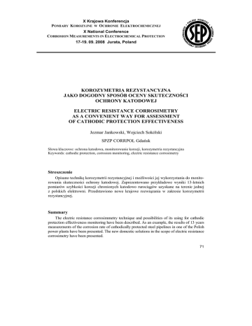 X Krajowa Konferencja POMIARY KOROZYJNE W OCHRONIE ELEKTROCHEMICZNEJ X National Conference CORROSION MEASUREMENTS IN ELECTROCHEMICAL PROTECTION 17-19. 09. 2008 Jurata, Poland KOROZYMETRIA REZYSTANCYJNA JAKO DOGODNY SPOSÓB OCENY SKUTECZNOŚCI OCHRONY KATODOWEJ ELECTRIC RESISTANCE CORROSIMETRY AS A CONVENIENT WAY FOR ASSESSMENT OF CATHODIC PROTECTION EFFECTIVENESS Jezmar Jankowski, Wojciech Sokólski SPZP CORRPOL Gdańsk Słowa kluczowe: ochrona katodowa, monitorowanie korozji, korozymetria rezystancyjna Keywords: cathodic protection, corrosion monitoring, electric resistance corrosimetry Streszczenie Opisano technikę korozymetrii rezystancyjnej i możliwości jej wykorzystania do monitorowania skuteczności ochrony katodowej. Zaprezentowano przykładowe wyniki 13-letnich pomiarów szybkości korozji chronionych katodowo rurociągów uzyskane na terenie jednej z polskich elektrowni. Przedstawiono nowe krajowe rozwiązania w zakresie korozymetrii rezystancyjnej. Summary The electric resistance corrosimmetry technique and possibilities of its using for cathodic protection effectiveness monitoring have been described. As an example, the results of 13 years measurements of the corrosion rate of cathodically protected steel pipelines in one of the Polish power plants have been presented. The new domestic solutions in the scope of electric resistance corrosimetry have been presented. 71 1. Wprowadzenie Elektrody symulujące, sondy korozyjne i czujniki korozymetryczne rezystancyjne znajdują w ostatnich latach coraz szersze zastosowanie jako precyzyjne i wiarygodne narzędzia do monitorowania skuteczności ochrony katodowej w zróżnicowanych warunkach środowiskowych. Odzwierciedleniem tego trendu może być rosnąca liczba publikacji zagranicznych (np. 1–4] i krajowych [5–9] poświęconych zagadnieniom monitorowania ochrony katodowej z wykorzystaniem różnego rodzaju tego rodzaju elementów. Ich wspólną cechą jest to, że posiadając zdefiniowane wymiary geometryczne i lokalizację w bezpośrednim sąsiedztwie chronionej konstrukcji, połączone są z nią za pomocą kontrolowanego złącza elektrycznego, co z jednej strony zapewnia analogiczne warunki eksploatacji, a z drugiej umożliwia wykonanie różnego rodzaju badań elektrochemicznych i elektrycznych jak na wydzielonej gołej powierzchni metalowej tej konstrukcji. Milczącym założeniem wszystkich tych technik jest to, że – wskutek połączenia elektrycznego elektrody z konstrukcją - zjawiska elektrochemiczne przebiegające na powierzchniach metalowych w kontakcie z otaczającym środowiskiem są identyczne. Szczególną pozycję zajmują rezystancyjne czujniki korozymetryczne, które jako jedne z nielicznych pozwalają monitorować bezpośrednio ubytki korozyjne metalu w warunkach ochrony elektrochemicznej, a zatem kontrolować ilościowo szybkość korozji zabezpieczanych konstrukcji. Aktualny stan techniki korozymetrii rezystancyjnej został ujęty m.in. w opracowywanym raporcie NACE International [10], zaś niektóre zalecenia i uwarunkowania w normie [11]. W literaturze anglojęzycznej czujniki tego typu określane są najczęściej jako Electrical Resistance Soil Corrosion Probes (ER SCP). Współczesne normy europejskie PN-EN 12954 i PN-EN 13636 [12, 13] oraz międzynarodowa ISO 15589-1 [14] wyraźnie sugerują wykorzystanie technik korozymetrycznych w ocenie skuteczności ochrony katodowej. Normy te ustanawiają, że zadawalającym stopniem ochrony katodowej konstrukcji podziemnych i podwodnych jest ograniczenie ich szybkości korozji do wartości dopuszczalnej, którą przyjęto umownie jako mniejszą niż 0,01 mm/rok. Być może już w niedalekiej przyszłości użytkownicy instalacji ochrony katodowej będą zobligowani do wykazania, oprócz wykonania typowych pomiarów potencjału zabezpieczanej konstrukcji, iż osiągnięty stopień polaryzacji konstrukcji jest faktycznie wystarczający do obniżenia szybkości korozji poniżej dopuszczalnego poziomu, a możliwości takie zapewnia właśnie w dogodny sposób korozymetria rezystancyjna. Ponieważ podstawowym celem ochrony katodowej jest zabezpieczenie przeciwkorozyjne podziemnych lub podwodnych konstrukcji metalowych, rola korozymetrii powoli staje się pierwszoplanowa. Wykorzystywane dotychczas różnego rodzaju kryteria ochrony katodowej, oparte na technikach pomiarów elektrycznych, które upowszechniły się ze względu na brak możliwości technicznych bezpośredniego śledzenia postępu procesu korozyjnego, będą ulegały stopniowo zanikowi i ustąpią miejsce metodom korozymetrycznym (obecnie technice rezystometrycznej). 2. Uwarunkowania techniki pomiarowej W technice ochrony katodowej mogą być obecnie wykorzystywane zasadniczo dwie techniki monitorowania szybkości korozji: – korozymetria kuponowa, – korozymetria rezystancyjna. 72 Inne, bardziej nowoczesne techniki elektrochemiczne, jak np. spektroskopia impedancyjna, analiza harmoniczna, czy techniki szumowe – znajdują się jeszcze w fazie badań i nie mogą być stosowane rutynowo do kontroli szybkości korozji konstrukcji polaryzowanych w warunkach technicznych. Zasada monitorowania skuteczności ochrony katodowej techniką korozymetryczną polega na ekspozycji w środowisku korozyjnym (ziemi, wodzie, betonie) próbki metalowej połączonej elektrycznie z chronioną katodowo konstrukcją (umieszczonej możliwie blisko chronionej katodowo powierzchni), a następnie po ustalonym czasie określenie ubytków masy tej próbki. Zamiast ważenia wygodniej jest określać zmniejszenie wymiarów próbki za pomocą czułych pomiarów elektrycznych. Ubytek korozyjny metalu wiąże się ze wzrostem rezystancji elektrycznej próbki, którą można mierzyć zdalnie bez konieczności wydobywania próbki ze środowiska korozyjnego. W celu wyeliminowania wpływu temperatury mierzy się najczęściej przyrost rezystancji elementu podlegającego korozji w stosunku do takiego samego elementu osłoniętego prze