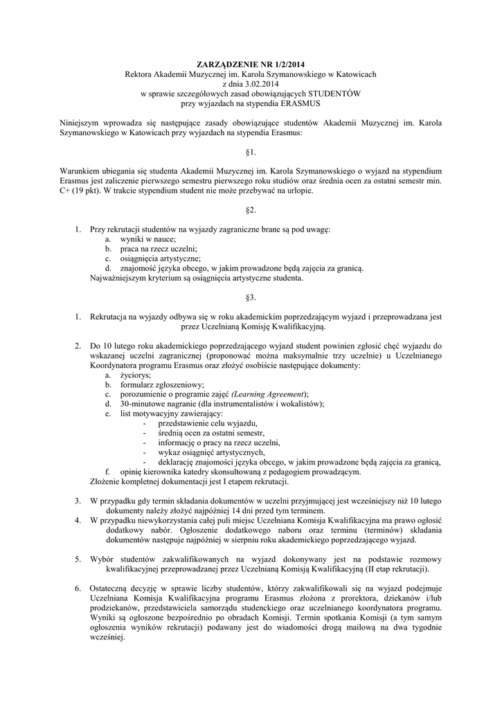 ZARZĄDZENIE NR 1/2/2014 Rektora Akademii Muzycznej im. Karola Szymanowskiego w Katowicach z dnia 3.02.2014 w sprawie szczegółowych zasad obowiązujących STUDENTÓW przy wyjazdach na stypendia ERASMUS Niniejszym wprowadza się następujące zasady obowiązujące studentów Akademii Muzycznej im. Karola Szymanowskiego w Katowicach przy wyjazdach na stypendia Erasmus: §1. Warunkiem ubiegania się studenta Akademii Muzycznej im. Karola Szymanowskiego o wyjazd na stypendium Erasmus jest zaliczenie pierwszego semestru pierwszego roku studiów oraz średnia ocen za ostatni semestr min. C+ (19 pkt). W trakcie stypendium student nie może przebywać na urlopie. §2. 1. Przy rekrutacji studentów na wyjazdy zagraniczne brane są pod uwagę: a. wyniki w nauce; b. praca na rzecz uczelni; c. osiągnięcia artystyczne; d. znajomość języka obcego, w jakim prowadzone będą zajęcia za granicą. Najważniejszym kryterium są osiągnięcia artystyczne studenta. §3. 1. Rekrutacja na wyjazdy odbywa się w roku akademickim poprzedzającym wyjazd i przeprowadzana jest przez Uczelnianą Komisję Kwalifikacyjną. 2. Do 10 lutego roku akademickiego poprzedzającego wyjazd student powinien zgłosić chęć wyjazdu do wskazanej uczelni zagranicznej (proponować można maksymalnie trzy uczelnie) u Uczelnianego Koordynatora programu Erasmus oraz złożyć osobiście następujące dokumenty: a. życiorys; b. formularz zgłoszeniowy; c. porozumienie o programie zajęć (Learning Agreement); d. 30-minutowe nagranie (dla instrumentalistów i wokalistów); e. list motywacyjny zawierający: - przedstawienie celu wyjazdu, - średnią ocen za ostatni semestr, - informację o pracy na rzecz uczelni, - wykaz osiągnięć artystycznych, - deklarację znajomości języka obcego, w jakim prowadzone będą zajęcia za granicą, f. opinię kierownika katedry skonsultowaną z pedagogiem prowadzącym. Złożenie kompletnej dokumentacji jest I etapem rekrutacji. 3. 4. W przypadku gdy termin składania dokumentów w uczelni przyjmującej jest wcześniejszy niż 10 lutego dokumenty należy złożyć najpóźniej 14 dni przed tym terminem. W przypadku niewykorzystania całej puli miejsc Uczelniana Komisja Kwalifikacyjna ma prawo ogłosić dodatkowy nabór. Ogłoszenie dodatkowego naboru oraz terminu (terminów) składania dokumentów następuje najpóźniej w sierpniu roku akademickiego poprzedzającego wyjazd. 5. Wybór studentów zakwalifikowanych na wyjazd dokonywany jest na podstawie rozmowy kwalifikacyjnej przeprowadzanej przez Uczelnianą Komisją Kwalifikacyjną (II etap rekrutacji). 6. Ostateczną decyzję w sprawie liczby studentów, którzy zakwalifikowali się na wyjazd podejmuje Uczelniana Komisja Kwalifikacyjna programu Erasmus złożona z prorektora, dziekanów i/lub prodziekanów, przedstawiciela samorządu studenckiego oraz uczelnianego koordynatora programu. Wyniki są ogłoszone bezpośrednio po obradach Komisji. Termin spotkania Komisji (a tym samym ogłoszenia wyników rekrutacji) podawany jest do wiadomości drogą mailową na dwa tygodnie wcześniej. 7. Wszystkim studentom ubiegającym się o wyjazd w ramach programu Erasmus przysługuje odwołanie od decyzji Komisji Kwalifikacyjnej. Odwołanie musi zostać złożone w formie pisemnej bezpośrednio do Uczelnianego Koordynatora programu Erasmus w terminie 7 dni od dnia ogłoszenia wyników rekrutacji przez Komisję. §4. 1. 2. Przed wyjazdem student zobowiązany jest do przedstawienia harmonogramu realizacji planu studiów uczelni uwzględniający sposób zaliczenia różnic programowych tj. przedmiotów obowiązujących w planie studiów Akademii Muzycznej w Katowicach, których realizacja w uczelni przyjmującej jest niemożliwa. Harmonogram należy przedstawić do dnia: - 31 września – dla studentów wyjeżdżających w semestrze zimowym; - 31 stycznia – dla studentów wyjeżdżających w semestrze letnim. 3. Różnice programowe zaliczane są przez pedagogów prowadzących poszczególne zajęcia w trybie uzgodnionym przed wyjazdem ze studentem. Różnice programowe należy zaliczyć jak najszybciej, nie później jednak niż do dnia: - 31 marca (semestr zimowy); - 30 września (semestr letni); Zalecanie jest uzupełnienie części różnic programowych przed wyjazdem. 4. Po powrocie student obowiązany jest przedłożyć: a. potwierdzenie realizacji okresu studiów w uczelni zagranicznej; b. wykaz ocen (Transcript of Records); c. wypełnioną ankietę (dostępną online). 5. O zaliczeniu przedmiotów zrealizowanych w uczelni przyjmującej decyduje Dziekan na podstawie „Wykazu ocen” („Transcript of Records”) zgodnie z punktacją ECTS stosowaną w Akademii. 6. Studentom podlegającym obowiązkowi wykonania recitalu dyplomowego (licencjackiego lub magisterskiego), których pobyt w uczelni zagranicznej przypada na ostatni semestr studiów I stopnia bądź III lub IV semestr studiów II stopnia, przyznaje się 5 godzin pracy z akompaniamentem, jeśli jest to niezbędne dla wykonania programu recitalu. §5. Wysokość stypendium ustala się według następujących zasad: 1. Wysokość stypendium jest uzależniona od długości pobytu obliczanej z dokładnością do 0,5 miesiąca oraz od kraju docelowego z uwzględnieniem dolnych i górnych limitów zdefiniowanych przez Narodową Agencję na dany rok akademicki. 2. W przypadku chęci przedłużenia pobytu w stosunku do pierwotnie ustalonego okresu Akademia nie może zagwarantować uzyskania dodatkowego stypendium. Możliwość zyskanie go w takim przypadku określają zasady w pkt. 3 poniżej. 3. Realokacja funduszy w wyniku rezygnacji beneficjentów z wyjazdów i/lub uzyskania dodatkowych środków z Narodowej Agencji odbywa się według następujących zasad: - w pierwszej kolejności środki przeznaczone będą na dofinansowanie większej liczby mobilności; - w drugiej kolejności środki będą w przypadku przedłużenia pobytu; - w przypadku, gdy wykorzystane zostaną 2 pierwsze możliwośc