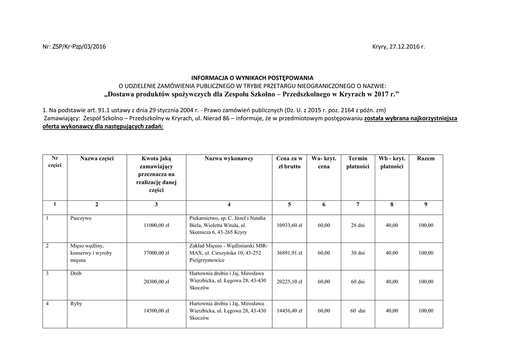 Nr: ZSP/Kr-Pzp/03/2016 Kryry, 27.12.2016 r. INFORMACJA O WYNIKACH POSTĘPOWANIA O UDZIELENIE ZAMÓWIENIA PUBLICZNEGO W TRYBIE PRZETARGU NIEOGRANICZONEGO O NAZWIE: „Dostawa produktów spożywczych dla Zespołu Szkolno – Przedszkolnego w Kryrach w 2017 r.” 1. Na podstawie art. 91.1 ustawy z dnia 29 stycznia 2004 r. - Prawo zamówień publicznych (Dz. U. z 2015 r. poz. 2164 z późn. zm) Zamawiający: Zespół Szkolno – Przedszkolny w Kryrach, ul. Nierad 86 – informuje, że w przedmiotowym postępowaniu została wybrana najkorzystniejsza oferta wykonawcy dla następujących zadań: Nr części Nazwa części Kwota jaką zamawiający przeznacza na realizację danej części Nazwa wykonawcy Cena za w zł brutto Wa- kryt. cena Termin płatności Wb - kryt. płatności Razem 1 2 3 4 5 6 7 8 9 11000,00 zł Piekarnictwo, sp. C. Józef i Natalia Biela, Wioletta Wituła, ul. Skotnicza 6, 43-265 Kryry 10933,60 zł 60,00 28 dni 40,00 100,00 37000,00 zł Zakład Mięsno - Wędliniarski MIRMAX, ul. Cieszyńska 10, 43-252 Pielgrzymowice 36891,91 zł 60,00 30 dni 40,00 100,00 20300,00 zł Hurtownia drobiu i Jaj, Mirosława Wierzbicka, ul. Łęgowa 28, 43-430 Skoczów 20225,10 zł 60,00 60 dni 40,00 100,00 14500,00 zł Hurtownia drobiu i Jaj, Mirosława Wierzbicka, ul. Łęgowa 28, 43-430 Skoczów 14456,40 zł 60,00 60 dni 40,00 100,00 1 2 3 4 Pieczywo Mięso wędliny, konserwy i wyroby mięsna Drób Ryby 5 6 Warzywa, owoce i przetwory 61400,00 zł ANDERSEN Poland, sp z o.o., ul. Kolbego 14 A, 32-600 Oświęcim 61244,70 zł 60,00 30 dni 40,00 100,00 Produkty mleczarskie, oleje, jaja , tłuszcze zwierzęce i roślinne 35100,00 zł ANDERSEN Poland, sp z o.o., ul. Kolbego 14 A, 32-600 Oświęcim 34010,40 zł 60,00 30 dni 40,00 100,00 40800,00 zł ANDERSEN Poland, sp z o.o., ul. Kolbego 14 A, 32-600 Oświęcim 40792,22 zł 60,00 30 dni 40,00 100,00 Pozostałe produkty spożywcze 7 Uzasadnienie wyboru 1.Wyżej wymienieni Wykonawcy nie podlegają wykluczeniu, ich oferty nie podlegają odrzuceniu (spełniają wymagania określone w SIWZ). Oferty uzyskały najwyższą sumę punktów w oparciu o przyjęte kryteria oceny ofert (kryterium ceny stanowiące 60 % wagi, kryterium terminu płatności stanowiące 40% wagi). Umowy o udzielenie zamówienia publicznego mogą zostać zawarta po upływie terminów, o których mowa w art. 94 ust. 1 i 2 ustawy Prawo Zamówień Publicznych. Punktację przyznaną ofertom w zakresie zadań stanowi Załącznik nr 1 do niniejszego pisma. 2. Na podstawie art. 89.1 ust. 2 ustawy z dnia 29 stycznia 2004 r. - Prawo zamówień publicznych (t.j. Dz. U. z 2015 r. poz. 2164 z późn. zm) Zamawiający – Zespół Szkolno – Przedszkolny w Kryrach, ul. Nierad 86, 43-265 Kryry – informuje, że w przedmiotowym postępowaniu nie została odrzucona oferta żadnego wykonawcy. Nr oferty Oferta w części/częściach Nazwa wykonawcy/adres Cena za w zł brutto Wa- kryt. cena Termin płatności Wb - kryt. płatności Razem Uwagi 1 2 3 4 5 6 7 8 9 I Pieczywo Piekarnia Lipianin, GW Lipianin, Przylesie 32, 49-351 14633,34 zł 44,82 22-30 dni 40,00 84,82 Piekarnictwo, sp. C. Józef i Natalia Biela, Wioletta Wituła, ul. Skotnicza 6, 43-265 Kryry II V 60,00 28dni 40,00 100,00 36891,91 zł 60,00 30 dni 40,00 100,00 Mięso wędliny, konserwy i wyroby mięsna Zakład Mięsno - Wędliniarski MIR-MAX, ul. Cieszyńska 10, 43-252 Pielgrzymowice Drób Zakład Przetwórstwa Drobiu „Marica”, ul. Straconki 20, 43300 Bielsko Biała 20907,40 zł 58,04 30 dni 40,00 98,04 Zakład Mięsno - Wędliniarski MIR-MAX, ul. Cieszyńska 10, 43-252 Pielgrzymowice 20491,70 zł 59,21 30 dni 40,00 99,21 Hurtownia drobiu i Jaj, Mirosława Wierzbicka, ul. Łęgowa 28, 43-430 Skoczów 20225,10 zł 60,00 60 dni 40,00 100,00 Hurtownia drobiu i Jaj, Mirosława Wierzbicka, ul. Łęgowa 28, 43-430 Skoczów 14456,40 zł 60,00 60 dni 40,00 100,00 ANDERSEN Poland, sp z o.o., ul. Kolbego 14 A, 32-600 Oświęcim 16725,00 zł 51,86 30 dni 40,00 91,86 Firma Handlowa „MAR-TAD”, Maria, Tadeusz Jędrusik, spółka jawna, ul. Struzika 10A/11, 41800 Zabrze; ul. Rybnicka 20, 43-190 Mikołów 15991,30 zł 54,24 22 dni 40,00 94,24 ANDERSEN Poland, sp z o.o., ul. Kolbego 14 A, 32-600 Oświęcim 61244,70 zł 60,00 30 dni 40,00 100,00 III IV 10933,60 zł Ryby Warzywa, owoce i przetwory VI VII Produkty mleczarskie, oleje, jaja , tłuszcze zwierzęce i roślinne ANDERSEN Poland, sp z o.o., ul. Kolbego 14 A, 32-600 Oświęcim Pozostałe produkty spożywcze ANDERSEN Poland, sp z o.o., ul. Kolbego 14 A, 32-600 Oświęcim 34010,40 zł 60,00 30 dni 40,00 100,00 40792,22 zł 60,00 30 dni 40,00 100,00 Pouczenie Wykonawcom oraz innym osobom, których interes prawny w uzyskaniu zamówienia doznał lub może doznać uszczerbku w wyniku naruszenia przez Zamawiającego przepisów ustawy przysługują środki ochrony prawnej określone w Dziale VI ustawy z dnia 29 stycznia 2004 r. Prawo zamówień publicznych (Dz. U. z 2015 r. poz. 2164 z późn. zm). Kryry, 27.12.2016 Kierownik Zamawiającego