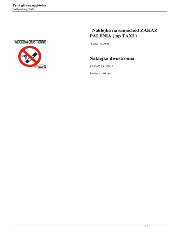 Tytuł główny nagłówka podtytuł nagłówka Naklejka na samochód ZAKAZ PALENIA ( np TAXI ) Cena: 6.99 zł Naklejka dwustronna ZAKAZ PALENIA Średnica - 40 mm 1/1 Powered by TCPDF (www.tcpdf.org)