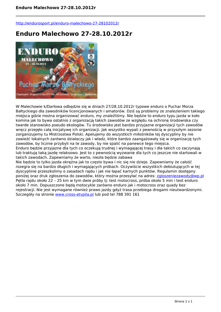 Enduro Malechowo 27-28.10.2012r http://endurosport.pl/enduro-malechowo-27-28102012r Enduro Malechowo 27-28.10.2012r W Malechowie k/Darłowa odbędzie się w dniach 27/28.10.2012r typowe enduro o Puchar Morza Bałtyckiego dla zawodników licencjonowanych i amatorów. Dziś są problemy ze znalezieniem takiego miejsca gdzie można organizować enduro, my znaleźliśmy. Nie będzie to enduro typu jazda w koło komina jak to bywa ostatnio z organizacją takich zawodów ze względu na ochronę środowiska czy twarde stanowisko pseudo ekologów. Tu środowisko jest bardzo przyjazne organizacji tych zawodów wręcz przejęło całą inicjatywę ich organizacji. Jak wszystko wypali z pewnością w przyszłym sezonie zorganizujemy tu Mistrzostwa Polski. Apelujemy do wszystkich miłośników tej dyscypliny by nie zawieźć lokalnych zarówno działaczy jak i władz, które bardzo zaangażowały się w organizację tych zawodów, by licznie przybyli na te zawody, by nie spalić na panewce tego miejsca. Enduro będzie przyjazne dla tych co oczekują trudnej i wymagającej trasy i dla takich co zaczynają lub traktują taką jazdę relaksowo. Jest to z pewnością wyzwanie dla tych co jeszcze nie startowali w takich zawodach. Zapewniamy że warto, niezła będzie zabawa Nie będzie to tylko jazda okrężna jak to często bywa i nic się nie dzieje. Zapewniamy że całość rozegra się na bardzo długich i wymagających próbach. Oczywiście wszystkich debiutujących w tej dyscyplinie przeszkolimy o zasadach rajdu i jak nie łapać karnych punktów. Regulamin dostępny poniżej oraz druk zgłoszenia do zawodów, który można przesyłać na adres: [email protected] Pętla rajdu około 22 – 25 km w tym dwie próby tj: test motocross, próba około 5 min i test enduro około 7 min. Dopuszczone będą motocykle zarówno enduro jak i motocross oraz quady bez rejestracji. Nie jest wymagane również prawo jazdy gdyż trasa przebiega drogami nieutwardzonymi. Szczegóły na stronie www.cross-atvpila.pl lub pod tel 788 391 161 Strona 1 z 1 Powered by TCPDF (www.tcpdf.org)