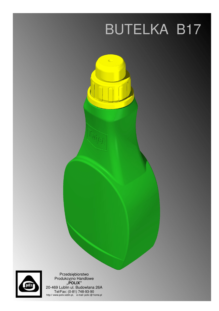 BUTELKA B17 Przedsiębiorstwo Produkcyjno Handlowe „POLIX” 20-469 Lublin ul. Budowlana 26A Tel/Fax: (0-81) 748-93-90 http:// www.polix.lublin.pl, e-mail: polix @ home.pl Typ B17-05 Pojemność 0,50 dm3 Materiał PE-HD Nakrętka Nakrętka: N-11 Materiał: PE-HD Inne Przedsiębiorstwo Produkcyjno Handlowe “POLIX” 20-469 Lublin ul. Budowlana 26A Tel/Fax: (0-81) 748-93-90 http:// www.polix.lublin.pl, e-mail: polix @ home.pl 13.02