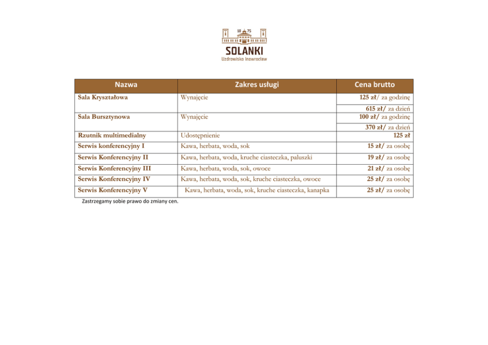 Nazwa Sala Kryształowa Sala Bursztynowa Zakres usługi Cena brutto Wynajęcie 125 zł/ za godzinę Wynajęcie 615 zł/ za dzień 100 zł/ za godzinę 370 zł/ za dzień 125 zł Rzutnik multimedialny Udostępnienie Serwis konferencyjny I Kawa, herbata, woda, sok 15 zł/ za osobę Serwis Konferencyjny II Kawa, herbata, woda, kruche ciasteczka, paluszki 19 zł/ za osobę Serwis Konferencyjny III Kawa, herbata, woda, sok, owoce 21 zł/ za osobę Serwis Konferencyjny IV Kawa, herbata, woda, sok, kruche ciasteczka, owoce 25 zł/ za osobę Serwis Konferencyjny V Zastrzegamy sobie prawo do zmiany cen. Kawa, herbata, woda, sok, kruche ciasteczka, kanapka 25 zł/ za osobę