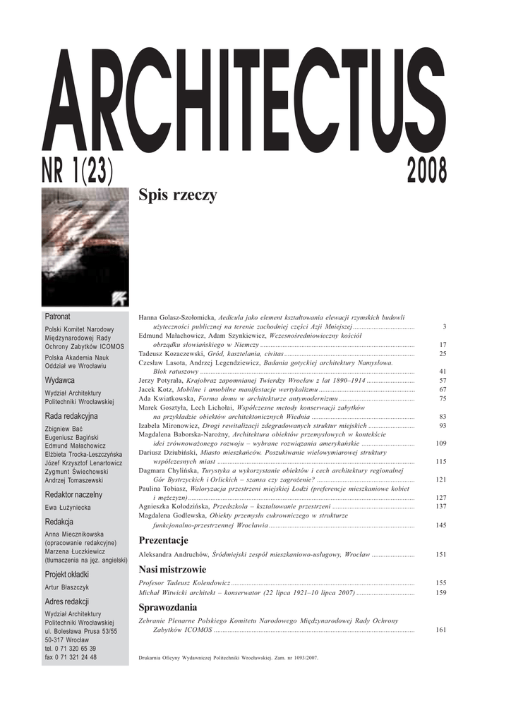 ARCHITECTUS NR 1(23) Patronat Polski Komitet Narodowy Midzynarodowej Rady Ochrony Zabytków ICOMOS Polska Akademia Nauk Oddzia we Wrocawiu Wydawca Wydzia Architektury Politechniki Wrocawskiej Rada redakcyjna Zbigniew Ba Eugeniusz Bagiski Edmund Maachowicz Elbieta Trocka-Leszczyska Józef Krzysztof Lenartowicz Zygmunt wiechowski Andrzej Tomaszewski Redaktor naczelny Ewa uyniecka Redakcja Anna Miecznikowska (opracowanie redakcyjne) Marzena uczkiewicz (tumaczenia na jz. angielski) Projekt okadki Artur Baszczyk Adres redakcji Wydzia Architektury Politechniki Wrocawskiej ul. Bolesawa Prusa 53/55 50-317 Wrocaw tel. 0 71 320 65 39 fax 0 71 321 24 48 Spis rzeczy 2008 Hanna Golasz-Szo³omicka, Aedicula jako element kszta³towania elewacji rzymskich budowli u¿ytecznoœci publicznej na terenie zachodniej czêœci Azji Mniejszej .................................... Edmund Ma³achowicz, Adam Szynkiewicz, Wczesnoœredniowieczny koœció³ obrz¹dku s³owiañskiego w Niemczy .......................................................................................... Tadeusz Kozaczewski, Gród, kasztelania, civitas ............................................................................ Czes³aw Lasota, Andrzej Legendziewicz, Badania gotyckiej architektury Namys³owa. Blok ratuszowy ............................................................................................................................. Jerzy Potyra³a, Krajobraz zapomnianej Twierdzy Wroc³aw z lat 1890–1914 ............................ Jacek Kotz, Mobilne i amobilne manifestacje wertykalizmu ........................................................ Ada Kwiatkowska, Forma domu w architekturze antymodernizmu ............................................ Marek Goszty³a, Lech Licho³ai, Wspó³czesne metody konserwacji zabytków na przyk³adzie obiektów architektonicznych Wiednia ............................................................ Izabela Mironowicz, Drogi rewitalizacji zdegradowanych struktur miejskich ........................... Magdalena Baborska-Naro¿ny, Architektura obiektów przemys³owych w kontekœcie idei zrównowa¿onego rozwoju – wybrane rozwi¹zania amerykañskie ............................... Dariusz Dziubiñski, Miasto mieszkañców. Poszukiwanie wielowymiarowej struktury wspó³czesnych miast ................................................................................................................... Dagmara Chyliñska, Turystyka a wykorzystanie obiektów i cech architektury regionalnej Gór Bystrzyckich i Orlickich – szansa czy zagro¿enie? ......................................................... Paulina Tobiasz, Waloryzacja przestrzeni miejskiej £odzi (preferencje mieszkaniowe kobiet i mê¿czyzn) .................................................................................................................................... Agnieszka Ko³odziñska, Przedszkola – kszta³towanie przestrzeni ................................................ Magdalena Godlewska, Obiekty przemys³u cukrowniczego w strukturze funkcjonalno-przestrzennej Wroc³awia ..................................................................................... 3 17 25 41 57 67 75 83 93 109 115 121 127 137 145 Prezentacje Aleksandra Andruchów, Œródmiejski zespó³ mieszkaniowo-us³ugowy, Wroc³aw ......................... 151 Nasi mistrzowie Profesor Tadeusz Kolendowicz ........................................................................................................... Micha³ Witwicki architekt – konserwator (22 lipca 1921–10 lipca 2007) .................................. 155 159 Sprawozdania Zebranie Plenarne Polskiego Komitetu Narodowego Miêdzynarodowej Rady Ochrony Zabytków ICOMOS ..................................................................................................................... Drukarnia Oficyny Wydawniczej Politechniki Wroc³awskiej. Zam. nr 1093/2007. 161 ARCHITECTUS NR 1(23) Patronage Polish National Committee of International Council on Monuments and Sites (ICOMOS) Polish Academy of Sciences Section in Wrocaw Publisher Department of Architecture Wrocaw University of Technology Editorial Counsel Zbigniew Ba Eugeniusz Bagiski Edmund Maachowicz Elbieta Trocka-Leszczyska Józef Krzysztof Lenartowicz Zygmunt wiechowski Andrzej Tomaszewski Editor-in-Chief Ewa uyniecka Editorial staff Anna Miecznikowska (editing) Marzena uczkiewicz (English translation) Cover design Artur Baszczyk Editorial Office Address Wydzia Architektury Politechniki Wrocawskiej ul. Bolesawa Prusa 53/55 50-317 Wrocaw tel. 0 71 320 65 39 fax 0 71 321 24 48 Contents 2008 Hanna Golasz-Szo³omicka, The aedicula as an element shaping the elevation of Roman public service buildings in the west part of Asia Minor ..................................... Edmund Ma³achowicz, Adam Szynkiewicz, Early mediaeval church of Slavonic ritual in Niemcza .................................................................................................................................... Tadeusz Kozaczewski, Strongholds, castellanies, civitas .............................................................. Czes³aw Lasota, Andrzej Legendziewicz, Studies of Gothic architecture in Namys³ów. The town hall complex ............................................................................................................... Jerzy Potyra³a, Landscape of the forgotten Wroc³aw Stronghold in the years of 1890–1914 .............................................................................................................................. Jacek Kotz, Mobile and immobile manifestations of verticalism ................................................ Ada Kwiatkowska, The form of the house in the antimodernistic architecture ......................... Marek Goszty³a, Lech Licho³ai, Modern methods of monuments’ conservation exemplified by architectonic objects in Vienna ..............................................................................