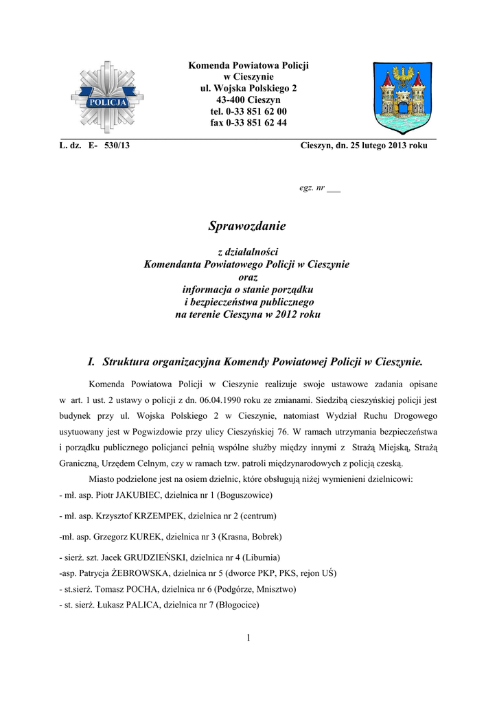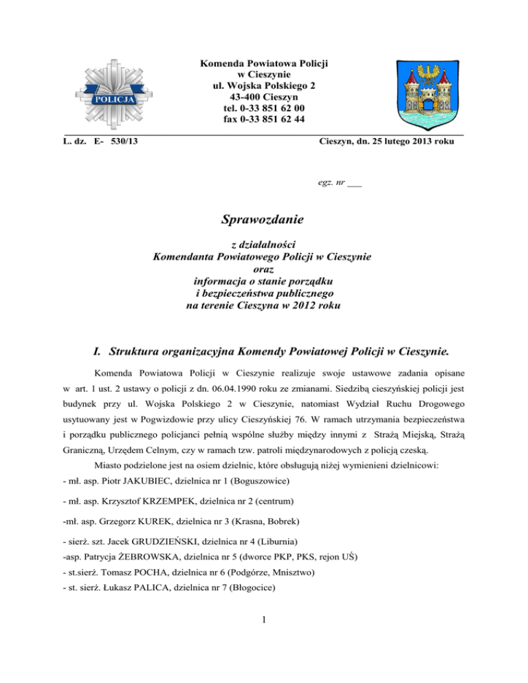 Komenda Powiatowa Policji w Cieszynie ul. Wojska Polskiego 2 43-400 Cieszyn tel. 0-33 851 62 00 fax 0-33 851 62 44 ___________________________________________________________________________ L. dz. E- 530/13 Cieszyn, dn. 25 lutego 2013 roku egz. nr ___ Sprawozdanie z działalności Komendanta Powiatowego Policji w Cieszynie oraz informacja o stanie porządku i bezpieczeństwa publicznego na terenie Cieszyna w 2012 roku I. Struktura organizacyjna Komendy Powiatowej Policji w Cieszynie. Komenda Powiatowa Policji w Cieszynie realizuje swoje ustawowe zadania opisane w art. 1 ust. 2 ustawy o policji z dn. 06.04.1990 roku ze zmianami. Siedzibą cieszyńskiej policji jest budynek przy ul. Wojska Polskiego 2 w Cieszynie, natomiast Wydział Ruchu Drogowego usytuowany jest w Pogwizdowie przy ulicy Cieszyńskiej 76. W ramach utrzymania bezpieczeństwa i porządku publicznego policjanci pełnią wspólne służby między innymi z Strażą Miejską, Strażą Graniczną, Urzędem Celnym, czy w ramach tzw. patroli międzynarodowych z policją czeską. Miasto podzielone jest na osiem dzielnic, które obsługują niżej wymienieni dzielnicowi: - mł. asp. Piotr JAKUBIEC, dzielnica nr 1 (Boguszowice) - mł. asp. Krzysztof KRZEMPEK, dzielnica nr 2 (centrum) -mł. asp. Grzegorz KUREK, dzielnica nr 3 (Krasna, Bobrek) - sierż. szt. Jacek GRUDZIEŃSKI, dzielnica nr 4 (Liburnia) -asp. Patrycja ŻEBROWSKA, dzielnica nr 5 (dworce PKP, PKS, rejon UŚ) - st.sierż. Tomasz POCHA, dzielnica nr 6 (Podgórze, Mnisztwo) - st. sierż. Łukasz PALICA, dzielnica nr 7 (Błogocice) 1 - mł. asp. Sebastian KLAJMON, dzielnica nr 8 (Piastowskie, Kalembice) Szczegółowy wykaz ulic obsługiwanych przez poszczególnych dzielnicowych znajduje się na stronie internetowej www.cieszyn.slaska.policja.gov.pl w bloku Informacje, zakładka Twój dzielnicowy. Informacje na temat struktury organizacyjnej Komendy Powiatowej Policji w Cieszynie znajdują się na stronie internetowej www.cieszyn.slaska.policja.gov.pl oraz w Biuletynie Informacji Publicznej Komendanta Powiatowego Policji w Cieszynie http://bip.cieszyn.kpp.policja.gov.pl. II. Ocena efektów pracy służby kryminalnej W roku 2012 na terenie miasta Cieszyna stwierdzono ogółem 1510 przestępstw. Z analizy statystycznej wynika, że w 2012 roku nastąpił spadek ilości przestępstw w porównaniu z rokiem 2011. Stwierdzono o 253 przestępstwa mniej tj. o 16,75 %. Wykrywalność utrzymała się na wysokim poziomie i wyniosła 75,2%. Jeśli chodzi o przestępstwa o charakterze kryminalnym, to w roku 2012 odnotowano ich 1032. Wynika z tego, że w tej kategorii nastąpił wzrost ilości przestępstw kryminalnych stwierdzonych w stosunku do roku 2011 o 116 przestępstw. Wykrywalność w tej kategorii utrzymuje się na poziomie 64,7%, to jest o 7,9 % więcej w porównaniu do roku 2011. Struktura przestępczości kryminalnej odnotowanej w roku 2012 na terenie Cieszyna przedstawia się jak na wykresie: Procentowy udział wybranych kategorii przestępstw kryminalnych 57,1% 60,0% 50,0% 40,0% 30,0% 17,7% 16,4% 20,0% 7,0% 10,0% 1,2% 0,6% 2 In ne e ci Bó jk a, po bi Ro zb ój an ie ła m W ko wa .N ar ko ty Pr ze st -10,0% Kr ad zi eż 0,0% W przestępstwach określonych jako inne największy udział stanowią : oszustwo 22,96%, nietrzeźwi kierujący 15,0 %, uszkodzenie mienia 7,3% i uszczerbek na zdrowiu 1,7% . Poniżej przedstawiam bardziej szczegółowo kategorie przestępstw, które są najbardziej uciążliwe dla społeczeństwa: 1. Udział w bójce lub pobiciu W tej kategorii nastąpił wzrost o 1 czyn do poziomu 9 przestępstw, co daje dynamikę na poziomie 112,5%. Wykrywalność w tej kategorii osiągnięto na poziomie 88,9 % i spadła w porównaniu do 2011 roku o 11,1 % . 2. Przestępstwa rozbójnicze W roku 2012 odnotowano spadek dynamiki przestępstw w tej kategorii do poziomu 72 %. Łącznie odnotowano 18 rozbojów ( o 7 mniej niż w 2011) na terenie Cieszyna, wykrywalność wyniosła 72,2 %. 3. Kradzież cudzej rzeczy W roku 2012 odnotowano na terenie miasta spadek ogólnej liczby kradzieży o 3 przestępstwa i wyniosła ona 267 czynów przy wzroście wykrywalności do poziomu 38,7%. 4. Kradzież z włamaniem W tej kategorii przestępstw odnotowano 106 kradzieży z włamaniem. Jest to o 25 przestępstw mniej niż w roku 2011. Wykrywalność wzrosła o 6,7% do poziomu 35,8 % . 5. Kradzież samochodu W roku 2012 z terenu naszego miasta skradziono 13 samochodów, to jest o 5 mniej niż w 2011. 6. Narkomania W tej kategorii w roku 2012 odnotowaliśmy wzrost przestępstw z poziomu 162 do 248 przy wykrywalności 98,8%. W sprawach o przestępstwa gospodarcze w roku 2012 stwierdzono 312 przestępstw, tj. o 325 przestępstw mniej niż w roku 2011. Wykrywalność w tym zakresie wyniosła 100% co świadczy o bardzo dobrej pracy funkcjonariuszy pionu PG. Łącznie w roku 2012 prawie 640 podejrzanych usłyszało zarzuty popełnienia przestępstwa. Sądy zastosowały środki zapobiegawcze w postaci tymczasowych aresztów wobec 15 osób. III. Ocena efektów pracy w służbie prewencyjnej W zakresie służby prewencyjnej w 2012 roku kładziono nacisk na czynniki warunkujące skuteczność oraz pozytywny odbiór służb prewencyjnych przez mieszkańców miasta. W przypadku 3 policjantów Ogniw Patrolowo-Interwencyjnych miernikiem tym była szybkość oraz skuteczność reakcji na zdarzenia. W roku 2012 służby patrolowe KPP Cieszyn osiągnęły średni czas reakcji na na zgłoszenia telefoniczne na poziomie 13 minut. Ponadto policjanci prewencji osiągnęli następujące wyniki: 2011 2012 spadek/wzrost 217 261 +44 Kryminalni 123 184 +61 Nietrzeźwi kierowcy 94 77 -17 Mandaty karne 1030 1112 +82 Wnioski o ukaranie 290 145 -145 Interwencje 2757 3840 +1083 99 79 -20 Zatrzymania na gorącym uczynku przestępstwa w tym Zatrz. poszukiwanych Profilaktyka W roku 2012 działalność profilaktyczną na terenie miasta prowadzili funkcjonariusze Wydziału Prewencji i Ruchu Drogowego z następujących kom