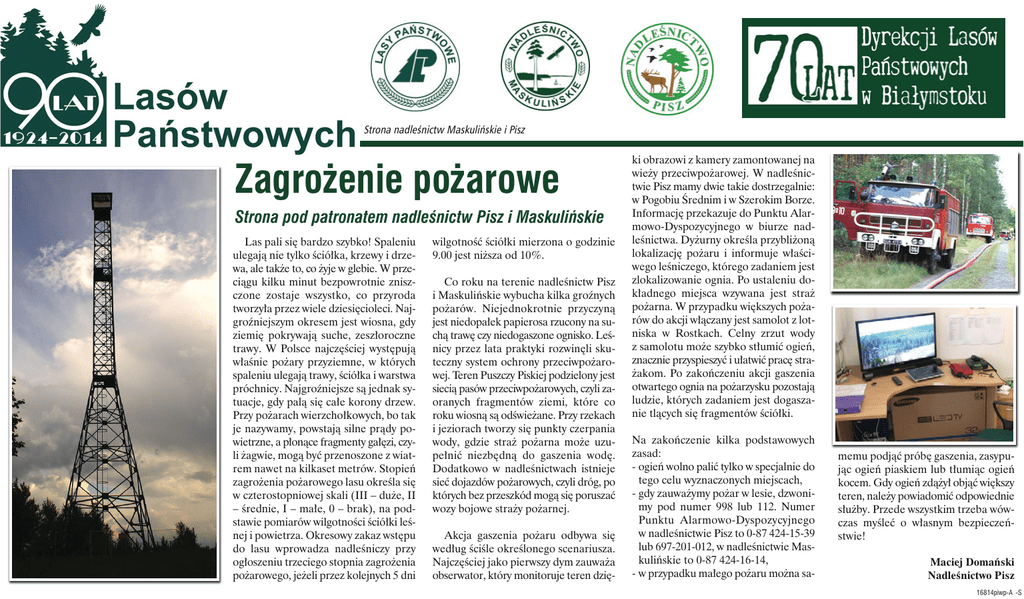 Strona nadleśnictw Maskulińskie i Pisz Zagrożenie pożarowe Strona pod patronatem nadleśnictw Pisz i Maskulińskie Las pali się bardzo szybko! Spaleniu ulegają nie tylko ściółka, krzewy i drzewa, ale także to, co żyje w glebie. W przeciągu kilku minut bezpowrotnie zniszczone zostaje wszystko, co przyroda tworzyła przez wiele dziesięcioleci. Najgroźniejszym okresem jest wiosna, gdy ziemię pokrywają suche, zeszłoroczne trawy. W Polsce najczęściej występują właśnie pożary przyziemne, w których spaleniu ulegają trawy, ściółka i warstwa próchnicy. Najgroźniejsze są jednak sytuacje, gdy palą się całe korony drzew. Przy pożarach wierzchołkowych, bo tak je nazywamy, powstają silne prądy powietrzne, a płonące fragmenty gałęzi, czyli żagwie, mogą być przenoszone z wiatrem nawet na kilkaset metrów. Stopień zagrożenia pożarowego lasu określa się w czterostopniowej skali (III – duże, II – średnie, I – małe, 0 – brak), na podstawie pomiarów wilgotności ściółki leśnej i powietrza. Okresowy zakaz wstępu do lasu wprowadza nadleśniczy przy ogłoszeniu trzeciego stopnia zagrożenia pożarowego, jeżeli przez kolejnych 5 dni wilgotność ściółki mierzona o godzinie 9.00 jest niższa od 10%. Co roku na terenie nadleśnictw Pisz i Maskulińskie wybucha kilka groźnych pożarów. Niejednokrotnie przyczyną jest niedopałek papierosa rzucony na suchą trawę czy niedogaszone ognisko. Leśnicy przez lata praktyki rozwinęli skuteczny system ochrony przeciwpożarowej. Teren Puszczy Piskiej podzielony jest siecią pasów przeciwpożarowych, czyli zaoranych fragmentów ziemi, które co roku wiosną są odświeżane. Przy rzekach i jeziorach tworzy się punkty czerpania wody, gdzie straż pożarna może uzupełnić niezbędną do gaszenia wodę. Dodatkowo w nadleśnictwach istnieje sieć dojazdów pożarowych, czyli dróg, po których bez przeszkód mogą się poruszać wozy bojowe straży pożarnej. Akcja gaszenia pożaru odbywa się według ściśle określonego scenariusza. Najczęściej jako pierwszy dym zauważa obserwator, który monitoruje teren dzię- ki obrazowi z kamery zamontowanej na wieży przeciwpożarowej. W nadleśnictwie Pisz mamy dwie takie dostrzegalnie: w Pogobiu Średnim i w Szerokim Borze. Informację przekazuje do Punktu Alarmowo-Dyspozycyjnego w biurze nadleśnictwa. Dyżurny określa przybliżoną lokalizację pożaru i informuje właściwego leśniczego, którego zadaniem jest zlokalizowanie ognia. Po ustaleniu dokładnego miejsca wzywana jest straż pożarna. W przypadku większych pożarów do akcji włączany jest samolot z lotniska w Rostkach. Celny zrzut wody z samolotu może szybko stłumić ogień, znacznie przyspieszyć i ułatwić pracę strażakom. Po zakończeniu akcji gaszenia otwartego ognia na pożarzysku pozostają ludzie, których zadaniem jest dogaszanie tlących się fragmentów ściółki. Na zakończenie kilka podstawowych zasad: - ogień wolno palić tylko w specjalnie do tego celu wyznaczonych miejscach, - gdy zauważymy pożar w lesie, dzwonimy pod numer 998 lub 112. Numer Punktu Alarmowo-Dyspozycyjnego w nadleśnictwie Pisz to 0-87 424-15-39 lub 697-201-012, w nadleśnictwie Maskulińskie to 0-87 424-16-14, - w przypadku małego pożaru można sa- memu podjąć próbę gaszenia, zasypując ogień piaskiem lub tłumiąc ogień kocem. Gdy ogień zdążył objąć większy teren, należy powiadomić odpowiednie służby. Przede wszystkim trzeba wówczas myśleć o własnym bezpieczeństwie! Maciej Domański Nadleśnictwo Pisz 16814piwp-A -S