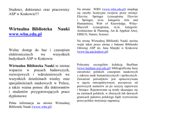 Studenci, doktoranci oraz pracownicy ASP w Krakowie!!! Wirtualna Biblioteka www.wbn.edu.pl Nauki Wolny dostęp do baz i czasopism elektronicznych we wszystkich budynkach ASP w Krakowie Wirtualna Biblioteka Nauki to istotne wsparcie w pracach badawczych, rozwojowych i wdrożeniowych we wszystkich dziedzinach wiedzy oraz specjalnościach naukowych w Polsce, a także ważna pomoc dla doktorantów i studentów przygotowujących prace dyplomowe Pełna informacja na stronie Wirtualnej Biblioteki Nauki (www.wbn.pl) Na stronie WBN (www.wbn.edu.pl) znajdują się zasoby licencyjne (wejście przez stronę): Elesvier, Springer (czasopisma Elesvier i Springer, m.in. kategoria Arts and Humanities), Web of Knowledge, WileyBlacwell (czasopisma, m.in. kategorie: Architecture & Planning, Art & Applied Arts), EBSCO, Nature, Science Na stronę Wirtualnej Biblioteki Nauki można wejść także przez stronę z linkami Biblioteki Głównej ASP im. Jana Matejki w Krakowie (www.bg.asp.krakow.pl) Polecamy szczególnie kolekcję BazHum (www.bazhum.icm.edu.pl) bibliograficzną bazę zawartości polskich czasopism naukowych z zakresu nauk humanistycznych i społecznych. Zawartość periodyków jest opracowywana w ujęciu retrospektywnym, począwszy od pierwszych numerów aż po zeszyty najnowsze i bieżące. Rejestrowane są tytuły ukazujące się na ziemiach polskich, w obecnych lub dawnych granicach państwa polskiego bądź wytworzone przez polskie instytucje zagranicą