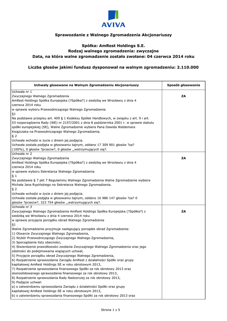 Sprawozdanie z Walnego Zgromadzenia Akcjonariuszy Spółka: AmRest Holdings S.E. Rodzaj walnego zgromadzenia: zwyczajne Data, na która walne zgromadzenie zostało zwołane: 04 czerwca 2014 roku Liczba głosów jakimi fundusz dysponował na walnym zgromadzeniu: 2.110.000 Uchwały głosowane na Walnym Zgromadzeniu Akcjonariuszy Uchwała nr 1 Zwyczajnego Walnego Zgromadzenia AmRest Holdings Spółka Europejska (?Spółka?) z siedzibą we Wrocławiu z dnia 4 czerwca 2014 roku w sprawie wyboru Przewodniczącego Walnego Zgromadzenia §1 Na podstawie przepisu art. 409 § 1 Kodeksu Spółek Handlowych, w związku z art. 9 i art. 53 rozporządzenia Rady (WE) nr 2157/2001 z dnia 8 października 2001 r. w sprawie statutu spółki europejskiej (SE), Walne Zgromadzenie wybiera Pana Dawida Waldemara Książczaka na Przewodniczącego Walnego Zgromadzenia. §2 Uchwała wchodzi w życie z dniem jej podjęcia. Uchwała została podjęta w głosowaniu tajnym, oddano 17 309 901 głosów ?za? (100%), 0 głosów ?przeciw?, 0 głosów ,,wstrzymujących się?. Uchwała nr 2 Zwyczajnego Walnego Zgromadzenia AmRest Holdings Spółka Europejska (?Spółka?) z siedzibą we Wrocławiu z dnia 4 czerwca 2014 roku w sprawie wyboru Sekretarza Walnego Zgromadzenia §1 Na podstawie § 7 pkt 7 Regulaminu Walnego Zgromadzenia Walne Zgromadzenie wybiera Michała Jana Rypińskiego na Sekretarza Walnego Zgromadzenia. §2 Uchwała wchodzi w życie z dniem jej podjęcia. Uchwała została podjęta w głosowaniu tajnym, oddano 16 986 147 głosów ?za? 0 głosów ?przeciw?, 323 754 głosów ,,wstrzymujących się?. Uchwała nr 3 Zwyczajnego Walnego Zgromadzenia AmRest Holdings Spółka Europejska (?Spółka?) z siedzibą we Wrocławiu z dnia 4 czerwca 2014 roku w sprawie przyjęcia porządku obrad Walnego Zgromadzenia §1 Walne Zgromadzenie przyjmuje następujący porządek obrad Zgromadzenia: 1) Otwarcie Zwyczajnego Walnego Zgromadzenia, 2) Wybór Przewodniczącego Zwyczajnego Walnego Zgromadzenia, 3) Sporządzenie listy obecności, 4) Stwierdzenie prawidłowości zwołania Zwyczajnego Walnego Zgromadzenia oraz jego zdolności do podejmowania wiążących uchwał, 5) Przyjęcie porządku obrad Zwyczajnego Walnego Zgromadzenia, 6) Rozpatrzenie sprawozdania Zarządu AmRest z działalności Spółki oraz grupy kapitałowej AmRest Holdings SE w roku obrotowym 2013, 7) Rozpatrzenie sprawozdania finansowego Spółki za rok obrotowy 2013 oraz skonsolidowanego sprawozdania finansowego za rok obrotowy 2013, 8) Rozpatrzenie sprawozdania Rady Nadzorczej za rok obrotowy 2013, 9) Podjęcie uchwał: a) o zatwierdzeniu sprawozdania Zarządu z działalności Spółki oraz grupy kapitałowej AmRest Holdings SE w roku obrotowym 2013, b) o zatwierdzeniu sprawozdania finansowego Spółki za rok obrotowy 2013 oraz Strona 1 z 5 Sposób głosowania ZA ZA ZA skonsolidowanego sprawozdania finansowego grupy kapitałowej AmRest Holdings SE za rok obrotowy 2013, c) w sprawie podziału zysku Spółki za rok obrotowy 2013, 10) Podjęcie uchwały w przedmiocie udzielenia absolutorium członkom Zarządu oraz Rady Nadzorczej z wykonania przez nich obowiązków w roku obrotowym 2013, 11) Podjęcie uchwał w sprawie zmian Statutu Spółki, 12) Podjęcie uchwały w sprawie ustalenia tekstu jednolitego Statutu Spółki, 13) Podjęcie uchwały w sprawie ponownego powołania Pana Henry McGovern na członka Rady Nadzorczej, 14) Podjęcie uchwał w sprawie wyboru członków Rady Nadzorczej, 15) Zamknięcie Zgromadzenia. §2 Uchwała wchodzi w życie z dniem jej podjęcia. Uchwała została podjęta w głosowaniu jawnym, oddano 17 309 901 głosów ?za? (100%), 0 głosów ?przeciw?, 0 głosów ,,wstrzymujących się?. Uchwała nr 4 Zwyczajnego Walnego Zgromadzenia AmRest Holdings Spółka Europejska (?Spółka?) z siedzibą we Wrocławiu z dnia 4 czerwca 2014 roku w sprawie zatwierdzenia sprawozdania Zarządu z działalności Spółki oraz grupy kapitałowej AmRest Holdings SE w roku obrotowym 2013 §1 Działając na podstawie art. 393 pkt 1 i art. 395 §2 pkt 1 i §5 Kodeksu Spółek Handlowych w związku z art. 9, art. 53 i art. 61 rozporządzenia Rady (WE) nr 2157/2001 z dnia 8 października 2001 r. w sprawie statutu spółki europejskiej (SE), oraz §14 ust. 2 pkt a) Statutu Spółki, Walne Zgromadzenie, po rozpatrzeniu, zatwierdza sprawozdanie Zarządu z działalności Spółki oraz sprawozdanie Zarządu z działalności grupy kapitałowej AmRest Holdings SE w roku obrotowym 2013. §2 Uchwała wchodzi w życie z dniem jej podjęcia. Uchwała została podjęta w głosowaniu jawnym, oddano 17 283 901 głosów ?za?, 0 głosów ?przeciw?, 26 000 głosów ,,wstrzymujących się?. Uchwała nr 5 Zwyczajnego Walnego Zgromadzenia AmRest Holdings Spółka Europejska (?Spółka?) z siedzibą we Wrocławiu z dnia 4 czerwca 2014 roku w sprawie zatwierdzenia sprawozdania finansowego Spółki za rok obrotowy 2013 oraz skonsolidowanego sprawozdania finansowego grupy kapitałowej AmRest Holdings SE za rok obrotowy 2013 §1 Działając na podstawie art. 393 pkt 1 i art. 395 §2 pkt 1 i §5 Kodeksu Spółek Handlowych w związku z art. 9, art. 53 i art. 61 rozporządzenia Rady (WE) nr 2157/2001 z dnia 8 października 2001 r. w sprawie statutu spółki europejskiej (SE), oraz §14 ust. 2 pkt a) Statutu Spółki, Walne Zgromadzenie, po rozpatrzeniu, zatwierdza: 1) sprawozdanie finansowe Spółki za rok obrotowy od 1 stycznia 2013 r. do 31 grudnia 2013 r., składające się z: ? rachunku zysków i strat za okres od 1 stycznia 2013 r. do 31 grudnia 2013 r. wykazującego zysk netto w kwocie 6 853 tys. złotych, 4 ? sprawozdania z całkowitych dochodów za okres od 1 stycznia 2013 r. do 31 grudnia 2013 r. wykazującego dochody całkowite w kwocie 6 853 tys. złotych, ? sprawozdania z sytuacji finansowej sporządzonego na dzień 31 grudnia 2013 roku, który po stronie aktywów oraz zobowiązań i kapitału własnego wykazuje sumę 1 156 520 tys. złotych, ? sprawozdania z przepływów pieni