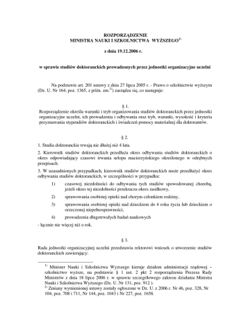 ROZPORZ DZENIE MINISTRA NAUKI I SZKOLNICTWA WY SZEGO1) z dnia 19.12.2006 r. w sprawie studiów doktoranckich prowadzonych przez jednostki organizacyjne uczelni Na podstawie art. 201 ustawy z dnia 27 lipca 2005 r. - Prawo o szkolnictwie wy szym (Dz. U. Nr 164, poz. 1365, z pó n. zm.2)) zarz dza si , co nast puje: § 1. Rozporz dzenie okre la warunki i tryb organizowania studiów doktoranckich przez jednostki organizacyjne uczelni, ich prowadzenia i odbywania oraz tryb, warunki, wysoko i kryteria przyznawania stypendiów doktoranckich i wiadcze pomocy materialnej dla doktorantów. § 2. 1. Studia doktoranckie trwaj nie dłu ej ni 4 lata. 2. Kierownik studiów doktoranckich przedłu a okres odbywania studiów doktoranckich o okres odpowiadaj cy czasowi trwania urlopu macierzy skiego okre lonego w odr bnych przepisach. 3. W uzasadnionych przypadkach, kierownik studiów doktoranckich mo e przedłu y okres odbywania studiów doktoranckich, w szczególno ci w przypadku: 1) czasowej niezdolno ci do odbywania tych studiów spowodowanej chorob , je eli okres tej niezdolno ci przekracza okres zasiłkowy, 2) sprawowania osobistej opieki nad chorym członkiem rodziny, 3) sprawowania osobistej opieki nad dzieckiem do 4 roku ycia lub dzieckiem o orzeczonej niepełnosprawno ci, 4) prowadzenia długotrwałych bada naukowych - ł cznie nie wi cej ni o rok. § 3. Rada jednostki organizacyjnej uczelni przedstawia rektorowi wniosek o utworzenie studiów doktoranckich zawieraj cy: 1) Minister Nauki i Szkolnictwa Wy szego kieruje działem administracji rz dowej – szkolnictwo wy sze, na podstawie § 1 ust. 2 pkt 2 rozporz dzenia Prezesa Rady Ministrów z dnia 18 lipca 2006 r. w sprawie szczegółowego zakresu działania Ministra Nauki i Szkolnictwa Wy szego (Dz. U. Nr 131, poz. 912 ). 2) Zmiany wymienionej ustawy zostały ogłoszone w Dz. U. z 2006 r. Nr 46, poz. 328, Nr 104, poz. 708 i 711, Nr 144, poz. 1043 i Nr 227, poz. 1658. 1) projekt programu studiów doktoranckich; 2) propozycj warunków i trybu rekrutacji; 3) analiz wpływu studiów doktoranckich na sytuacj organizacyjn i dydaktyczno – kadrow jednostki organizacyjnej ubiegaj cej si o utworzenie tych studiów; 4) ekonomiczn analiz prowadzenia i finansowania studiów doktoranckich; 5) proponowan wysoko opłat za studia doktoranckie, je eli przewidywane jest utworzenie studiów płatnych. § 4. Rekrutacj na studia doktoranckie przeprowadza komisja rekrutacyjna, zgodnie z warunkami i trybem rekrutacji, o których mowa w art. 169 ust. 2 i art. 196 ust. 1 ustawy z dnia 27 lipca 2005 r. – Prawo o szkolnictwie wy szym, zwanej dalej „ustaw ”. § 5. 1. Rektor, po zasi gni ciu opinii wła ciwego organu samorz du doktorantów: 1) powołuje i odwołuje, na wniosek rady jednostki organizacyjnej, kierownika studiów doktoranckich; 2) ustala regulamin przyznawania stypendiów doktoranckich. 2. Wła ciwy organ samorz du doktorantów wyra a opini w terminie 14 dni od dnia otrzymania wniosku o jej wydanie. § 6. Rada jednostki organizacyjnej prowadz cej studia doktoranckie: 1) okre la sposób dokonywania oceny realizacji programu studiów doktoranckich oraz prowadzenia bada naukowych przez doktorantów; 2) okre la sposób organizacji zaj prowadzonych na studiach doktoranckich; 3) rozpatruje zastrze enia doktorantów do ocen, o których mowa w § 7 pkt 2: 4) rozpatruje odwołania doktorantów od decyzji, o których mowa w § 7 pkt 3. § 7. Kierownik studiów doktoranckich: 1) organizuje realizacj programu studiów doktoranckich; 2) dokonuje oceny realizacji programu studiów doktoranckich oraz prowadzenia bada naukowych przez doktorantów; 3) podejmuje decyzje w sprawie zaliczenia kolejnych lat studiów doktoranckich; 4) wyra a zgod na przedłu enie okresu odbywania studiów doktoranckich. § 8. 1. wiadczenia pomocy materialnej, o których mowa w art. 199 ust. 1 ustawy, przyznaje si na wniosek doktoranta, sporz dzony odr bnie dla ka dego z tych wiadcze . 2. Do wniosku o przyznanie stypendium socjalnego, stypendium na wy ywienie albo stypendium mieszkaniowego doktorant doł cza: 1) za wiadczenia urz du skarbowego o wysoko ci dochodów uzyskanych przez doktoranta lub doktoranta i członków jego rodziny, w przypadku dochodów podlegaj cych opodatkowaniu podatkiem dochodowym od osób fizycznych; 2) o wiadczenia doktoranta lub doktoranta i członków jego rodziny o wysoko ci uzyskanego dochodu, w przypadku dochodów podlegaj cych opodatkowaniu zryczałtowanym podatkiem dochodowym od niektórych przychodów osi ganych przez osoby fizyczne; 3) za wiadczenie wła ciwego organu gminy lub nakaz płatniczy okre laj cy wielko gospodarstwa rolnego wyra on w hektarach przeliczeniowych ogólnej powierzchni, w przypadku dochodu uzyskiwanego przez doktoranta lub doktoranta i członków jego rodziny z prowadzenia gospodarstwa rolnego; 4) o wiadczenia doktoranta lub doktoranta i członków jego rodziny o wysoko ci uzyskiwanych innych dochodów. 3. Stypendium za wyniki w nauce mo e by tak e przyznane bez konieczno ci składania wniosku. § 9. 1. Wniosek o przyznanie wiadczenia pomocy materialnej doktorant składa do kierownika studiów doktoranckich. 2. Kierownik studiów doktoranckich, w terminie 14 dni od dnia otrzymania wniosku, dokonuje sprawdzenia kompletno ci zło onego wniosku i przekazuje go organowi przyznaj cemu wiadczenia pomocy materialnej. § 10. 1. Pomoc materialn w formie: 1) stypendium socjalnego, 2) stypendium na wy ywienie, 3) stypendium mieszkaniowego mo e otrzyma doktorant znajduj cy si w trudnej sytuacji materialnej, okre lonej zgodnie z art. 179 ustawy. Pomoc ta jest przyznawana na okres semestru lub roku akademickiego i wypłacana co miesi c. 2. Stypendium mieszkaniowe mo e otrzyma doktoranckie. doktorant odbywaj cy stacjonarne studia 3. Zapomog mo e otrzyma doktorant, który z przyczyn losowych znalazł si przej ciowo w trudnej sytuacji materialnej. Zapomoga ta mo e by przyznana nie cz ciej ni dwa razy w roku akademickim. 4. Stypendium specjalne dla osób 