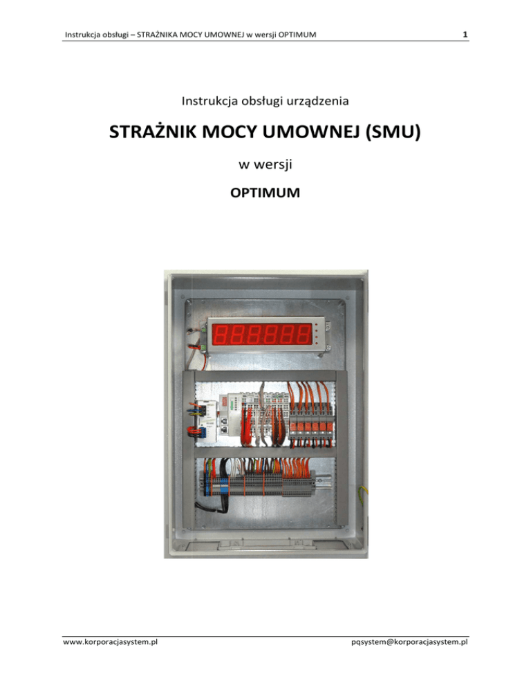 1 Instrukcja obsługi – STRAŻNIKA TRAŻNIKA MOCY UMOWNEJ w wersji OPTIMUM Instrukcja obsługi urządzenia STRAŻNIK MOCY UMOWNEJ (SMU) w wersji OPTIMUM www.korporacjasystem.pl [email protected] Instrukcja obsługi – STRAŻNIKA MOCY UMOWNEJ w wersji OPTIMUM 2 Spis treści Przeznaczenie urządzenia........................................................................................................................ 3 Zasada działania Strażnika Mocy Umownej (SMU) – tryb automatyczny ............................................... 3 Zasada działania Strażnika Mocy Umownej (SMU) – tryb alarmowy ...................................................... 3 Zanik zasilania SMU ................................................................................................................................. 3 Wyjścia sterujące ..................................................................................................................................... 4 Pierwsze uruchomienie ........................................................................................................................... 4 Wizualizacja – wstęp ............................................................................................................................... 4 Wymagania ogólne .............................................................................................................................. 4 Wywołanie strony z wizualizacją ......................................................................................................... 4 Okno logowania................................................................................................................................... 4 Prawa dostępu..................................................................................................................................... 5 Menu główne ...................................................................................................................................... 5 Strona główna ..................................................................................................................................... 6 Parametry ............................................................................................................................................ 7 Konfiguracja......................................................................................................................................... 8 Nastawy ........................................................................................................................................... 9 Okna konfiguracji odbiorników ..................................................................................................... 10 Okna konfiguracji Alarmów ........................................................................................................... 11 Profile................................................................................................................................................ 11 Energia ............................................................................................................................................... 13 Serwis .................................................................................................................................................... 14 Ogólne warunki gwarancji ..................................................................................................................... 15 Załącznik nr 1 ....................................................................................... Błąd! Nie zdefiniowano zakładki. Załącznik nr 2 ....................................................................................... Błąd! Nie zdefiniowano zakładki. Załącznik nr 3 ....................................................................................... Błąd! Nie zdefiniowano zakładki. www.korporacjasystem.pl [email protected] 3 Instrukcja obsługi – STRAŻNIKA MOCY UMOWNEJ w wersji OPTIMUM Przeznaczenie urządzenia „Strażnik Mocy Umownej” (SMU) jest urządzeniem przeznaczonym do kontroli mocy średniej 15 -minutowej i sterowania na tej podstawie pracą urządzeń w taki sposób, aby nie następowało przekraczanie mocy umownej. Dodatkowo urządzenie umożliwia kontrolę innych parametrów energii elektrycznej i podgląd ich wartości za pomocą wizualizacji. Zasada działania Strażnika Mocy Umownej (SMU) – tryb automatyczny Urządzenie SMU na podstawie pomiarów mocy czynnej oblicza prognozowaną wartość mocy średniej 15-minutowej. Obliczanie prognozy odbywa się na podstawie średnich mocy 1-minutowych w oknach 15-minutowych synchronizowanych z czasem rzeczywistym. Jeżeli obliczona przez urządzenie prognoza przekracza zadaną przez użytkownika wartość mocy umownej, urządzenie automatycznie odłącza odbiorniki przypisane do 1 stopnia regulacji. Po 1 minucie następuje ponowne obliczenie prognozy mocy. Jeżeli po odłączeniu urządzeń stopnia 1 prognoza mocy jest niższa niż zadana moc umowna, urządzenie nie podejmuje dalszych działań. Jeżeli natomiast nadal ma miejsce przekroczenie, urządzenie odłącza odbiorniki przypisane do kolejnych progów, aż do momentu gdy prognoza spadnie poniżej zadanego poziomu. W przypadku gdy, pomimo odłączenia wszystkich odbiorników nadal istnieje zagrożenie przekroczenia mocy umownej urządzenie włącza próg alarmowy (stopnień 4). Po obniżeniu prognozy mocy do poziomu pozwalającego na powtórne załączenie odłączonych odbiorników SMU automatycznie zezwala na pracę urządzeń przypisanych do poszczególnych progów. Załączanie odbywa się w odwrotnej kolejności niż wyłączanie. Jeżeli urządzenie nie steruje żadnymi urządzeniami, można zdefiniować progi alarmowe, przy których SMU uruchomi kolejne progi alarmu. Zasada działania Strażnika Mocy Umownej (SMU) – tryb alarmowy Urządzenie SMU na podstawie pomiarów mocy czynne