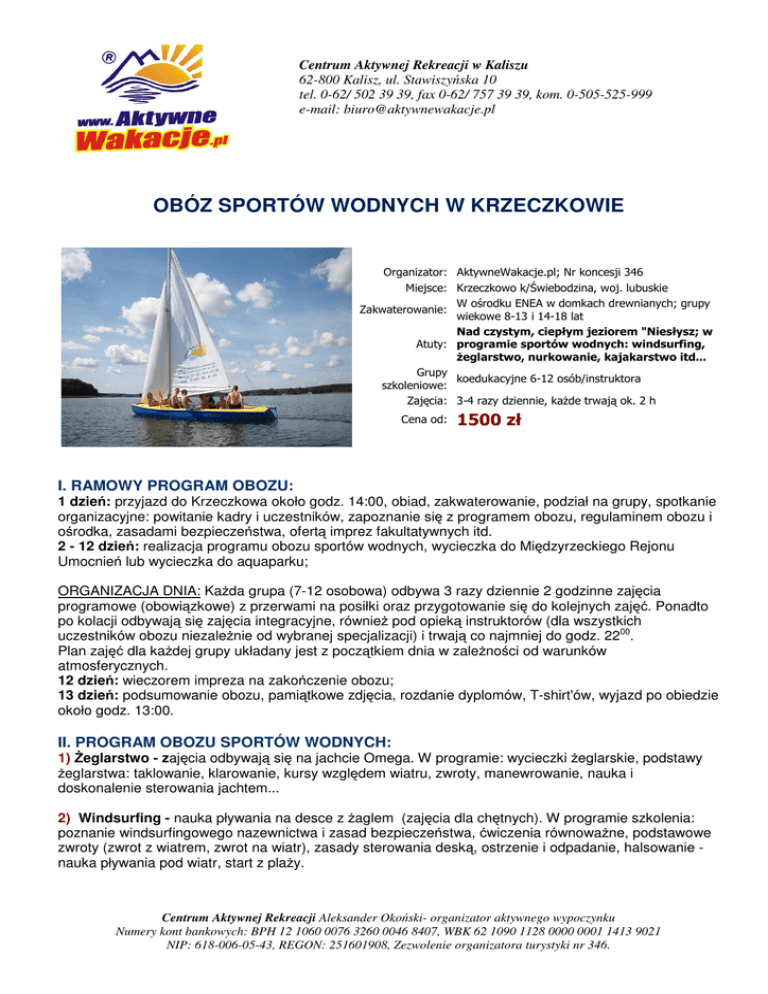 Centrum Aktywnej Rekreacji w Kaliszu 62-800 Kalisz, ul. Stawiszyńska 10 tel. 0-62/ 502 39 39, fax 0-62/ 757 39 39, kom. 0-505-525-999 e-mail: [email protected] OBÓZ SPORTÓW WODNYCH W KRZECZKOWIE Organizator: AktywneWakacje.pl; Nr koncesji 346 Miejsce: Krzeczkowo k/Świebodzina, woj. lubuskie W ośrodku ENEA w domkach drewnianych; grupy Zakwaterowanie: wiekowe 8-13 i 14-18 lat Nad czystym, ciepłym jeziorem "Niesłysz; w Atuty: programie sportów wodnych: windsurfing, żeglarstwo, nurkowanie, kajakarstwo itd... Grupy koedukacyjne 6-12 osób/instruktora szkoleniowe: Zajęcia: 3-4 razy dziennie, każde trwają ok. 2 h Cena od: 1500 zł I. RAMOWY PROGRAM OBOZU: 1 dzień: przyjazd do Krzeczkowa około godz. 14:00, obiad, zakwaterowanie, podział na grupy, spotkanie organizacyjne: powitanie kadry i uczestników, zapoznanie się z programem obozu, regulaminem obozu i ośrodka, zasadami bezpieczeństwa, ofertą imprez fakultatywnych itd. 2 - 12 dzień: realizacja programu obozu sportów wodnych, wycieczka do Międzyrzeckiego Rejonu Umocnień lub wycieczka do aquaparku; ORGANIZACJA DNIA: Każda grupa (7-12 osobowa) odbywa 3 razy dziennie 2 godzinne zajęcia programowe (obowiązkowe) z przerwami na posiłki oraz przygotowanie się do kolejnych zajęć. Ponadto po kolacji odbywają się zajęcia integracyjne, również pod opieką instruktorów (dla wszystkich uczestników obozu niezależnie od wybranej specjalizacji) i trwają co najmniej do godz. 2200. Plan zajęć dla każdej grupy układany jest z początkiem dnia w zależności od warunków atmosferycznych. 12 dzień: wieczorem impreza na zakończenie obozu; 13 dzień: podsumowanie obozu, pamiątkowe zdjęcia, rozdanie dyplomów, T-shirt'ów, wyjazd po obiedzie około godz. 13:00. II. PROGRAM OBOZU SPORTÓW WODNYCH: 1) Żeglarstwo - zajęcia odbywają się na jachcie Omega. W programie: wycieczki żeglarskie, podstawy żeglarstwa: taklowanie, klarowanie, kursy względem wiatru, zwroty, manewrowanie, nauka i doskonalenie sterowania jachtem... 2) Windsurfing - nauka pływania na desce z żaglem (zajęcia dla chętnych). W programie szkolenia: poznanie windsurfingowego nazewnictwa i zasad bezpieczeństwa, ćwiczenia równoważne, podstawowe zwroty (zwrot z wiatrem, zwrot na wiatr), zasady sterowania deską, ostrzenie i odpadanie, halsowanie nauka pływania pod wiatr, start z plaży. Centrum Aktywnej Rekreacji Aleksander Okoński- organizator aktywnego wypoczynku Numery kont bankowych: BPH 12 1060 0076 3260 0046 8407, WBK 62 1090 1128 0000 0001 1413 9021 NIP: 618-006-05-43, REGON: 251601908, Zezwolenie organizatora turystyki nr 346. ORGANIZACJA ZAJĘĆ z żeglarstwa i windsurfingu: grupa jest dzielona na dwie podgrupy (max. 6 osobowe), z których jedna w tym samym czasie ma zajęcia z żeglarstwa a druga z windsurfingu. Na kolejnych zajęciach następuje zmiana. 3) Kajakarstwo - każda grupa zostaje wyposażona w dwuosobowe kajaki, wiosła carbonowe naszej produkcji i kamizelki asekuracyjne. W programie: nauka i doskonalenie wiosłowania wiosłem wyczynowym, sterowania kajakiem, wywrotka, formowanie tratwy, holowanie kajaka, wycieczki po jeziorze i kanale niesulickim. 4) Nurkowanie: nauka nurkowania z płetwami, maską i fajką. W programie: przedmuchiwanie fajki, maski, nauka "scyzoryka", "poszukiwanie skarbów", eksploracja podwodna. 5) Pływanie: nauka i doskonalenie pływania, kąpiele, dla chętnych mały maraton, Uwaga: zajęcia z żeglarstwa, kajakarstwa oraz windsurfingu odbywają się w kamizelkach asekuracyjnych, natomiast z nurkowania i windsufringu w piankach neoprenowych. Instruktorzy prowadzący zajęcia nad wodą posiadają uprawnienia ratownika WOPR. 6) Zajęcia uzupełniające: - Strzelectwo: a) Wiatrówka (karabinek pneumatyczny): zajęcia odbywają się na mini strzelnicy na terenie ośrodka, uczestnicy w grupach po krótkim szkoleniu oddają strzały do tarczy. Wyniki mogą być notowane i klasyfikowane na zasadach turnieju. Dysponujemy najnowszej generacji karabinkiem pneumatycznym PCP zasilanym wysokoprężnym powietrzem, nie wymaga naciągania sprężyny ani łamania lufy. Osoby, które go używały wiedzą, że jest to nowa jakość zajęć ze strzelectwa. b) Łucznictwo: zajęcia odbywają się w terenie leśnym, uczestnicy biorą udział w krótkim szkoleniu, po czym każdy z nich oddaje od 3 do 5 strzałów z pół wyczynowego łuku do tarczy. Po zakończeniu kolejki zaczyna się kolejną. - Euro jumping - uczestnicy wykonują ewolucje w powietrzu skacząc na batucie do skoków akrobatycznych z asekuracją tzn. w uprzęży i bez uprzęży z asekuracją instruktora, - Wspinaczka skałkowa - zajęcia na sztucznej ściance z zabezpieczeniem (kask i uprząż), wysokość ścianki 7,5 m, - MTB - super lekkie rowery górskie - ciekawe wyprawy szlakami rowerowymi pozwalające zarówno mniej wprawnym rowerzystom jak i zaawansowanym poznać urokliwe okolice jeziora "Niesłysz", długość tras 2-25 km, do dyspozycji uczestników rowery górskie i kaski rowerowe. - Adrena-Liny: a) kolejka tyrolska (o długości 50-70m) - uczestnik zjeżdża z górnej stacji do dolnej na długiej linie, do której przypięty jest za pomocą uprzęży wspinaczkowej i specjalnego zestawu bloczków; rozwijana prędkość to nawet 40 km/h b) most linowy (o długości 50 m) – uczestnik przechodzi z jednego końca na drugi (np. nad wąwozem) po linie lub dwóch linach. W czasie próby jest przypięty za pomocą uprzęży wspinaczkowej i specjalnego zestawu bloczków do jednej z lin, - Gry i zabawy - dyskoteki, ogniska, podchody, turnieje piłki nożnej, siatkówki plażowej, streetballa, tenisa stołowego, zawody strong man, bule itp. Centrum Aktywnej Rekreacji Aleksander Okoński- organizator aktywnego wypoczynku Numery kont bankowych: BPH 12 1060 0076 3260 0046 8407, WBK 62 1090 1128 0000 0001 1413 9021 NIP: 618-006-05-43, REGON: 251601908, Zezwolenie organizatora turystyki nr 346. III. W CENIE OBOZU SPORTÓW WODNYCH: - zakwaterowanie - 12 nocleg