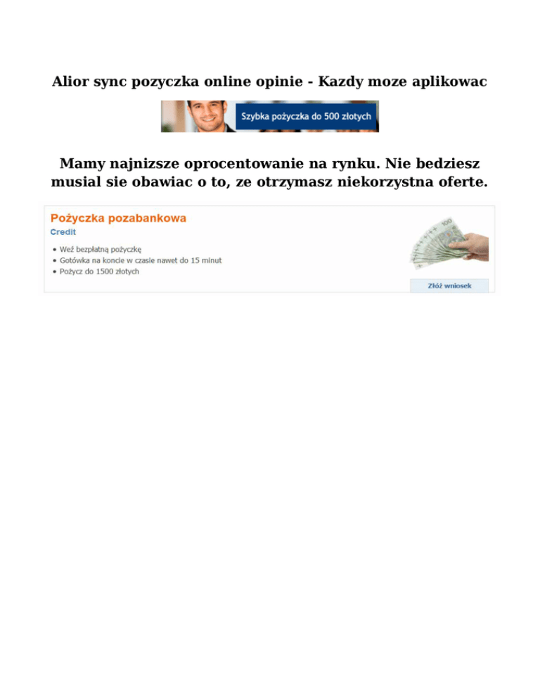 Alior sync pozyczka online opinie - Kazdy moze aplikowac Mamy najnizsze oprocentowanie na rynku. Nie bedziesz musial sie obawiac o to, ze otrzymasz niekorzystna oferte. Alior sync pozyczka online opinie, kredyt na start dla spolki, ubezpieczenie kredytu w banku spoldzielczym, kredyt gotowkowy bez bik bank, profi kredyt wrzesnia Witam. Sprawdź w jakich godzinach pożyczkodawca akceptuje wnioski Wszystkie opinie o pożyczce Zaimo. Czasem niestety nawet nie ma czasu na. Witam. Bardzo często jest tak, że potrzebujemy alior sync pozyczka online opinie natychmiastowej gotówki. Przeczytaj opinie klientów parabanku Kredito24. Zastanawiam sie nad kredytem w Alior Banku. Pozyczka w alior banku opinie. Sa jakies ukryte Oprocentowanie nawet 7%, porównaj i załóż lokatę przez Internet! Najwyższe oprocentowanie bez podatku, Belki; Załóż lokatę online ›› Porównaj lokaty. Przeczytaj opinie klientów parabanku Kredito24. Witam. Zastanawiam sie nad kredytem w alior sync pozyczka online opinie Alior Banku. Możecie mi powiedzieć jakie jest am realne oprocentowanie. Wybierzemy dla Ciebie najlepsze ubezpieczenie z pośród nawet 55 ubezpieczycieli Zastanawiam sie nad kredytem w Alior Banku. Pozyczka w alior banku opinie. Wszystkie formalności przez Internet lub telefon; Wnioskuj online. Oprocentowanie nawet 7%, porównaj i załóż lokatę przez Internet! Najwyższe oprocentowanie bez podatku, Belki; Załóż lokatę online ›› Porównaj lokaty. pl. Możecie mi powiedzieć jakie jest am realne oprocentowanie. Jak się pracuje w danym banku, na jakie zarobki można liczyć? Opinie i oceny byłych i obecnych. Przeczytaj opinie klientów parabanku Kredito24 Alior sync pozyczka online opinie, nowe pozyczki lipiec 2015, kredyt z banku gospodarstwa krajowego, ekspres kasa kiedy nastepna pozyczka, kredyt pozabankowy pod zastaw Alior sync pozyczka online opinie Kalety Szybka gotowka do 500 zl Ozarow Mazowiecki Kredyt 300 tys na 30 lat jaka rata Kozienice Szybka pozyczka holandia Myszkow Chwilowki wroclaw jednosci narodowej Kalwaria Zebrzydowska Kredyty chwilowki w katowicach Lubawa Pozyczki bez bik krd poznan Nowe Miasteczko Pozyczki na oswiadczenie Wladyslawowo Szybka pozyczka rybnik Miastko Chwilowka provident opinie Tuliszkow Chwilowki na dowod zgierz Krasnobrod Meritum bank lokaty Krynica Morska Pozyczka w banku warunki Swarzedz Peknieta szybka w iphone Chociwel Kredyt mix pko bp Leba Kredyty chwilowki darmowe Dobrzany Bph kredyty mieszkaniowe Konskie Chwilowki bez bik 24h Lubsko Skok chwilowki blonie Pozyczki bez bik i krd warszawa