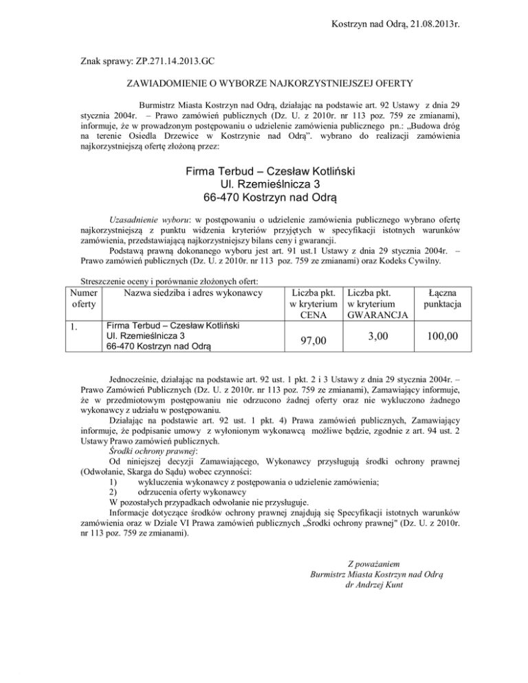 Kostrzyn nad Odrą, 21.08.2013r. Znak sprawy: ZP.271.14.2013.GC ZAWIADOMIENIE O WYBORZE NAJKORZYSTNIEJSZEJ OFERTY Burmistrz Miasta Kostrzyn nad Odrą, działając na podstawie art. 92 Ustawy z dnia 29 stycznia 2004r. – Prawo zamówień publicznych (Dz. U. z 2010r. nr 113 poz. 759 ze zmianami), informuje, że w prowadzonym postępowaniu o udzielenie zamówienia publicznego pn.: „Budowa dróg na terenie Osiedla Drzewice w Kostrzynie nad Odrą”. wybrano do realizacji zamówienia najkorzystniejszą ofertę złożoną przez: Firma Terbud – Czesław Kotliński Ul. Rzemieślnicza 3 66-470 Kostrzyn nad Odrą Uzasadnienie wyboru: w postępowaniu o udzielenie zamówienia publicznego wybrano ofertę najkorzystniejszą z punktu widzenia kryteriów przyjętych w specyfikacji istotnych warunków zamówienia, przedstawiającą najkorzystniejszy bilans ceny i gwarancji. Podstawą prawną dokonanego wyboru jest art. 91 ust.1 Ustawy z dnia 29 stycznia 2004r. – Prawo zamówień publicznych (Dz. U. z 2010r. nr 113 poz. 759 ze zmianami) oraz Kodeks Cywilny. Streszczenie oceny i porównanie złożonych ofert: Numer oferty 1. Nazwa siedziba i adres wykonawcy Firma Terbud – Czesław Kotliński Ul. Rzemieślnicza 3 66-470 Kostrzyn nad Odrą Liczba pkt. w kryterium CENA Liczba pkt. w kryterium GWARANCJA Łączna punktacja 97,00 3,00 100,00 Jednocześnie, działając na podstawie art. 92 ust. 1 pkt. 2 i 3 Ustawy z dnia 29 stycznia 2004r. – Prawo Zamówień Publicznych (Dz. U. z 2010r. nr 113 poz. 759 ze zmianami), Zamawiający informuje, że w przedmiotowym postępowaniu nie odrzucono żadnej oferty oraz nie wykluczono żadnego wykonawcy z udziału w postępowaniu. Działając na podstawie art. 92 ust. 1 pkt. 4) Prawa zamówień publicznych, Zamawiający informuje, że podpisanie umowy z wyłonionym wykonawcą możliwe będzie, zgodnie z art. 94 ust. 2 Ustawy Prawo zamówień publicznych. Środki ochrony prawnej: Od niniejszej decyzji Zamawiającego, Wykonawcy przysługują środki ochrony prawnej (Odwołanie, Skarga do Sądu) wobec czynności: 1) wykluczenia wykonawcy z postępowania o udzielenie zamówienia; 2) odrzucenia oferty wykonawcy W pozostałych przypadkach odwołanie nie przysługuje. Informacje dotyczące środków ochrony prawnej znajdują się Specyfikacji istotnych warunków zamówienia oraz w Dziale VI Prawa zamówień publicznych „Środki ochrony prawnej" (Dz. U. z 2010r. nr 113 poz. 759 ze zmianami). Z poważaniem Burmistrz Miasta Kostrzyn nad Odrą dr Andrzej Kunt