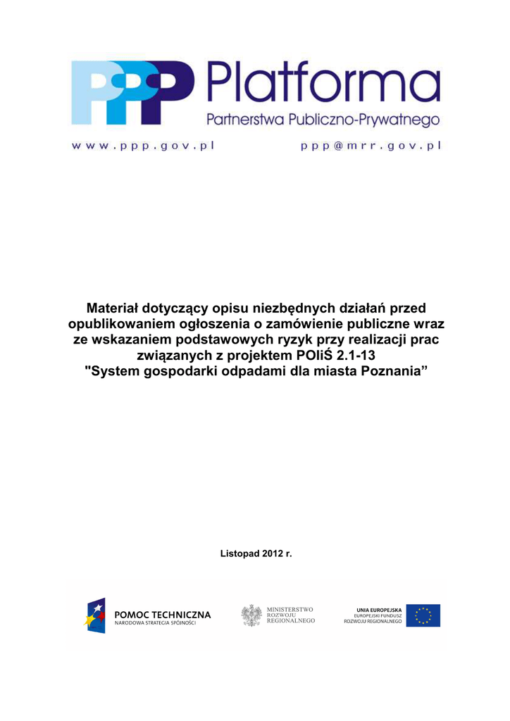 Materiał dotyczący opisu niezbędnych działań przed opublikowaniem ogłoszenia o zamówienie publiczne wraz ze wskazaniem podstawowych ryzyk przy realizacji prac związanych z projektem POIiŚ 2.1-13 "System gospodarki odpadami dla miasta Poznania” Listopad 2012 r. Warunki korzystania z niniejszej publikacji Niniejsza publikacja została opracowana w celu wzbogacenia i pobudzenia dyskusji na temat partnerstwa publiczno – prywatnego, w także w celu propagowania dobrych praktyk w tej dziedzinie. Jest ona wynikiem prac Platformy Partnerstwa Publiczno – Prywatnego powołanej z inicjatywy Ministra Rozwoju Regionalnego. Obserwacje, analizy, interpretacje i wnioski zawarte w przedmiotowym materiale nie stanowią oficjalnego stanowiska Ministerstwa Rozwoju Regionalnego (MRR) i nie mogą stanowić podstawy do formułowania jakichkolwiek roszczeń. Ponadto, MRR nie odpowiada za błędne interpretacje treści publikacji, ani za następstwa czynności podjętych na ich podstawie. W związku z tym użytkownik korzystający z informacji zawartych w niniejszej publikacji czyni to na swoją wyłączną odpowiedzialność. Ministerstwo Rozwoju Regionalnego upoważnia odbiorców niniejszej publikacji do jej użytkowania, pobierania, wyświetlania, kopiowania i rozpowszechniania, w całości lub w części, ze wskazaniem źródła pochodzenia cytowanych materiałów. Bezwzględnie zabronione jest wykorzystywanie niniejszego dokumentu i jego treści do celów komercyjnych. Dokument może zawierać odesłania do serwisów internetowych podmiotów trzecich. MRR nie ponosi odpowiedzialności za takie serwisy, a korzystanie z nich może podlegać szczegółowym warunkom. Publikacja stanowi opinię prawną opracowaną przez Ernst & Young Corporate Finance Sp. z o.o. oraz Kancelarię Domański, Zakrzewski, Palinka w zakresie Opisu niezbędnych do podjęcia kluczowych działań w celu opublikowania ogłoszenia o zamówieniu w terminie określonym przez Miasto wraz ze wskazaniem podstawowych ryzyk, związaną z projektem POIiŚ 2.1 – 13 „System gospodarki odpadami dla miasta Poznania”, sporządzoną na zlecenie MRR w lutym 2011 r. Wprowadzone przez MRR zmiany w treści dokumentu mają charakter redakcyjny. Przygotowanie niniejszej opinii było współfinansowane ze środków Europejskiego Funduszu Rozwoju Regionalnego w ramach Programu Operacyjnego Pomoc Techniczna 2007 – 2013. Materiał opracowany przez: Departament Przygotowania Projektów Indywidualnych Ministerstwo Rozwoju Regionalnego ul. Wspólna 2/4, 00 – 926 Warszawa tel. (22) 461 39 45 poczta elektr.: [email protected] 2 Wstęp Kancelaria Domański Zakrzewski Palinka (Doradca Prawny) oraz Ernst & Young (Doradca Finansowy) zostały wybrane przez Ministerstwo Rozwoju Regionalnego jako doradcy dla projektów ppp, w tym dla projektu realizowanego przez miasto Poznań (Miasto). W dn. 31 stycznia 2011 r. odbyło się spotkanie z przedstawicielami Miasta, wykonawcą dokumentacji aplikacyjnej firmą Socotec Polska Sp z o.o. (Socotec) oraz przedstawicielami Ministerstwa Rozwoju Regionalnego, które współfinansuje przygotowanie projektu. Zgodnie z przekazanymi informacjami intencją miasta jest przeprowadzenie procesu pozyskania inwestora prywatnego w oparciu o dotychczasowe wyniki analiz oraz założenia projektowe przedstawione w dokumentacji aplikacyjnej, w tym w dokumencie Ostateczne Studium Wykonalności dla przedsięwzięcia „System gospodarki odpadami dla miasta Poznania” wraz z załącznikami przygotowanym przez Socotec ze stycznia 2011 r. (Studium Wykonalności). Dokumentacja niniejsza określa w szczególności: ■ wielkość finansowania niezbędną do dostarczenia przez partnera prywatnego; ■ poziom dofinansowania ze środków Unii Europejskiej; ■ poziom zaangażowania Miasta (wpływający w minimalnym stopniu na prognozowany budżet i wskaźniki zadłużenia Miasta), tj.: — wkład finansowy Miasta (środki własne Miasta na finansowanie nakładów : inwestycyjnych Projektu na poziomie ok. 5%); — brak udzielenia przez Miasto gwarancji finansowych, w tym w odniesieniu do strumienia odpadów oraz sprzedaży energii; ■ formułę realizacji inwestycji DBFO (Design-Build-Finance-Operate). W modelu tym wybrany w trybie Ustawy o PPP podmiot prywatny będzie odpowiedzialny za całość realizacji Projektu: od zaprojektowania, budowy, poprzez sfinansowanie i eksploatację obiektu w okresie umowy; ■ opis trybu postępowania z wnioskiem o dofinansowanie, prowadzeniem postępowania dotyczącego wyboru partnera prywatnego wraz z harmonogramem działań. Rozumiemy ponadto, iż celem Miasta jest wszczęcie postępowania dotyczącego wyboru partnera prywatnego (tj. publikacji ogłoszenia), nie później niż 1 kwietnia 2011 r. W związku z powyższym założeniem, w naszej ocenie, przed opublikowaniem ogłoszenia, minimalny i niezbędny zakres działań, które Miasto powinno podjąć (wraz z określeniem ew. ryzyk związanych z brakiem ich podjęcia) obejmuje: 1. Określenie wstępnej struktury prawnej Projektu oraz trybu wyboru partnera prywatnego Zgodnie z Ustawą o PPP wybór partnera prywatnego może nastąpić albo zgodnie z przepisami Prawa Zamówień Publicznych albo Ustawy o koncesji. Określenie trybu postępowania jest krytyczne dla publikacji ogłoszenia. Bez względu na to czy projekt będzie realizowany w ramach prawa zamówień publicznych czy koncesji, Miasto będzie mogło wykorzystać elastyczny tryb wyboru partnera prywatnego (odpowiednio dialog konkurencyjny lub negocjacje). Zdefiniowana na tym etapie wstępna struktura prawna zostanie zweryfikowana w ramach badania rynku, a następnie, zgodnie z Ustawą o PPP, Miasto będzie mieć podstawę prawną do prowadzenia negocjacji (dialogu) z zainteresowanymi podmiotami prywatnymi we wszystkich obszarach dotyczących projektu, w tym modelu prawnego, finansowego i technicznego. Prowadzony dialog doprowadzi do wypracowania ostatecznego kształtu transakcji. Należy jed