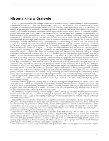 Historia kina w Grajewie W 1921 r. członkowie Dozoru Kościelnego, w składzie: ks. Józef Butanowicz, Szczepan Bielawski, Józef Przekopowski, Aleksander Grochowski, Andrzej Kumkowski, Konstanty Antosiewicz, dla podniesienia poziomu kulturalno-oświatowego wśród parafjan, podjęli decyzję o powstaniu Domu Parafialnym przy ul. Rajgrodzkiej. I to właśnie w tym budynku ks. Butanowicz uruchomił pierwsze grajewskie kino, które było niewątpliwą atrakcją dla mieszkańców Grajewa. Pierwotnie było to kino nieme i egzystowało ono pod nazwą „Apollo”, a następnie od 1934 r. już jako dźwiękowe pod nazwą „Reduta”. Współwłaścicielami tego drugiego obok księdza Gawędzkiego byli Żyd Sutkier oraz Pieczyński. W repertuarze przeważały filmy o tematyce narodowej, społecznej i religijnej. Mimo tego szczególnie w pierwszym okresie swej działalności, kino nie zawsze spotykało się z przychylnością nieco zaściankowego grajewskiego społeczeństwa. Jeden z oburzonych mieszkańców, któremu nie spodobała się zbyt frywolna jego zdaniem reklama filmu wisząca na zewnętrznej ścianie dzwonnicy, tak pisał w 1925 r. do lokalnej prasy: (...) jest to co najmniej krzycząca niewłaściwość, mur kościelny do reklam tego typu wcale się nie nadaje, a skoro kino jest w domu parafjalnym i tuż przy kościele, nic nie może być tam wystawione, coby obrażało poczucie religijne dobrych katolików i chrześcijan w ogóle. (...) W ogóle kinematograf nie należy do instytucji umoralniających i oświecających, ale raczej do... ujemnych... Czyżby się nie dało zużytkować wspaniały lokal w Grajewie z większą korzyścią materjalną i umysłową na instytucje kulturalne wyłącznie. Odpowiedzi na powyższe zarzuty w kolejnym numerze pisma udzielił sam burmistrz, pisząc m.in.: (...) Przedewszystkiem kino-teatry nie są placówkami zepsucia jak również i wywieszanie afiszów nie może być zbrodnią. (...) Co do kina w Grajewie, to nie zauważyłem dotąd, by w takowym dawane były obrazy nie cenzurowane i niedopuszczalne ze względu na publiczną przyzwoitość i moralność. (...) Ale jak to zwykle u nas bywa, więcej chodziło na pewno o rzucenie trochę błota na tego kogoś, który coś niecoś z siebie daje społeczeństwu i tem samem wzbudza w miernotach, karłach, małomiasteczkowych kacykach syk zazdrości. Filmy wyświetlano tylko w piątek, sobotę i niedzielę. Bilety kosztowały od 70 groszy do 1 złotego w zależności od miejsca, loże były droższe bo po 1,20 zł. Stąd między innymi dosyć często bilety do kina były nagrodami w różnego rodzaju zawodach lub w przypadku strzelców z 9 psk wyróżnieniem za dobrą postawę podczas szkolenia. Dodatkowo kino to było wykorzystywane przez 9 pułk strzelców konnych w celu organizacji seansów filmów propagandowych i szkoleniowych dla żołnierzy i kadry zawodowej. Również działające w pułku Koło Polskiego Białego Krzyża organizowało bezpłatne seanse filmów z bieżącego repertuaru kina, na które uczęszczały pododdziały pułku. Kino to nie przetrwało jednak wydarzeń II wojny światowej. Po wojnie od czasu do czasu zaglądało do Grajewa tylko kino ruchome, choć istniał budynek, w którym można było umieścić je na stałe. Budynkiem tym był gmach przedwojennej synagogi. Murowany budynek grajewskiej synagogi przy ob. ul. Wojska Polskiego został wybudowany ok. 1871 r. W roku 1900 uległ rozbudowie i w takiej roli funkcjonował aż do IX 1939 r. W trakcie działań wojennych kampanii wrześniowej 1939 r. budynek synagogi został spalony. Po wkroczeniu Armii Czerwonej, w trakcie pierwszej okupacji sowieckiej, spalony budynek został przebudowany i od XI 1940 r. Urządzono w nim Sowiecki Dom Kultury o 400 miejscach. W okresie okupacji niemieckiej nadal pełnił rolę „Kulturhaus” czyli domu Po zakończeniu II wojny światowej budynek stał przez pewien czas pusty. W radzie miejskiej zastanawiano się bezowocnie przez kilka lat, co zrobić z rozległym budynkiem. Wreszcie PSS, nie pytając nikogo o zdanie, odremontowała parter i zajęła go na gospodę. To poruszyło miejscowe społeczeństwo. Podjęto w czynie społecznym odbudowę gmachu na kino. 6 lipca 1950 ponownie otwarto w Grajewie kino, a jego kinooperatorem został Stanisław Buzon. Kino przyjęło nazwę „Przyjaźń” i mogło pomieścić 320 osób, jego pierwszym kierownikiem został Jan Romanowski. Przez pierwszy rok wyświetlano filmy na aparaturze wąskotaśmowej, dopiero później pozyskano aparaturę normalnotaśmową. Filmy wyświetlano 6 dni w tygodniu, zaś w poniedziałki na scenie występowały zespoły z białostockiego teatru. Dobre wrażenie sprawiała również poczekalnia kina, w której oczekujący na seans mogli zapoznać się z rozłożonymi na stolikach pismami filmowymi, literackimi i prasą codzienną. Grajewskie kino nawiązało ścisłą współpracę z uczniami szkoły podstawowej TPD. Jak pisał w 1955 r. redaktor „Kinotechnikii”: Nauczyciele organizują wycieczki do kina na wszystkie filmy młodzieżowe, a po pokazach uczniowie w szkole piszą na ich temat wypracowania i przeprowadzają ożywione dyskusje. W okresie festiwalów i innych akcji masowych pomagają załodze w dekorowaniu kina, co ze względu na wysoki fronton i rozległy gmach nie jest znów sprawą taką bardzo prostą. Kierownik szkoły, ob. Władysław Urbanek, jest czynnym miłośnikiem sztuki filmowej i propaguje ją w szkole, która posiada już własny aparat wąskotaśmowy. Kino wychodziło wówczas ze swoją działalnością także poza miasto. Miało bowiem pod swoim patronatem trzy kina 1 wiejskie w powiecie, a mianowicie w Prostkach, Radziłowie i Wąsoszu. Na parterze i w piwnicach budynku nadal jednak funkcjonowała gospoda PSS, a na piętrze miejska biblioteka, co nie ułatwiało pracy kina. Konsumenci gospody wszczynali awantury z publicznością kina, zrywali afisze, zanieczyszczali schody i przedsionek