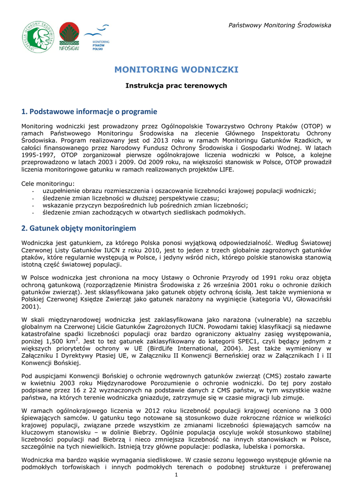 Państwowy Monitoring Środowiska MONITORING WODNICZKI Instrukcja prac terenowych 1. Podstawowe informacje o programie Monitoring wodniczki jest prowadzony przez Ogólnopolskie Towarzystwo Ochrony Ptaków (OTOP) w ramach Państwowego Monitoringu Środowiska na zlecenie Głównego Inspektoratu Ochrony Środowiska. Program realizowany jest od 2013 roku w ramach Monitoringu Gatunków Rzadkich, w całości finansowanego przez Narodowy Fundusz Ochrony Środowiska i Gospodarki Wodnej. W latach 1995-1997, OTOP zorganizował pierwsze ogólnokrajowe liczenia wodniczki w Polsce, a kolejne przeprowadzono w latach 2003 i 2009. Od 2009 roku, na większości stanowisk w Polsce, OTOP prowadził liczenia monitoringowe gatunku w ramach realizowanych projektów LIFE. Cele monitoringu: - uzupełnienie obrazu rozmieszczenia i oszacowanie liczebności krajowej populacji wodniczki; - śledzenie zmian liczebności w dłuższej perspektywie czasu; - wskazanie przyczyn bezpośrednich lub pośrednich zmian liczebności; - śledzenie zmian zachodzących w otwartych siedliskach podmokłych. 2. Gatunek objęty monitoringiem Wodniczka jest gatunkiem, za którego Polska ponosi wyjątkową odpowiedzialność. Według Światowej Czerwonej Listy Gatunków IUCN z roku 2010, jest to jeden z trzech globalnie zagrożonych gatunków ptaków, które regularnie występują w Polsce, i jedyny wśród nich, którego polskie stanowiska stanowią istotną część światowej populacji. W Polsce wodniczka jest chroniona na mocy Ustawy o Ochronie Przyrody od 1991 roku oraz objęta ochroną gatunkową (rozporządzenie Ministra Środowiska z 26 września 2001 roku o ochronie dzikich gatunków zwierząt). Jest sklasyfikowana jako gatunek objęty ochroną ścisłą. Jest także wymieniona w Polskiej Czerwonej Księdze Zwierząt jako gatunek narażony na wyginięcie (kategoria VU, Głowaciński 2001). W skali międzynarodowej wodniczka jest zaklasyfikowana jako narażona (vulnerable) na szczeblu globalnym na Czerwonej Liście Gatunków Zagrożonych IUCN. Powodami takiej klasyfikacji są niedawne katastrofalne spadki liczebności populacji oraz bardzo ograniczony aktualny zasięg występowania, poniżej 1,500 km2. Jest to też gatunek zaklasyfikowany do kategorii SPEC1, czyli będący jednym z większych priorytetów ochrony w UE (BirdLife International, 2004). Jest także wymieniony w Załączniku I Dyrektywy Ptasiej UE, w Załączniku II Konwencji Berneńskiej oraz w Załącznikach I i II Konwencji Bońskiej. Pod auspicjami Konwencji Bońskiej o ochronie wędrownych gatunków zwierząt (CMS) zostało zawarte w kwietniu 2003 roku Międzynarodowe Porozumienie o ochronie wodniczki. Do tej pory zostało podpisane przez 16 z 22 wyznaczonych na podstawie danych z CMS państw, w tym wszystkie ważne państwa, na których terenie wodniczka gniazduje, zatrzymuje się w czasie migracji lub zimuje. W ramach ogólnokrajowego liczenia w 2012 roku liczebność populacji krajowej oceniono na 3 000 śpiewających samców. U gatunku tego notowane są stosunkowo duże rokroczne różnice w wielkości krajowej populacji, związane przede wszystkim ze zmianami liczebności śpiewających samców na kluczowym stanowisku – w dolinie Biebrzy. Ogólnie populacja oscyluje wokół stosunkowo stabilnej liczebności populacji nad Biebrzą i nieco zmniejsza liczebność na innych stanowiskach w Polsce, szczególnie na tych niewielkich. Istnieją trzy główne populacje: podlaska, lubelska i pomorska. Wodniczka ma bardzo wąskie wymagania siedliskowe. W czasie sezonu lęgowego występuje głównie na podmokłych torfowiskach i innych podmokłych terenach o podobnej strukturze i preferowanej 1 głębokości wody 1-10 cm. Na naturalnych siedliskach wybiera prawdopodobnie mezotroficzne i lekko eutroficzne zalewowe torfowiska, które pozostają otwarte, ponieważ poziom wody oscyluje w nich razem ze zmianami poziomu wody w rzece. Wodniczka jest gatunkiem charakterystycznym cennego ugrupowania ptaków, w którego skład wchodzą takie gatunki jak: kszyk Gallinago gallinago, dubelt Gallinago media, kulik wielki Numenius arquata, rycyk Limosa limosa, kropiatka Porzana porzana oraz sowa błotna Asio fammeus. Część siedlisk zajmowanych przez wodniczkę jest cenna również z punktu widzenia Dyrektywy Siedliskowej (siedliska przyrodnicze: 6410, 6510, 7140, 7150, 7210, 7230). Obecność wodniczki często wskazuje na wysokie walory przyrodnicze obszaru. 3. Parametry populacyjne podlegające rejestracji Rejestrowane są dwa parametry populacyjne: - liczba samców na poszczególnych stanowiskach; liczba samców na transektach objętych monitoringiem. 4. Definicja populacji docelowej Populacją docelową jest cała populacja lęgowa w granicach kraju. Jako poziom referencyjny areału wodniczki w Polsce można przyjąć dane z ogólnokrajowych inwentaryzacji z 2009 i 2012 roku. Istnieją trzy główne populacje: 1. Populacja podlaska, w północno-wschodniej Polsce, w dolinach Biebrzy oraz Narwi: Jest to największa populacja w Polsce, z 2 710 śpiewającymi samcami w roku 2012 (85% krajowej populacji gatunku). 2. Populacja lubelska, w południowo-wschodniej Polsce: w 2012 ok. 490 śpiewających samców zajmowało dwa kompleksy torfowisk w obrębie Poleskiego Parku Narodowego oraz Chełmskich Torfowisk Węglanowych. Niewielkie stanowiska utrzymują się na torfowisku Ciesacin, w dolinie Szyszły oraz przy zbiorniku Żelizna. 3. Populacja pomorska wraz z Ujściem Warty (Dolina Dolnej Odry, Delta Odry i Świny, PN Ujście Warty) - 31 samców w 2012. W 2012 roku zasiedlone były tylko 3 stanowiska. Największe stanowisko, na którym w ostatnich latach występuje znaczna część populacji pomorskiej, znajduje się na Bagnach Rozwarowskich w okolicach Wolina. Kilka niewielkich stanowisk znajduje się w centralnej Polsce i może stanowić połączenie między poszczególnymi populacjami, Jest to przede wszystkim Dolina Neru z maksymalnie 10 śpiewającymi samcami w 2007 roku, ale ty