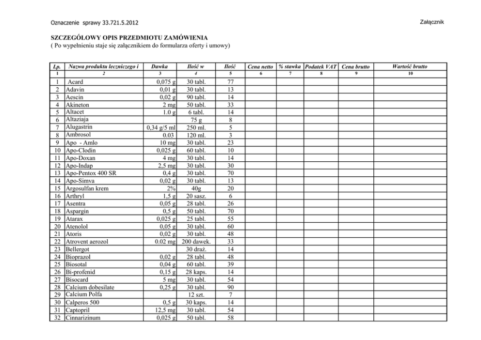 Załącznik Oznaczenie sprawy 33.721.5.2012 SZCZEGÓLOWY OPIS PRZEDMIOTU ZAMÓWIENIA ( Po wypełnieniu staje się załącznikiem do formularza oferty i umowy) Lp. 1 1 2 3 4 5 6 7 8 9 10 11 12 13 14 15 16 17 18 19 20 21 22 23 24 25 26 27 28 29 30 31 32 Nazwa produktu leczniczego i 2 wyrobu medycznego Acard Adavin Aescin Akineton Altacet Altaziaja Alugastrin Ambrosol Apo - Amlo Apo-Clodin Apo-Doxan Apo-Indap Apo-Pentox 400 SR Apo-Simva Argosulfan krem Arthryl Asentra Aspargin Atarax Atenolol Atoris Atrovent aerozol Bellergot Bioprazol Biosotal Bi-profenid Bisocard Calcium dobesilate Calcium Polfa Calperos 500 Captopril Cinnarizinum Dawka 3 produktu 0,075 g 0,01 g 0,02 g 2 mg 1.0 g 0,34 g/5 ml 0.03 10 mg 0,025 g 4 mg 2,5 mg 0,4 g 0,02 g 2% 1,5 g 0,05 g 0,5 g 0,025 g 0,05 g 0,02 g 0.02 mg 0,02 g 0,04 g 0,15 g 5 mg 0,25 g 0,5 g 12,5 mg 0,025 g Ilość w 4 opakowaniu 30 tabl. 30 tabl. 90 tabl. 50 tabl. 6 tabl. 75 g 250 ml. 120 ml. 30 tabl. 60 tabl. 30 tabl. 30 tabl. 30 tabl. 30 tabl. 40g 20 sasz. 28 tabl. 50 tabl. 25 tabl. 30 tabl. 30 tabl. 200 dawek. 30 draż. 28 tabl. 60 tabl. 28 kaps. 30 tabl. 30 tabl. 12 szt. 30 kaps. 30 tabl. 50 tabl. Ilość Cena netto % stawka Podatek VAT Cena brutto 5 6 7 8 9 opakowań VAT 77 13 14 33 14 8 5 3 23 10 14 30 70 13 20 6 26 70 55 60 48 33 14 48 39 14 54 90 7 14 54 58 Wartość brutto 10 (5x9) 33 34 35 36 37 38 39 40 41 42 43 44 45 46 47 48 49 50 51 52 53 54 55 56 57 58 59 60 61 62 63 64 65 66 67 68 69 70 71 72 Clotrimazolum krem Codipar Cyclo 3 Forte Diabrezide Diaprel MR Diclac Digoxin BM Disalunil Diosminex Doxar Effox Effox Effox Effox Enarenal Enarenal Enarenal Espumisan Estazolam Euclamin Euphyllina CR Exelon Exelon Falvit Febrofen Fibrolan maść Flegamina syrop Flegamina tabl. Furaginum Furosemid Glucobay Glucobay Glucosum Gentamicin Halidor Hemofer F Hydroxyzinum Hydroxyzinum Hygroton Ibuprom 1% 0,5 g 150 mg. 80 mg 30 mg 0,05 g 0,1g 0,025 g 0,5 g. 4 mg 0,01 g 0,02 g 0,05 g 0,075 g 0,01 g 0,05 g 0,02 g 0,04 g 2 mg 5 mg 250 3 mg 1,5 mg 0,2g 0,08g/100ml 8 mg 0,05g 0,04 g 0.1 g. 0,05 g 5% 40mg/1ml 0,1 g 0,01 g 0,25 g 0,05 g 0,2 g 20 g 12 tabl. 30 kaps. 40 tabl. 60 tabl. 50 tabl. 30 tabl. 30 tabl. 60 tabl. 30 tabl. 60 tabl. 50 tabl. 30 tabl. 30 tabl. 60 tabl. 60 tabl. 60 tabl. 100 tabl. 20 tabl. 60 tabl. 30 tabl. 28 tabl. 28 tabl. 30 tabl. 20 tabl. 25g 120 ml 20 tabl. 30 tabl. 30 tabl. 30 tabl. 30 tabl. 500 ml 10 amp. 1 ml 60 tabl. 30 draż 30 tabl. 30 tabl. 20 tabl. 10 szt. 42 38 30 102 6 15 96 30 10 27 20 25 16 24 41 96 34 22 108 34 77 27 7 20 27 22 14 14 92 277 36 12 108 15 14 26 50 48 15 10 73 74 75 76 77 78 79 80 81 82 83 84 85 86 87 88 89 90 91 92 93 94 95 96 97 98 99 100 101 102 103 104 105 106 107 108 109 110 Kaldyum Kaldyum Kalipoz prolongatum Ketonal forte Kompres gazowy 9 cm Kompres Medicomp 7,5 Krople miętowe Krople żołądkowe Lactulosum Lignocainum żel „U" Linomag maść Lioton żel Lorafen Lorafen Lovastyna Lucetam Madopar Madopar HBS Majamil MeloxiLek 15 Memotropil Memotropil Metformax Mianserin Molsidomina Mononit Mononit Multi witamina Mydocalm Naproxen 10% żel Neomycinum aerozol Nilogrin Nimesil gran. Nimwastid Nitrazepam Nitrendypina Nitrendypina Nootropil 0,315 g 0,315 g 0,75 g 0,1g 50 kaps. 100 kaps. 30 tabl. 30 tabl. 3 szt. 100 szt. 35 g. 35 g. 2% 0,2 g 8,5 mg 1 mg 2,5 mg 20 mg 0,8 g 250 mg 125 mg 0,05 g 0,015 g 0,8 g 1,2 g 0,85 g 10 mg 4 mg 0,01g 0,02 g 0,05 g 0,01 g 0,01 g 0,1 g 3 mg 0,005 g 0,01g 0,02 g 1,2 g 150 ml 30 g 30 g 50 g 25 draż. 25 draż. 28 tabl. 30 tabl. 100 tabl. 100 tabl. 20 tabl. 10 tabl. 60 tabl. 60 tabl. 30 tabl. 30 tabl. 30 tabl. 60 tabl. 60 tabl. 50 draż. 30 tabl. 50 g 30 ml 30 tabl. 9 sasz. 28 tabl. 20 tabl. 30 tabl. 30 tabl. 60 tabl. 14 20 75 72 318 18 6 8 46 22 16 30 16 60 45 16 16 60 36 15 21 38 48 90 15 19 36 15 39 16 14 14 37 20 120 58 48 17 111 112 113 114 115 116 117 118 119 120 121 122 123 124 125 126 127 128 129 130 131 132 133 134 135 136 137 138 139 140 141 142 143 144 145 146 147 No-Spa Nutrof Omnic Ocas Opaska dziana 4mm x 10 Opaska dziana 4mm x 15 Oxycardil Paracetamol Pelethrocin Płyn wieloelektrolitowy Polocard Polocard Polopiryna S Polprazol Prestarìum Prestarium Pridinol Promazin Promazin Promazin Pronoran Propranolol Pyralginum Ranigast Rawel SR Relanium Relanium Rivanol Rutinoscorbin Simvacard Sinemet Siofor Solcoseryl maść Sorbifer durules Sól fizjologiczna Spironol Spironol Staveran prolong. 0,04 g 0,4 mg 180 mg 0,5 g 0,45g+0,05g 0,075 g 0,15 g 0,3 g 0,02 g 5 mg 10 mg 5 mg 25 mg. 50 mg 100 mg 0,05 g 0,01g 0,5 g 0,15 g 1,5 mg 2 mg 5 mg 0,1 g 0,02 g 0,2 g 0.5 g 5% 0,009 0,025 g 0,1g 0,12 g 20 tabl. 36 kaps. 30 tabl. 180 szt. 72 szt. 30 tabl. 20 tabl. 30 tabl. 500 ml 60 tabl. 60 tabl. 20 tabl. 28 kaps. 30 tabl. 30 tabl. 50 tabl. 60 draż 60 draż 60 draż 30 tabl. 50 kaps. 10 tabl. 60 tabl. 30 tabl. 20 tabl. 20 tabl. 5 tabl. 90 tabl. 28 kaps. 50 kaps. 30 tabl. 20 g 50 tabl. 500 ml 20 tabl. 20 tabl. 20 tabl. 27 17 10 34 10 20 102 77 52 46 20 36 12 34 34 12 12 15 36 35 36 48 20 192 12 32 44 32 24 39 17 192 132 48 66 148 149 150 151 152 153 154 155 156 157 158 159 160 161 162 163 164 165 166 167 168 169 170 171 172 173 Staveran Sudocrem krem Sylimarol Tardyferon Tertensif SR Theospirex Theovent Tialorid Tialorid Tramundin Tritace Tritace Unidox Solutab Venoruton 300 Venoruton Forte Venotrex Verospiron Vicebrol Vilpin Vinpocetina Vinpoton Vit.B compositum Vit.B6 Vit.C Vitreolent krople do oczu Vivacor 40 mg 0,035 g 0,08 g 1,5 mg 0,3 g 0,3 g 5m+0,05 g 0,1 g 0,1 g 5 mg 10 mg 100 mg 0,3 g 500 mg 0,3 g 50 mg 5 mg 10 mg 0,005 g 5 mg 0,05 g 0,2 g 6,25 mg 20 tabl. 125 g 60 tabl. 30 tabl. 30 tabl. 50 kaps. 50 kaps. 50 kaps. 30 tabl. 30 tabl. 28 tabl. 28 tabl. 10 tabl. 50 tabl. 30 tabl. 50 tabl. 30 tabl. 50 tabl. 30 tabl. 50 tabl. 50 tabl. 50 draż. 50 tabl. 60 tabl. 10 ml 30 tabl. 40 66 34 20 62 29 144 156 39 36 34 24 26 39 20 20 53 24 12 36 24 18 63 19 12 2 RAZEM :