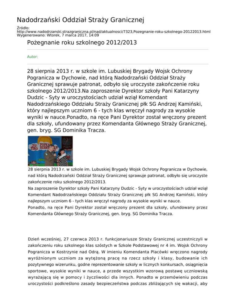 Nadodrzański Oddział Straży Granicznej Źródło: http://www.nadodrzanski.strazgraniczna.pl/nad/aktualnosci/7323,Pozegnanie-roku-szkolnego-20122013.html Wygenerowano: Wtorek, 7 marca 2017, 14:09 Pożegnanie roku szkolnego 2012/2013 Autor: 28 sierpnia 2013 r. w szkole im. Lubuskiej Brygady Wojsk Ochrony Pogranicza w Dychowie, nad którą Nadodrzański Oddział Straży Granicznej sprawuje patronat, odbyło się uroczyste zakończenie roku szkolnego 2012/2013.Na zaproszenie Dyrektor szkoły Pani Katarzyny Dudzic - Syty w uroczystościach udział wziął Komendant Nadodrzańskiego Oddziału Straży Granicznej płk SG Andrzej Kamiński, który najlepszym uczniom 6 - tych klas wręczył nagrody za wysokie wyniki w nauce.Ponadto, na ręce Pani Dyrektor został wręczony prezent dla szkoły, ufundowany przez Komendanta Głównego Straży Granicznej, gen. bryg. SG Dominika Tracza. 28 sierpnia 2013 r. w szkole im. Lubuskiej Brygady Wojsk Ochrony Pogranicza w Dychowie, nad którą Nadodrzański Oddział Straży Granicznej sprawuje patronat, odbyło się uroczyste zakończenie roku szkolnego 2012/2013. Na zaproszenie Dyrektor szkoły Pani Katarzyny Dudzic - Syty w uroczystościach udział wziął Komendant Nadodrzańskiego Oddziału Straży Granicznej płk SG Andrzej Kamiński, który najlepszym uczniom 6 - tych klas wręczył nagrody za wysokie wyniki w nauce. Ponadto, na ręce Pani Dyrektor został wręczony prezent dla szkoły, ufundowany przez Komendanta Głównego Straży Granicznej, gen. bryg. SG Dominika Tracza. Dzień wcześniej, 27 czerwca 2013 r. funkcjonariusze Straży Granicznej uczestniczyli w zakończeniu roku szkolnego klas szóstych w Szkole Podstawowej nr 4 im. Wojsk Ochrony Pogranicza w Kostrzynie nad Odrą. W imieniu Komendanta Placówki wręczono nagrody wyróżnionym uczniom za wytężoną pracę na rzecz szkoły i klasy, budowanie ich pozytywnego wizerunku, godne reprezentowanie szkoły w licznych konkursach, osiągnięcia sportowe, wysokie wyniki w nauce, a przede wszystkim wzorową postawę uczniowską wyrażającą się w pomocy i życzliwości dla innych. Ponadto w przemówieniu podczas uroczystości podkreślono zasady bezpieczeństwa podczas zbliżających się wakacji, aby każdy z uczniów spędził je miło i bezpiecznie, a we wrześniu mógł powrócić do dalszej nauki.