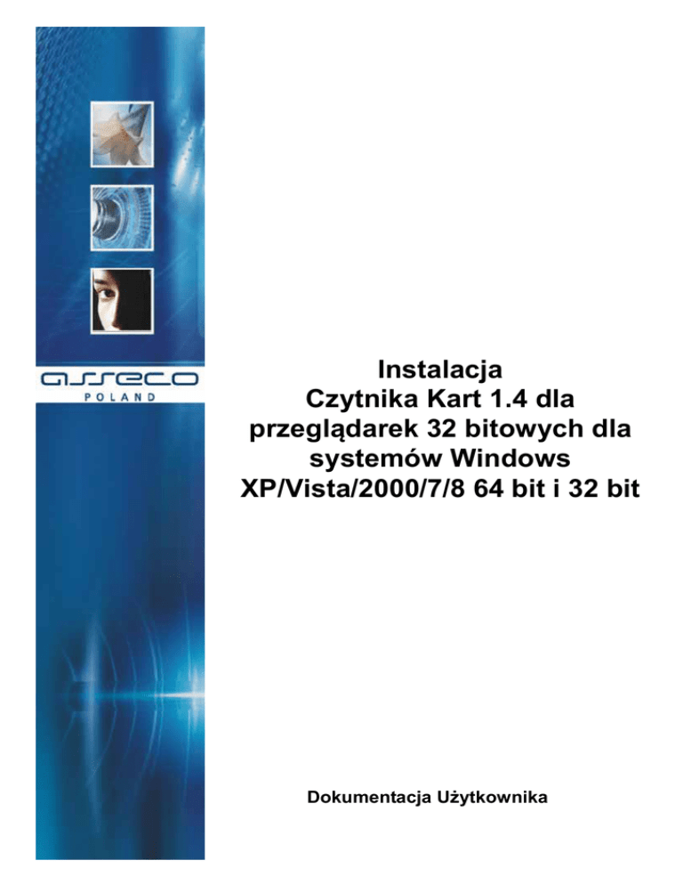 Instalacja Czytnika Kart 1.4 dla przeglądarek 32 bitowych dla systemów Windows XP/Vista/2000/7/8 64 bit i 32 bit Dokumentacja Użytkownika INSTALACJA CZYTNIKA KART DOKUMENTACJA UŻYTKOWNIKA SPIS TREŚCI I. INSTALACJA CZYTNIKA KART W SYSTEMIE WINDOWS ................................. 3 II. PONOWNA INSTALACJA CZYTNIKA W SYSTEMIE WINDOWS .................... 13 II. DEINSTALACJA CZYTNIKA W SYSTEMIE WINDOWS .................................... 18 III. UWAGI DO INSTALACJI CZYTNIKA KART W SYSTEMIE WINDOWS......... 20 2 INSTALACJA CZYTNIKA KART DOKUMENTACJA UŻYTKOWNIKA I. INSTALACJA CZYTNIKA KART W SYSTEMIE WINDOWS 1. Weryfikacja wersji przeglądarki Instalacja czytnika kart uzależniona jest od aplikacji wykorzystywanej przez Użytkownika. Aplikacja powinna być obsługiwana przy wykorzystaniu następujących przeglądarek (tylko wersje 32 bitowe): Microsoft Internet Explorer – w wersji 8.0 i wyższej. Mozilla Firefox w wersji 3.0 i wyższej Opera w wersji 8.0 i wyższej Przed rozpoczęciem procedury instalacji czytnika należy zweryfikować czy na komputerze docelowym znajduje się odpowiednia przeglądarka internetowa (pod względem programu i jego wersji). a) W przypadku przeglądarki Microsoft Internet Explorer informację tę możemy zweryfikować, wybierając menu Pomoc -> Internet Explorer – Informacje: Dla poprawnego działania apletu należy upewnić się, że przeglądarka ma zainstalowany komponent maszyny Javy: · JVM (Java Virtual Machine) - Uwaga! W systemie Microsoft Windows XP/Windows VISTA/Windows 7 Wirtualna Maszyna Javy została wycofana z instalacji systemu. Dlatego też należy dodatkowo zainstalować ten element. lub · JDK/JRE Sun'a (Java Development Kit/Java Runtime Enviroment) v1.x (należy pobrać najaktualniejszą wersję jaka dostępna jest na stronie producenta http://java.sun.com/). Uwaga!!Jeśli zainstalowana jest JDK/JRE Sun’a należy po każdym uaktualnieniu Javy ponownie zainstalować sterowniki czytnika. Z punktu widzenia prawidłowego funkcjonowania aplikacji ważne jest, by przeglądarka była zainstalowana i skonfigurowana zgodnie z wymaganiami aplikacji. Należy pamiętać, iż w przypadku 3 INSTALACJA CZYTNIKA KART DOKUMENTACJA UŻYTKOWNIKA tej przeglądarki konieczne jest włączenie Java Plug-in. b) W przypadku przeglądarki Mozilla Firefox informację tę możemy zweryfikować, wybierając menu Pomoc -> Informacje o programie Mozilla Firefox: c) W przypadku przeglądarki Opera informację tę możemy zweryfikować, wybierając menu Pomoc > O Operze: 4 INSTALACJA CZYTNIKA KART DOKUMENTACJA UŻYTKOWNIKA Uwaga! W przypadku wykorzystywania na tej samej jednostce komputerowej wspomnianych wyżej przeglądarek zalecane jest (w przypadku istnienia opcji, i jej wcześniejszego zaznaczenia) wyłączenie w Microsoft Internet Explorer (w opcji Narzędzia/Opcje Internetowe.../Zaawansowane opcji Java(Sun), Use Java 2 v1.4.0 for <applet>). Podłączenie czytnika kart Po przeprowadzeniu powyższej weryfikacji podłączamy do komputera czytnik kart. W przypadku zastosowania czytnika GemPCTwin (czytnik USB) w celu poprawnego działania czytnika należy wpiąć go w odpowiednie gniazdo zgodnie z dokumentacją producenta czytnika. 5 INSTALACJA CZYTNIKA KART DOKUMENTACJA UŻYTKOWNIKA Instalacja sterowników do czytnika kart W celu instalacji sterowników do czytnika kart należy kliknąć prawym klawiszem myszy na pliku setup.exe(plik ten znajduje się w katalogu z programem), a następnie wybrać w nowym oknie opcję „Uruchom jako administrator”. Po uruchomieniu instalatora sterowników pojawia się okno informacyjne potwierdzające rozpoczęcie procesu instalacji. W celu kontynuowania wspomnianego procesu, należy kliknąć na przycisk TAK. 6 INSTALACJA CZYTNIKA KART DOKUMENTACJA UŻYTKOWNIKA Uwaga! W przypadku systemu Windows 8, gdyby Filtr Windows SmartScreen uniemożliwił uruchomienie instalatora(screen poniżej), należy kliknąć na opcję „Więcej informacji”, a następnie kliknąć na link: „Uruchom mimo to”. 7 INSTALACJA CZYTNIKA KART DOKUMENTACJA UŻYTKOWNIKA następnie pojawi się kolejne okno „Kontrola konta użytkownika”, w którym należy kliknąć na przycisk „TAK”. W przypadku wymienionych wyżej wersji przeglądarek dla poprawnego działania czytnika kart należy wybrać składniki, które mają być zainstalowane: - zaznaczyć Sterowniki czytnika kart - dla przeglądarek z zainstalowaną JDK/JRE Sun'a – zaznaczyć Komponenty dla Sun Java Plug-in Następnie pojawi się kolejne okno programu instalacyjnego sterownika czytnika, w którym należy wybrać Next. 8 INSTALACJA CZYTNIKA KART DOKUMENTACJA UŻYTKOWNIKA Uwaga ! W przypadku próby instalacji czytnika przeznaczonego dla systemu 64 bitowego na system 32 otrzymamy następujący komunikat: W oknie z warunkami licencji należy wybrać I accept the terms in the License Agreement i nacisnąć przycisk Next. 9 INSTALACJA CZYTNIKA KART DOKUMENTACJA UŻYTKOWNIKA W oknie potwierdzającym gotowość do instalacji należy nacisnąć przycisk Install. W kolejnym oknie z informacją o zakończonej instalacji sterownika wybieramy przycisk Finish. 10 INSTALACJA CZYTNIKA KART DOKUMENTACJA UŻYTKOWNIKA Po poprawnie przeprowadzonym procesie instalacji obok instalowanych komponentów pojawia się napis OK. W przypadku pojawienia się innych komunikatów istnieje możliwość oglądnięcia szczegółów związanych z tymi komunikatami (przycisk Szczegóły>>). W celu kontynuowania procesu instalacji należy kliknąć przycisk Zamknij. 11 INSTALACJA CZYTNIKA KART DOKUMENTACJA UŻYTKOWNIKA Poprawne zakończenie instalacji komunikowane jest oknem dialogowym postaci: W celu rozpoczęcia pracy z czytnikiem należy zrestartować komputer. Weryfikacja poprawności instalacji czytnika Kart W celu weryfikacji poprawności instalacji czytnika kart należy sprawdzić czy w Panelu sterowania w module System w zakładce Czytnik Kart Inteligentnych pojawiło się stosowne urządzenie (oraz czy nie jest 