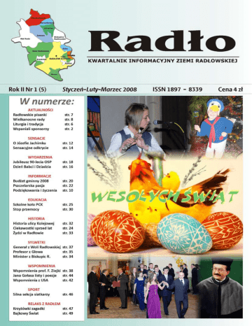 Szanowni Drodzy Czytelnicy! Rozpoczynamy drugi rok naszej lokalnej działalności wydawniczej. Jesteśmy umocnieni wieloma życzliwymi kontaktami z radłowianami; tymi mieszkającymi na terenie gminy, i tymi, których los rzucił w różne części kraju i świata, a przede wszystkim na kontynent amerykański. Wiele trudności przychodzi nam pokonywać, zważywszy, że praca nad czasopismem odbywa się obok naszego zasadniczego, bibliotekarskiego zajęcia. Jednak wysiłek ten rekompensuje nam ogromna satysfakcja. Mile zaskoczeni jesteśmy licznymi deklaracjami pomocy w redagowaniu pisma. W ostatnim numerze kwartalnika marzyliśmy o współpracy z Polonią i spotkaliśmy się z natychmiastowym odzewem ze strony: państwa Anny i Stanisława Szczepaników (Radłów), Bogusławy (z d. Gołas) i Mieczysława Celarek (USA), Krystiana i Agnieszki Sygnarowiczów (Radłów), Teresy i Stanisława Gębisiów (Przybysławice), Edwarda Smolenia (Radłów), Przemysława Delunga (Radłów), Zofii Szczypty (USA), (długoletniej profesorki LO w Radłowie) i wielu życzliwych nam rodaków. Wszyscy pragną pomóc i utwierdzają nas w przekonaniu, że warto pismo wydawać i rozwijać. Ta życzliwość i solidarność tak mile nas zaskakuje, że podwaja się w nas energia do dalszej, bardziej wytężonej pracy. Państwo pokazują nam, że lokalny patriotyzm nie jest pustym słowem, że od wszystkich radłowian zależy jak będzie postrzegana nasza mała, naddunajecka Ojczyzna. Za to wszystko, wszystkim składamy najpiękniejsze podziękowania. Odkrywamy w dalszym ciągu wspaniałą, często zaskakującą i sensacyjną lokalną historię. W obecnym numerze przedstawiamy sylwetkę Józefa Nasiadki, drugiego generała pochodzącego z naszej gminy. Zamieszczamy wspomnienia prof. Franciszka Ziejki; po raz pierwszy, w tak szczery i sentymentalny sposób, ukazują one związki profesora z rodzinnym Radłowem. Przytaczamy sylwetkę naukowca, prof. Franciszka Kluzy z Glowa, przesympatycznego rodaka, który ilekroć zagląda do Radłowa zawsze odwiedza bibliotekę i przekazuje wartościowe publikacje. Piszemy o Janie Dąb-Kociole, ministrze z Biskupic Radłowskich, o wspaniałych pisankach autorstwa Anny Mleczko z Radłowa. Wracamy do uroczo pięknych listów i poezji Jana Gołasa z lat II wojny światowej, wierszowanych wspomnień Zofii Szczypty z USA. Zamieszczamy niepublikowane dotąd fotografie i sensacyjne informacje o Józefie Jachimku i jego oddziale AK, o odkryciu unikatowych dokumentów z lat okupacji dotyczących działalności radłowskiej placówki AK „Róża”. Po raz pierwszy publikujemy fotografię radłowskiego notariusza z lat międzywojennych Wita Juzkiewicza. Informujemy też o zacnym jubileuszu 90-lecia Ochotniczej Straży Pożarnej w Biskupicach Radłowskich, prezentujemy budżet gminy na rok 2008. Historyczne tematy okraszamy informacjami o wydarzeniach z I kwartału 2008 r. Są wśród nich tak miłe uroczystości, jak Dni Babci i Dziadzia organizowane przez szkoły; ileż wzruszeń i radości dostarczyły one starszym osobom z naszej społeczności. Na zakończenie świątecznego wydania „Radła”, zamieszczamy krzyżówkę dla dorosłych oraz wielkanocną zagadkę dla dzieci z nagrodami ufundowanymi przez p. Stanisławę i Andrzeja Kijaków z Woli Radłowskiej. Życzymy miłej lektury i dalszej tak sympatycznej współpracy w odkrywaniu piękna i bogactwa ziemi radłowskiej. Zbigniew Marcinkowski, red. nacz. Czytelnikom, Mieszkańcom gminy, Rodakom rozsianym po świecie Najserdeczniejsze życzenia szczęśliwych, pełnych radości Świąt Wielkiej Nocy, Spełnienia najskrytszych pragnień oraz wszelkiej obfitości Składa Redakcja Kwartalnika „Radło” RADŁO Nr 1/2008 Głos czytelników + LISTY DO REDAKCJI + LISTY DO REDAKCJI + LISTY DO REDAKCJI + LISTY DO REDAKCJI + LISTY DO REDAKCJI + Czyta go moja rodzina… Pragnę podziękować Państwu za zainteresowanie się moim tekstem: „Moje wspomnienia z lat dziecinnych” i zamieszczenie go w świątecznym numerze „Radła”. Z ciekawością i satysfakcją czytam ten numer. Czyta go również moja rodzina. Moje pokolenie, które przeżyło ciężkie lata wojny i okupacji, chętnie wraca do wspomnień z tamtego okresu. Ludzie młodsi, młodzież i dzieci również znajdą w tym czasopiśmie to, co ich zainteresuje. Dla każdego coś ciekawego. Okazuje się, że „Radło” dociera coraz dalej w kraju i za granicą. Świadczą o tym listy przesyłane do redakcji. Przesyłam serdeczne życzenia dla całego zespołu redakcyjnego i pozdrawiam wszystkich, którzy piszą ciekawe artykuły i listy. Mam nadzieję, że kiedyś będę miała okazję odwiedzić bibliotekę w Radłowie. Z szacunkiem Janina Pylak (Patulska) Lubartów 15.01.2008 r. Przecież to moja koleżanka! Czytam kolejny numer Waszego a właściwie naszego czasopisma dzięki uprzejmości pana Marcinkowskiego, który przysyła nam do Bielska-Białej kilka egzemplarzy pocztą. Proszę Redakcję o przemyślenie sprawy regularnej prenumeraty, bo chyba wielu jest już stałych czytelników. Uprościłoby to również sprawę płatności, tylko konieczne jest konto bankowe! Głównym tematem, który chcę poruszyć to wzruszenie, jakie mnie ogarnia, gdy w każdym prawie numerze pojawia się Ktoś, kogo znałam przed laty, a potem ślad po Nim zaginął. Ileż to razy wspominałam swoje koleżanki i kolegów z radłowskiej szkoły podstawowej, z liceum, myśląc, co też się z nimi teraz dzieje. I oto proszę, w trzecim numerze Radła widzę zdjęcie i czytam notatkę o pani Janinie Norek z USA. Przecież to moja koleżanka ze szkolnej ławy - Nina Falińska! Byłyśmy sobie dość bliskie. Odwiedzałam Ją w domu, w przedwojennej willi naprzeciwko dzisiejszego urzędu gminy. Na parterze był męski zakład fryzjerski Jej ojca, na piętrze ich mieszkanie i damski zakład fryzjerski Jej mamy. W numerze czwartym kilka niespodzianek. Po pierwsze: siostry Gołasówny z Zakościela. Star