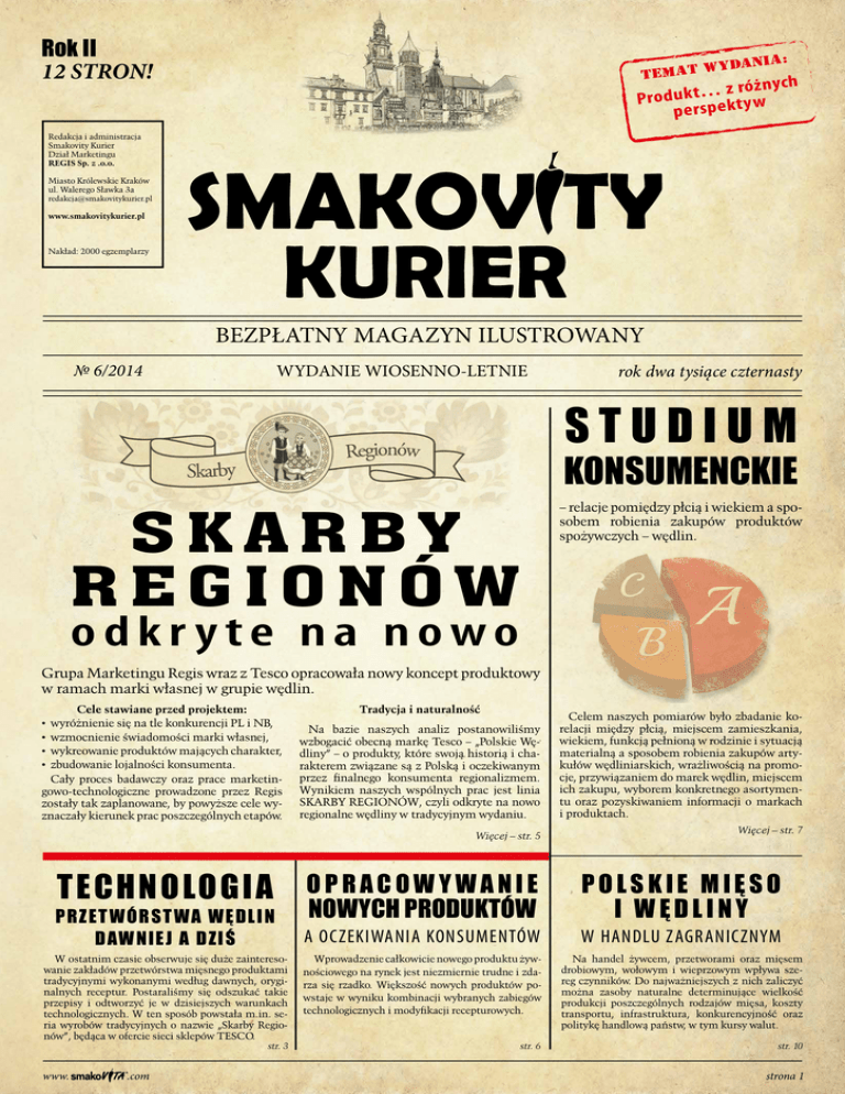 Rok II 12 STRON! ia: Wydan TEMAT ż n yc h ó r z … t k Produ w perspekty Redakcja i administracja Smakovity Kurier Dział Marketingu REGIS Sp. z .o.o. Miasto Królewskie Kraków ul. Walerego Sławka 3a [email protected] www.smakovitykurier.pl Nakład: 2000 egzemplarzy BEZPŁATNY MAGAZYN ILUSTROWANY № 6/2014 WYDANIE WIOSENNO-LETNIE rok dwa tysiące czternasty STUDIUM KONSUMENCKIE SKARBY REGIONÓW – relacje pomiędzy płcią i wiekiem a sposobem robienia zakupów produktów spożywczych – wędlin. odkr yte na nowo Grupa Marketingu Regis wraz z Tesco opracowała nowy koncept produktowy w ramach marki własnej w grupie wędlin. Cele stawiane przed projektem: • wyróżnienie się na tle konkurencji PL i NB, • wzmocnienie świadomości marki własnej, • wykreowanie produktów mających charakter, • zbudowanie lojalności konsumenta. Cały proces badawczy oraz prace marketingowo-technologiczne prowadzone przez Regis zostały tak zaplanowane, by powyższe cele wyznaczały kierunek prac poszczególnych etapów. Tradycja i naturalność Na bazie naszych analiz postanowiliśmy wzbogacić obecną markę Tesco – „Polskie Wędliny” – o produkty, które swoją historią i charakterem związane są z Polską i oczekiwanym przez finalnego konsumenta regionalizmem. Wynikiem naszych wspólnych prac jest linia SKARBY REGIONÓW, czyli odkryte na nowo regionalne wędliny w tradycyjnym wydaniu. Więcej – str. 5 TEC H NO LO G I A P R Z ET W Ó RST WA W Ę D L I N DAW NIEJ A D Z IŚ W ostatnim czasie obserwuje się duże zainteresowanie zakładów przetwórstwa mięsnego produktami tradycyjnymi wykonanymi według dawnych, oryginalnych receptur. Postaraliśmy się odszukać takie przepisy i odtworzyć je w dzisiejszych warunkach technologicznych. W ten sposób powstała m.in. seria wyrobów tradycyjnych o nazwie „Skarby Regionów”, będąca w ofercie sieci sklepów TESCO. str. 3 www. .com OPRACOWYWANIE NOWYCH PRODUKTÓW Celem naszych pomiarów było zbadanie korelacji między płcią, miejscem zamieszkania, wiekiem, funkcją pełnioną w rodzinie i sytuacją materialną a sposobem robienia zakupów artykułów wędliniarskich, wrażliwością na promocje, przywiązaniem do marek wędlin, miejscem ich zakupu, wyborem konkretnego asortymentu oraz pozyskiwaniem informacji o markach i produktach. Więcej – str. 7 POLSKIE MIĘSO I WĘDLINY A OCZEKIWANIA KONSUMENTÓW W HANDLU ZAGRANICZNYM Wprowadzenie całkowicie nowego produktu żywnościowego na rynek jest niezmiernie trudne i zdarza się rzadko. Większość nowych produktów powstaje w wyniku kombinacji wybranych zabiegów technologicznych i modyfikacji recepturowych. Na handel żywcem, przetworami oraz mięsem drobiowym, wołowym i wieprzowym wpływa szereg czynników. Do najważniejszych z nich zaliczyć można zasoby naturalne determinujące wielkość produkcji poszczególnych rodzajów mięsa, koszty transportu, infrastruktura, konkurencyjność oraz politykę handlową państw, w tym kursy walut. str. 6 str. 10 strona 1 H I S T O R I A rzeźnictwa i wędliniarstwa w Polsce Mięso od zawsze było jedną z podstawowych grup żywności. Jego wartość jest określona ilością zawartego w nim białka, a także tłuszczu, który również był bardzo ceniony. Dziś wiemy, że ten pierwszy składnik jest niezastąpionym budulcem, a drugi źródłem energii. Początkowo pozyskiwano je z upolowanych zwierząt. Dopiero w III tysiącleciu p.n.e. rozpoczęto na ziemiach polskich uprawy rolne i podjęto hodowle zwierząt gospodarskich, które później stały się przedmiotem handlu lub wymiany. Z tego punktu widzenia rozwój gospodarki mięsnej można podzielić na dwa okresy: • okres gospodarki naturalnej, • okres gospodarki towarowej. • Pierwszy ginie w mrokach dziejowych, drugi, trwający do dziś, jest częścią historii nowożytnej. • Z punktu widzenia organizacji gospodarki mięsnej można wyróżnić trzy fazy rozwojowe: • okres przedcechowy – do 1175 r., • okres przetworzenia z typową organizacją cechów (lata 1175-1912), • okres rozwoju przemysłu mięsnego, dzielący się na dwa podokresy, tj. lata 1912-1945 (dominacja rzemiosła) i po roku 1945 (przewaga przemysłu). Przełom technologiczny i działalność cechów Dawne wyposażenie rzeźni cechowych i warunki higieniczne uboju oraz przetwarzania daleko odbiegały od dzisiejszych wymogów. Urzędowy oryginał inwentarza poznańskiej rzeźni cechowej z 1889 r. podawał następujące pozycje: dwa koryta do oparzania świń (tusz świńskich), trzy nosidła wody, dwa kotły do podgrzewania wody, osiem wind przyściennych z łańcuchami do pionizacji tusz, dwa stoły, dwie siekiery i dwie łopaty. Niedostatki w zakresie higieny były spowodowane brakiem ujęć wodnych. W 1924 r. dwie rzeźnie publiczne w województwie nowogrodzkim, a po jednej w poleskim i wołyńskim były zaopatrzone w wodę wodociągową. Do XIX w. procentowy udział trzody chlewnej był mniejszy niż obecnie, a stan ten zmienił się wskutek rozpowszechnienia się uprawy ziemniaków i buraków ćwikłowych. Koniec XIX w. to początek powstania dużych rzeźni miejskich, których zaistnienie było możliwe dzięki wynalezieniu chłodziarki sprężynowej. Do budowy takich zakładów, przyczynił się ogromny postęp nauki w zakresie dziedzin przyrodniczych, technicznych oraz udogodnień w zakresie techniki i technologii przetwarzania surowców mięsnych. Na uwagę zasługują następujące wynalazki: • 1810 r. – termiczne utrwalanie żywności, • 1818 r. – puszka z blachy ocynkowanej, • 1820 r. – pierwsza wytwórnia konserw, • 1855 r. – peklowanie dotętnicze, • 1865 r. – sztuczne osłonki, • 1868 r. – puszka z blachy lakierowanej białej, • 1874 r. – autoklaw parowy, • 1878 r. – początek nowoczesnej higieny mięsa, • 1902 r. – elektryczne oszałamianie zwierząt, • 1905 r. – zastosowanie azotanu do peklowania. Istotnym faktem w rozwoju przemysłu mi